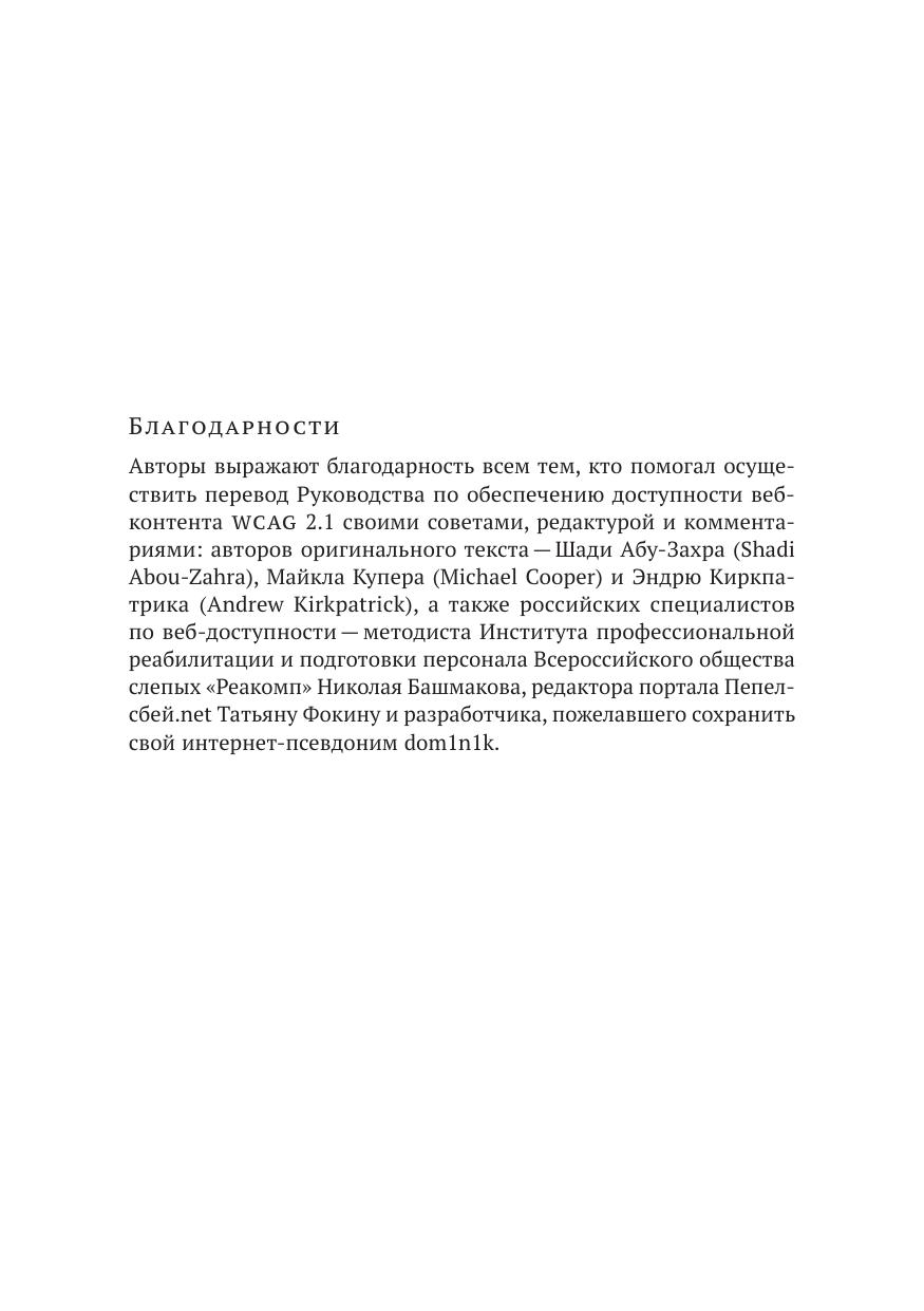 В приложении содержится авторский перевод Руководства по обеспечению доступности веб-контента WCAG 2.1 (Web Content Accessibility Guidelines (WCAG 2.1)) Консорциума всемирной паутины, являющегося самым значимым международным документом в области доступности веб-ресурсов в мире в настоящее время.