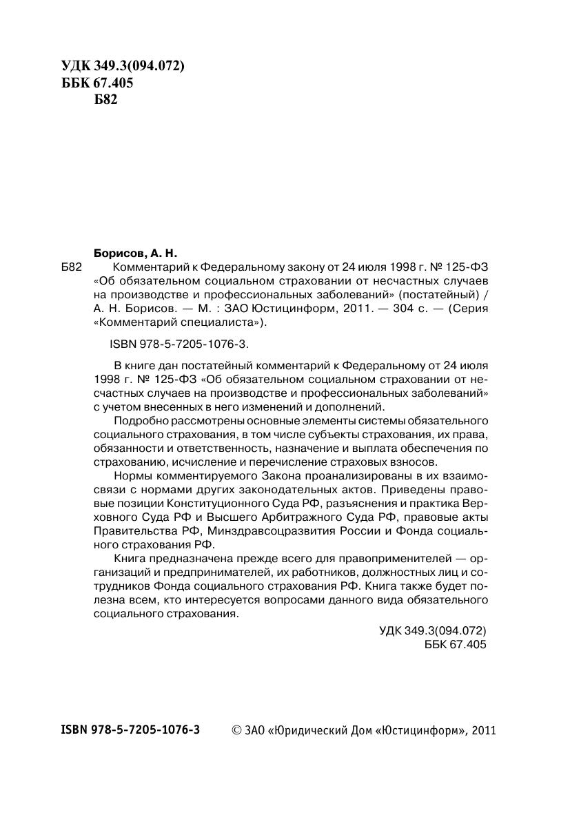 В книге дан постатейный комментарий к Федеральному от 24 июля 1998 г. № 125-ФЗ «Об обязательном социальном страховании от несчастных случаев на производстве и профессиональных заболеваний» с учетом внесенных в него изменений и дополнений. Подробно рассмотрены основные элементы системы обязательного социального страхования, в том числе субъекты страхования, их права, обязанности и ответственность, назначение и выплата обеспечения по страхованию, исчисление и перечисление страховых взносов. Нормы комментируемого Закона проанализированы в их взаимосвязи с нормами других законодательных актов. Приведены правовые позиции Конституционного Суда РФ, разъяснения и практика Верховного Суда РФ и Высшего Арбитражного Суда РФ, правовые акты Правительства РФ, Минздравсоцразвития России и Фонда социального страхования РФ.Книга предназначена прежде всего для правоприменителей — организаций и предпринимателей, их работников, должностных лиц и сотрудников Фонда социального страхования РФ. Книга также будет полезна всем, кто интересуется вопросами данного вида обязательного социального страхования.