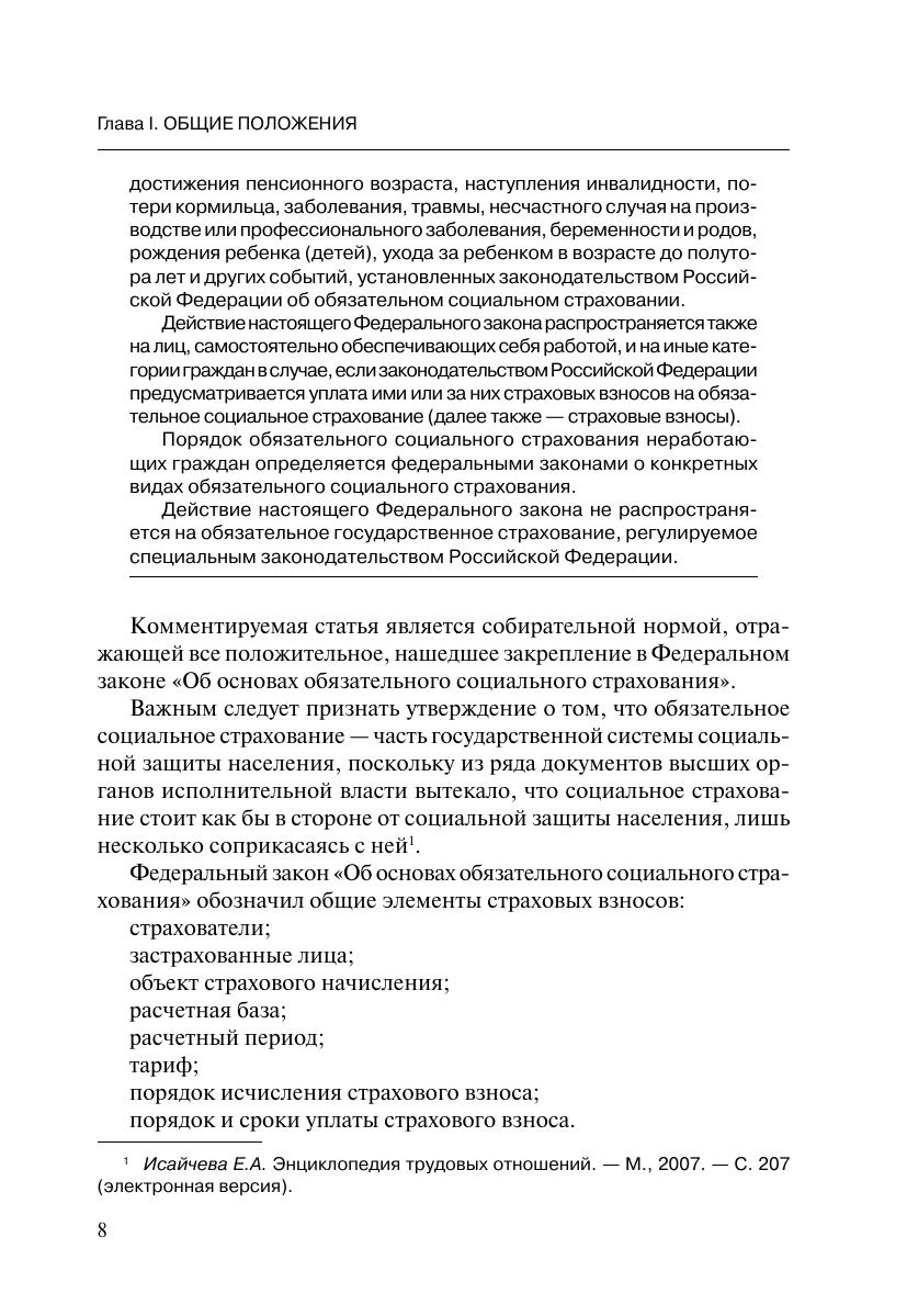 В постатейном комментарии к Федеральному закону «Об основах обязательного социального страхования», введенному в действие с 19 июля 1999 г., на основе действующего законодательства, с учетом тенденций нового Федерального закона от 24 июля 2009 г. № 212-ФЗ «О страховых взносах в Пенсионный фонд Российской Федерации, Фонд социального страхования Российской Федерации, Федеральный фонд обязательного медицинского страхования и территориальные фонды обязательного медицинского страхования», сфера действия которого, не распространяется на взносы на обязательное страхование от несчастных случаев на производстве и профзаболеваний, а также на обязательное медицинское страхование неработающего населения, уплата которых регулируется специальными федеральными законами, автор освещает вопросы юридической природы страховых взносов, подлежащих уплате в Пенсионный фонд РФ, Фонд обязательного социального страхования РФ и территориальные фонды обязательного медицинского страхования судебного порядка взыскания задолженности по страховым взносам и пени взыскания финансовых санкций за неуплату страховых взносов реализации субъективных прав и обязанностей государственного внебюджетного фонда, правопонимания страховых взносов градации их плательщиков и элементов юридической конструкции.Издание рассчитано на научных работников – юристов, преподавателей, аспирантов и студентов юридических вузов. Работа может быть полезной также для судей и работников государственных внебюджетных фондов Российской Федерации.Текст Федерального закона «Об основах обязательного социального страхования» приводится по состоянию на 24 июля 2009 г.