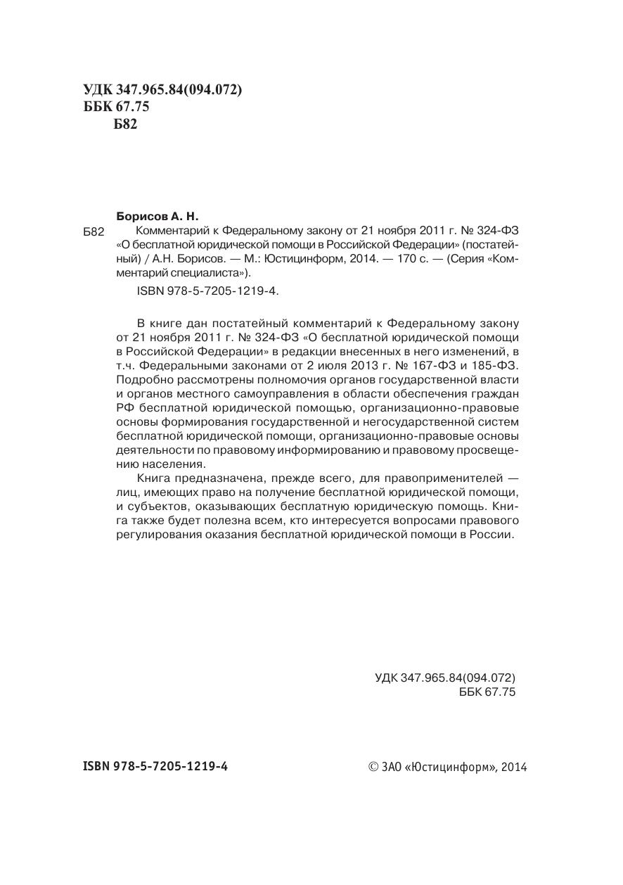 В книге дан постатейный комментарий к федеральному закону от 21 ноября 2011 г. № 324-фЗ «о бесплатной юридической помощи в российской федерации» в редакции внесенных в него изменений, в т.ч. федеральными законами от 2 июля 2013 г. № 167-фЗ и 185-фЗ. Подробно рассмотрены полномочия органов государственной власти и органов местного самоуправления в области обеспечения граждан рф бесплатной юридической помощью, организационно-правовые основы формирования государственной и негосударственной систем бесплатной юридической помощи, организационно-правовые основы деятельности по правовому информированию и правовому просвещению населения. Книга предназначена, прежде всего, для правоприменителей - лиц, имеющих право на получение бесплатной юридической помощи, и субъектов, оказывающих бесплатную юридическую помощь. Книга также будет полезна всем, кто интересуется вопросами правового регулирования оказания бесплатной юридической помощи в россии