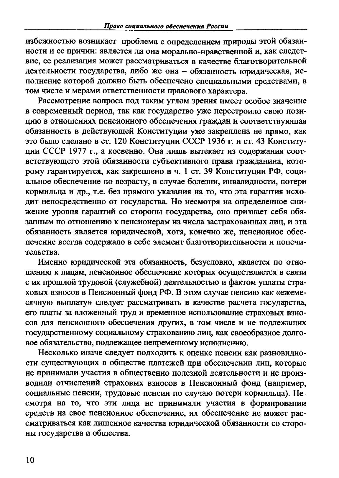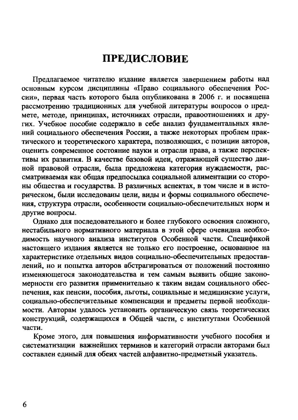 Настоящая работа является продолжением учебного пособия и посвящена анализу основных институтов Особенной части права социального обеспечения России. В ней с учетом достижений современной научной мысли и на основе действующего законодательства РФ (по состоянию на 1 октября 2009 г.) освещаются вопросы структуры Особенной части, специфика регламентации отношений по предоставлению пенсий, пособий, социальных и медицинских услуг, социальнообеспечительных льгот, компенсаций и предметов первой необходимости. Кроме этого, исследуются некоторые проблемы правоприменения, теоретические аспекты развития указанных институтов и направления совершенствования правового регулирования в этой сфере. Авторы выражают надежду, что настоящее издание будет полезно для студентов, аспирантов, магистрантов, преподавателей юридических факультетов и вузов, специалистов в других областях знаний (социологии, экономики, психологии, медицины и др.), работников системы социального обеспечения населения, практикующих юристов, а также для граждан, интересующихся состоянием правового регулирования в данной сфере.