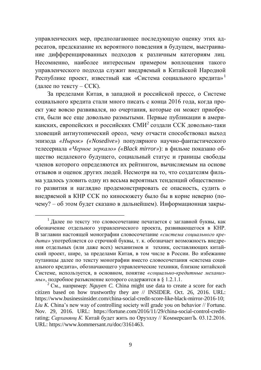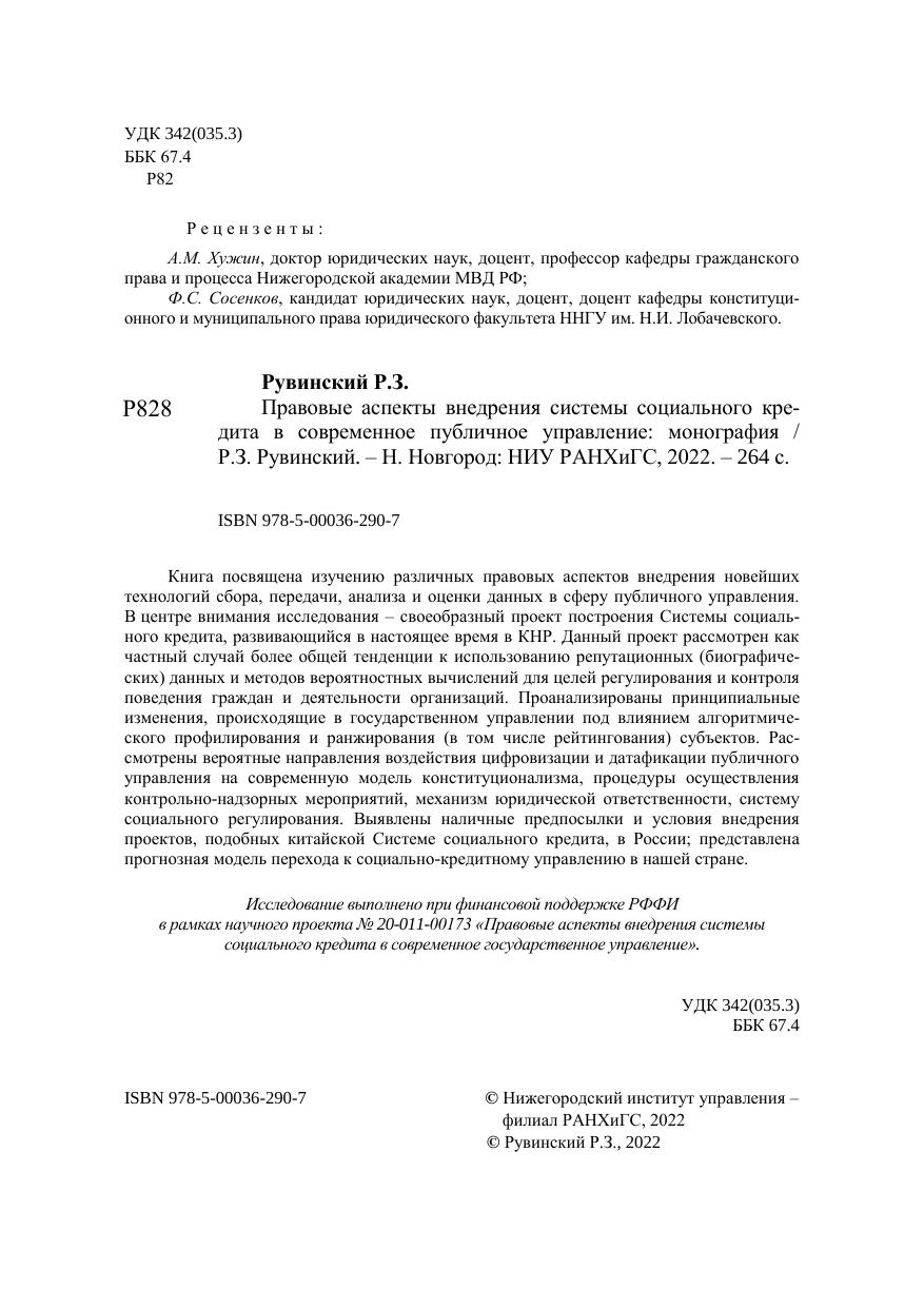 Книга посвящена изучению различных правовых аспектов внедрения новейших технологий сбора, передачи, анализа и оценки данных в сферу публичного управления. В центре внимания исследования – своеобразный проект построения Системы социального кредита, развивающийся в настоящее время в КНР. Данный проект рассмотрен как частный случай более общей тенденции к использованию репутационных (биографических) данных и методов вероятностных вычислений для целей регулирования и контроля поведения граждан и деятельности организаций. Проанализированы принципиальные изменения, происходящие в государственном управлении под влиянием алгоритмического профилирования и ранжирования (в том числе рейтингования) субъектов. Рассмотрены вероятные направления воздействия цифровизации и датафикации публичного управления на современную модель конституционализма, процедуры осуществления контрольно-надзорных мероприятий, механизм юридической ответственности, систему социального регулирования. Выявлены наличные предпосылки и условия внедрения проектов, подобных китайской Системе социального кредита, в России; представлена прогнозная модель перехода к социально-кредитному управлению в нашей стране.