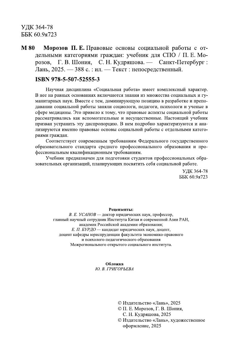 Научная дисциплина «Социальная работа» имеет комплексный характер. В нее на равных основаниях включаются знания из множества социальных и гуманитарных наук. Вместе с тем, доминирующую позицию в разработке и преподавании социальной работы заняли социологи, педагоги, психологи и ученые в сфере медицины. Это привело к тому, что правовые аспекты социальной работы рассматривались как вспомогательные и несущественные. Настоящий учебник призван устранить эту диспропорцию. В нем подробно характеризуются и анализируются именно правовые основы социальной работы с отдельными категориями граждан. Соответствует современным требованиям Федерального государственного образовательного стандарта среднего профессионального образования и профессиональным квалификационным требованиям. Учебник предназначен для подготовки студентов профессиональных образовательных организаций, планирующих посвятить себя социальной работе.