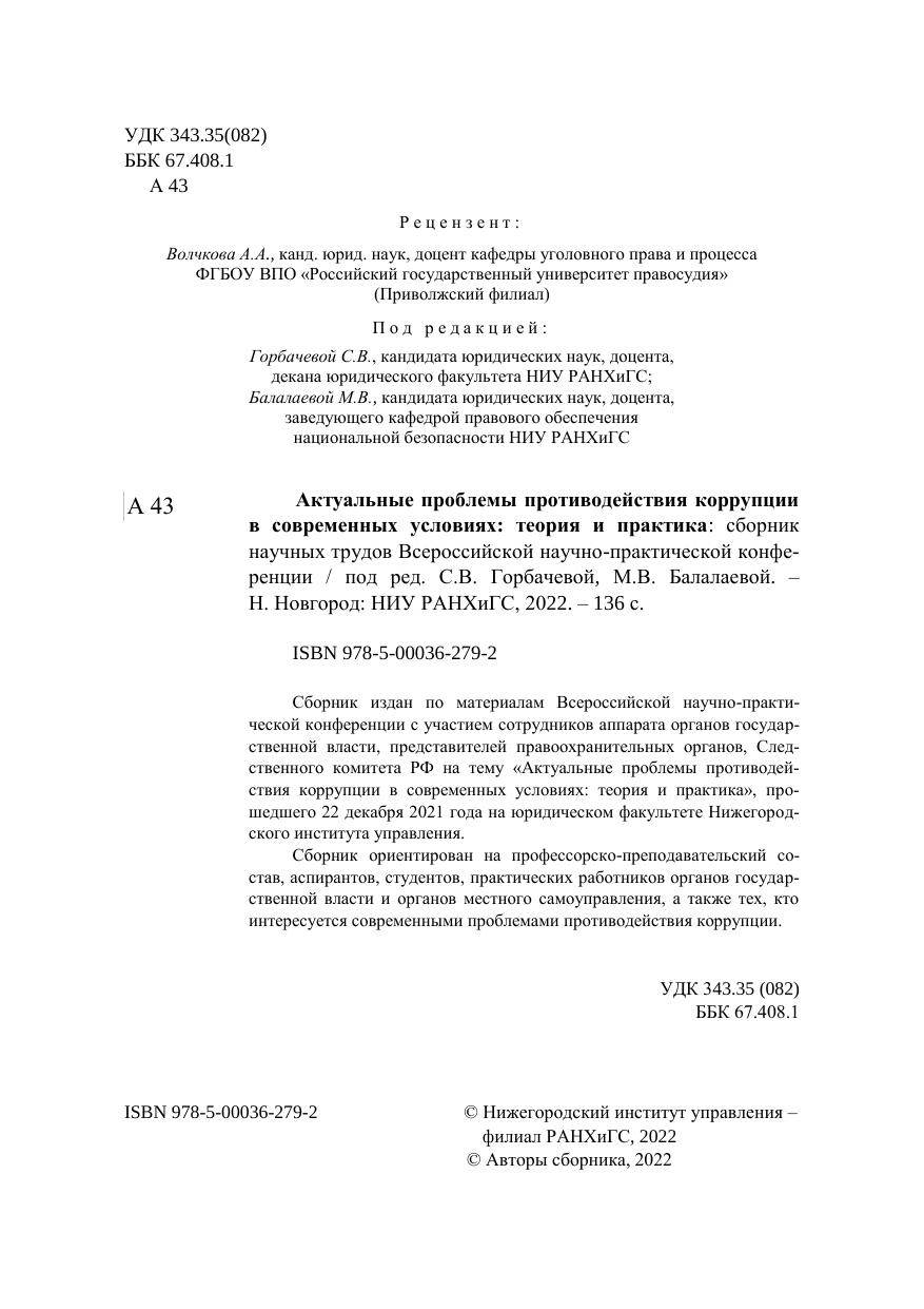 Сборник издан по материалам Всероссийской научно-практической конференции с участием сотрудников аппарата органов государственной власти, представителей правоохранительных органов, Следственного комитета РФ на тему «Актуальные проблемы противодействия коррупции в современных условиях: теория и практика», прошедшего 22 декабря 2021 года на юридическом факультете Нижегородского института управления. Сборник ориентирован на профессорско-преподавательский состав, аспирантов, студентов, практических работников органов государственной власти и органов местного самоуправления, а также тех, кто интересуется современными проблемами противодействия коррупции.