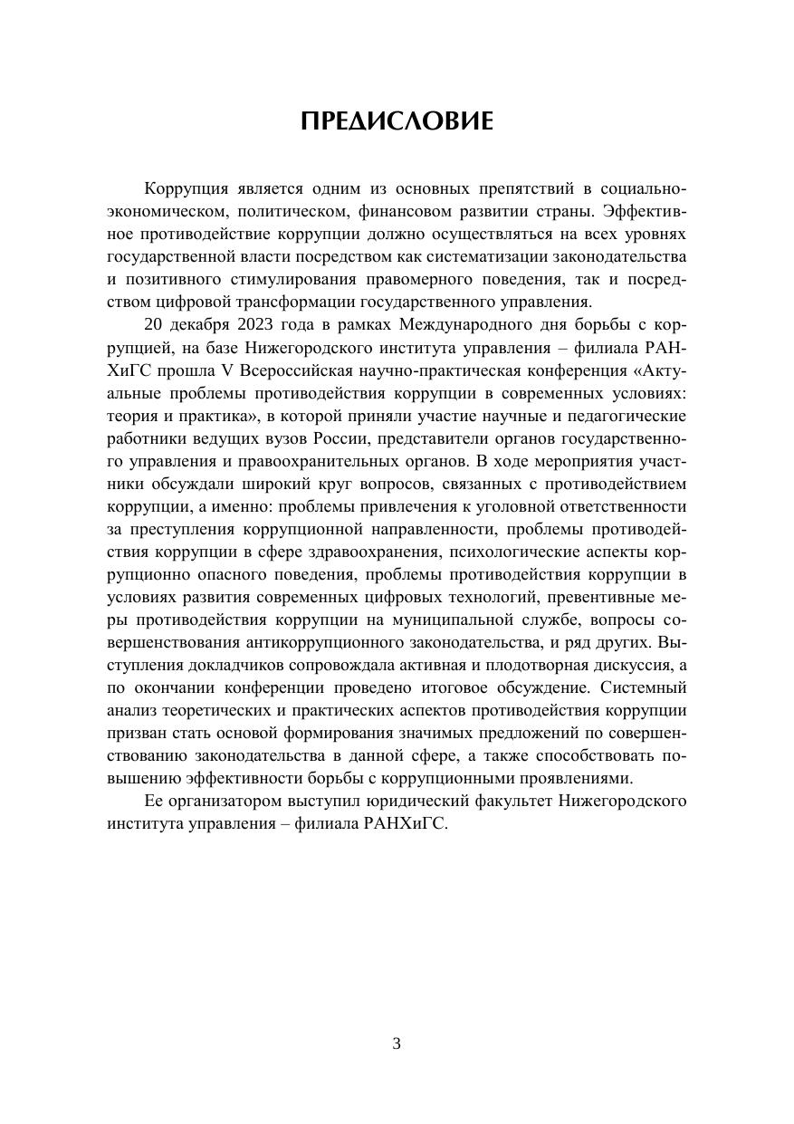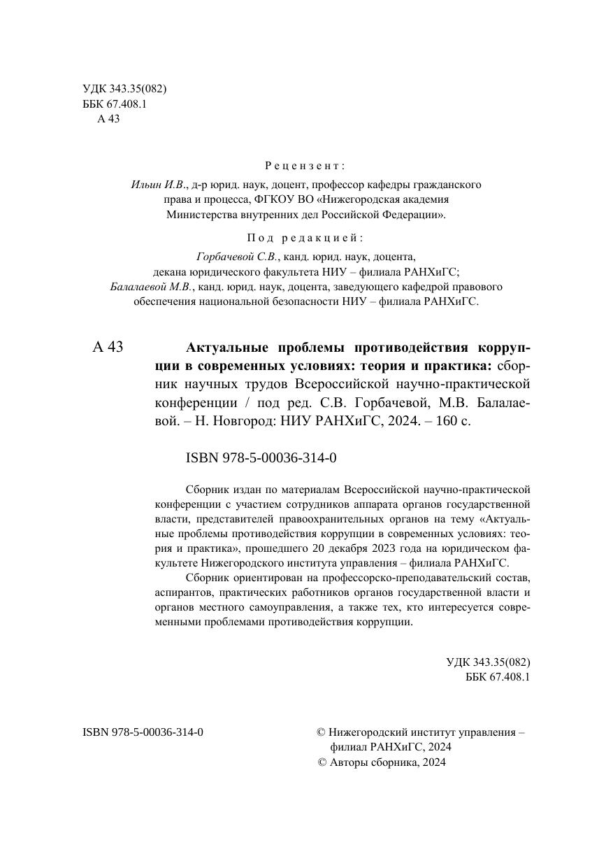 Сборник издан по материалам Всероссийской научно-практической конференции с участием сотрудников аппарата органов государственной власти, представителей правоохранительных органов на тему «Актуальные проблемы противодействия коррупции в современных условиях: теория и практика», прошедшего 20 декабря 2023 года на юридическом факультете Нижегородского института управления – филиала РАНХиГС. Сборник ориентирован на профессорско-преподавательский состав, аспирантов, практических работников органов государственной власти и органов местного самоуправления, а также тех, кто интересуется современными проблемами противодействия коррупции.