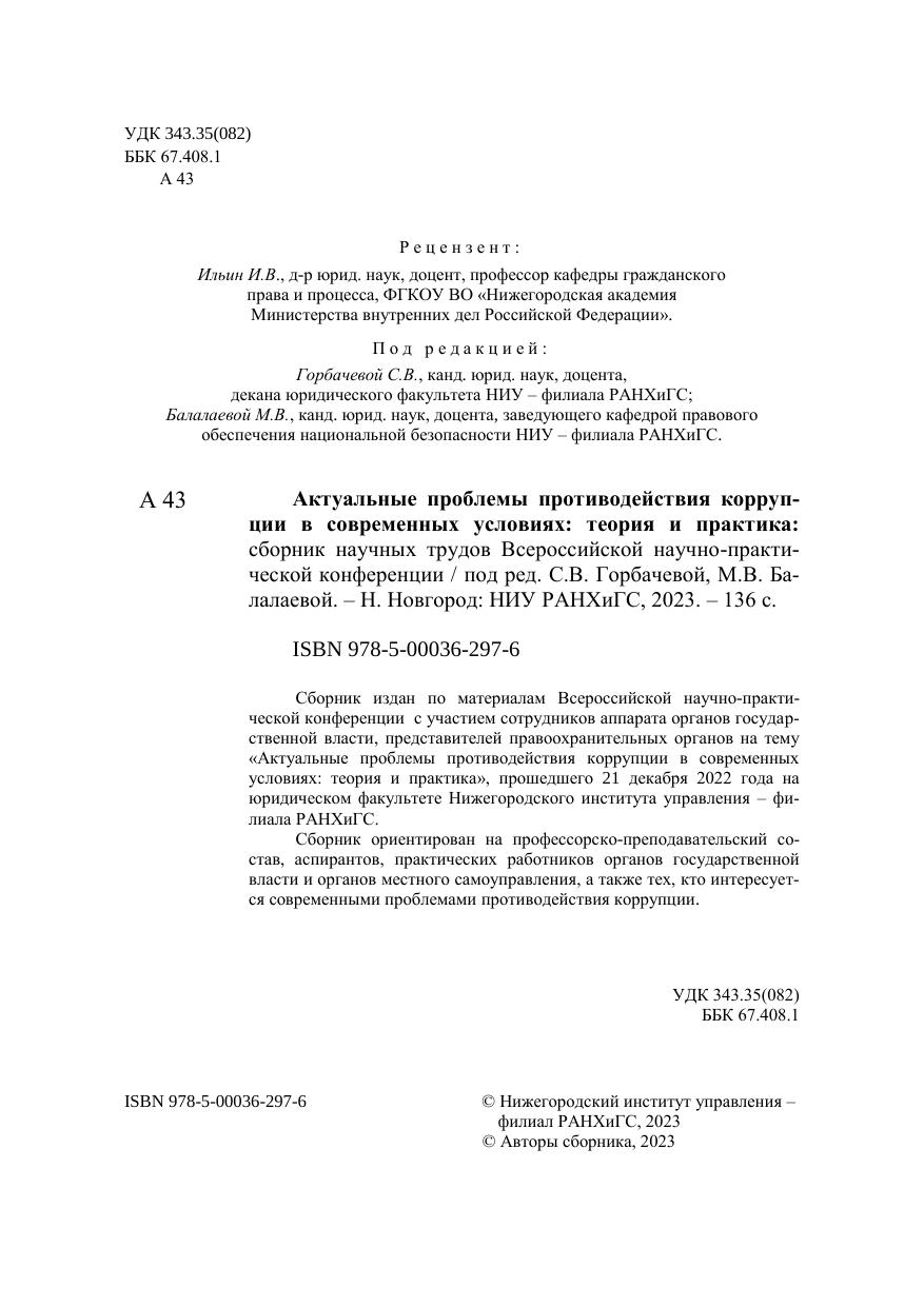 Сборник издан по материалам Всероссийской научно-практической конференции с участием сотрудников аппарата органов государственной власти, представителей правоохранительных органов на тему «Актуальные проблемы противодействия коррупции в современных условиях: теория и практика», прошедшего 21 декабря 2022 года на юридическом факультете Нижегородского института управления – филиала РАНХиГС. Сборник ориентирован на профессорско-преподавательский состав, аспирантов, практических работников органов государственной власти и органов местного самоуправления, а также тех, кто интересуется современными проблемами противодействия коррупции.