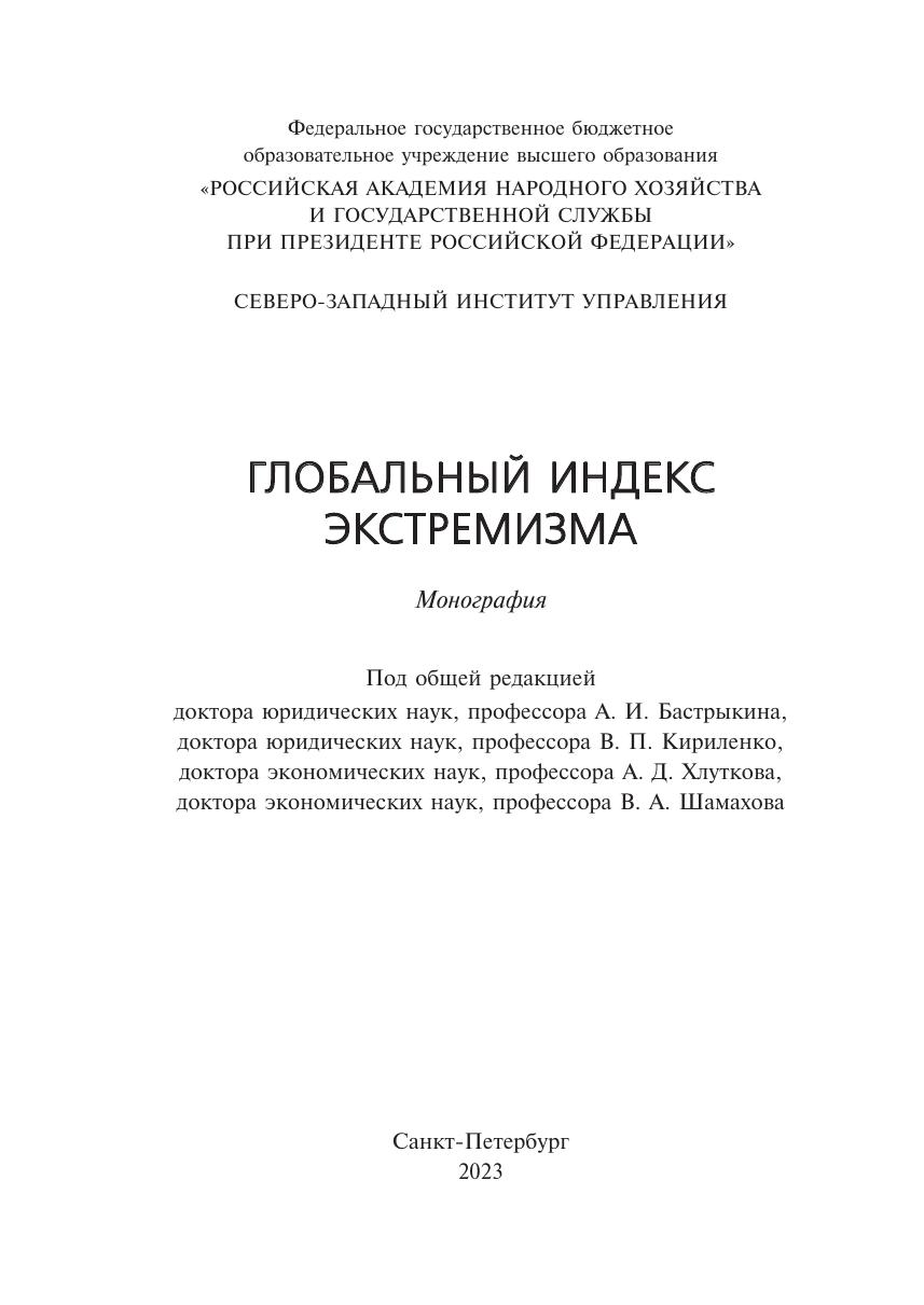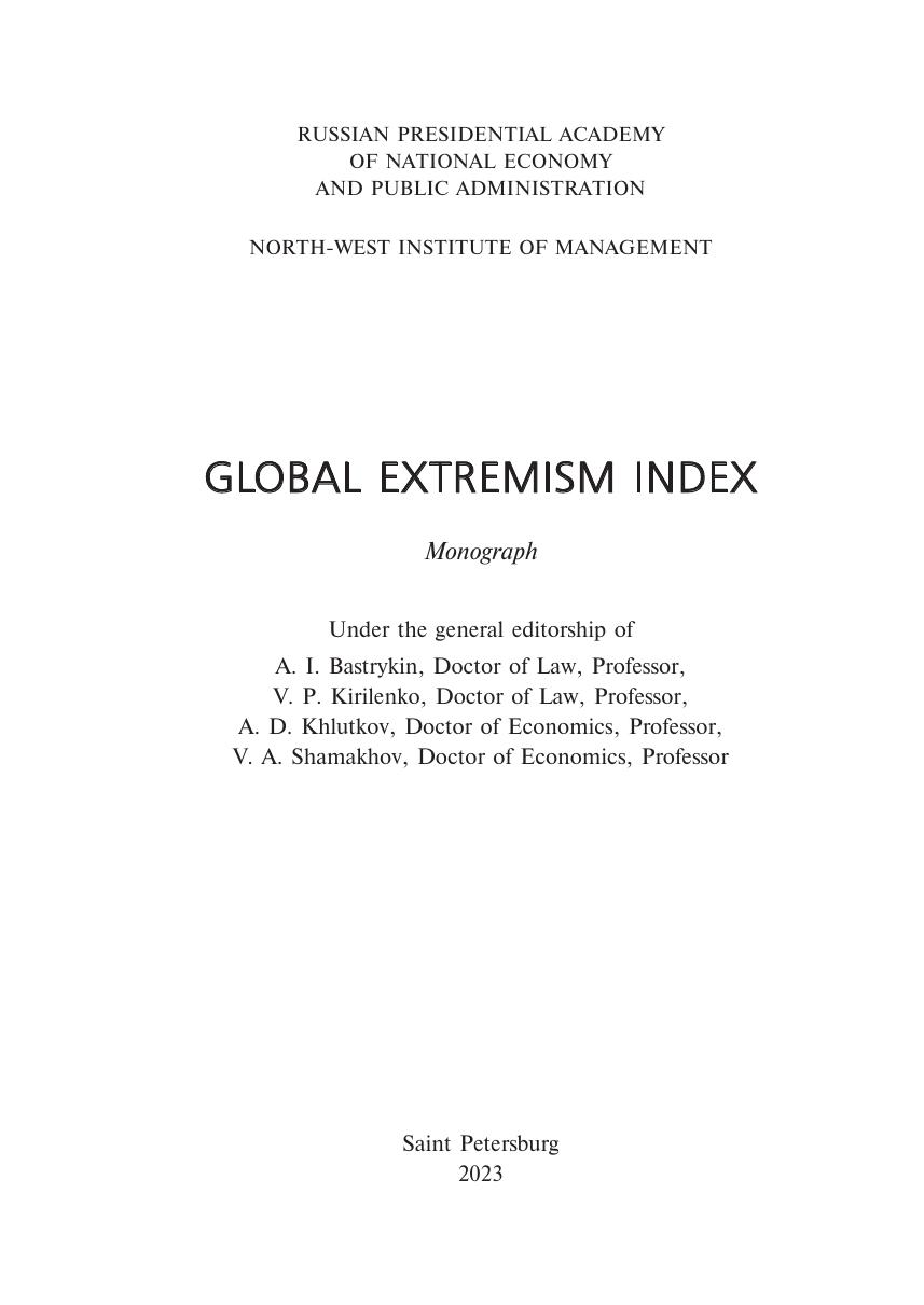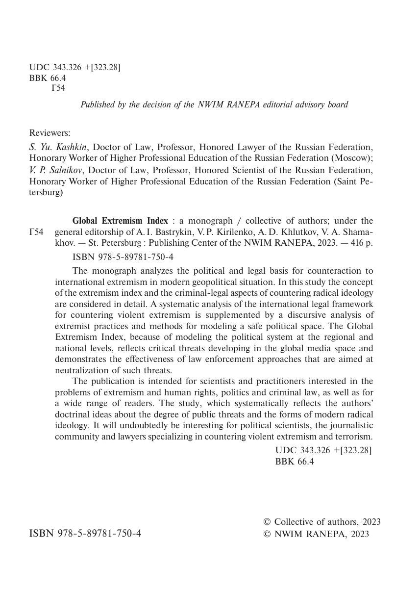 В монографии проанализирована политико-правовая основа борьбы с международным экстремизмом в современных геополитических условиях. Подробно рассмотрены понятие индекса экстремизма и уголовно-правовые аспекты противодействия радикальной идеологии. Системный анализ международно-правовой основы противодействия насильственному экстремизму дополнен дискурсивным анализом экстремистских практик и методиками моделирования безопасного политического пространства. Глобальный индекс экстремизма как результат моделирования политической системы на региональном и национальном уровнях отражает критические угрозы, развивающиеся в глобальном медиапространстве, и демонстрирует эффективность подходов правоохранительных органов по нейтрализации таких угроз. Издание предназначено для ученых и практиков, интересующихся проблематикой экстремизма и прав человека, политикой и уголовным правом, а также для широкого круга читателей. Исследование, системно отражающее доктринальные представления авторов о степени общественной опасности и формах современной радикальной идеологии, будет бесспорно интересно для политологов, журналистского сообщества и юристов, специализирующихся на противодействии насильственному экстремизму и терроризму.