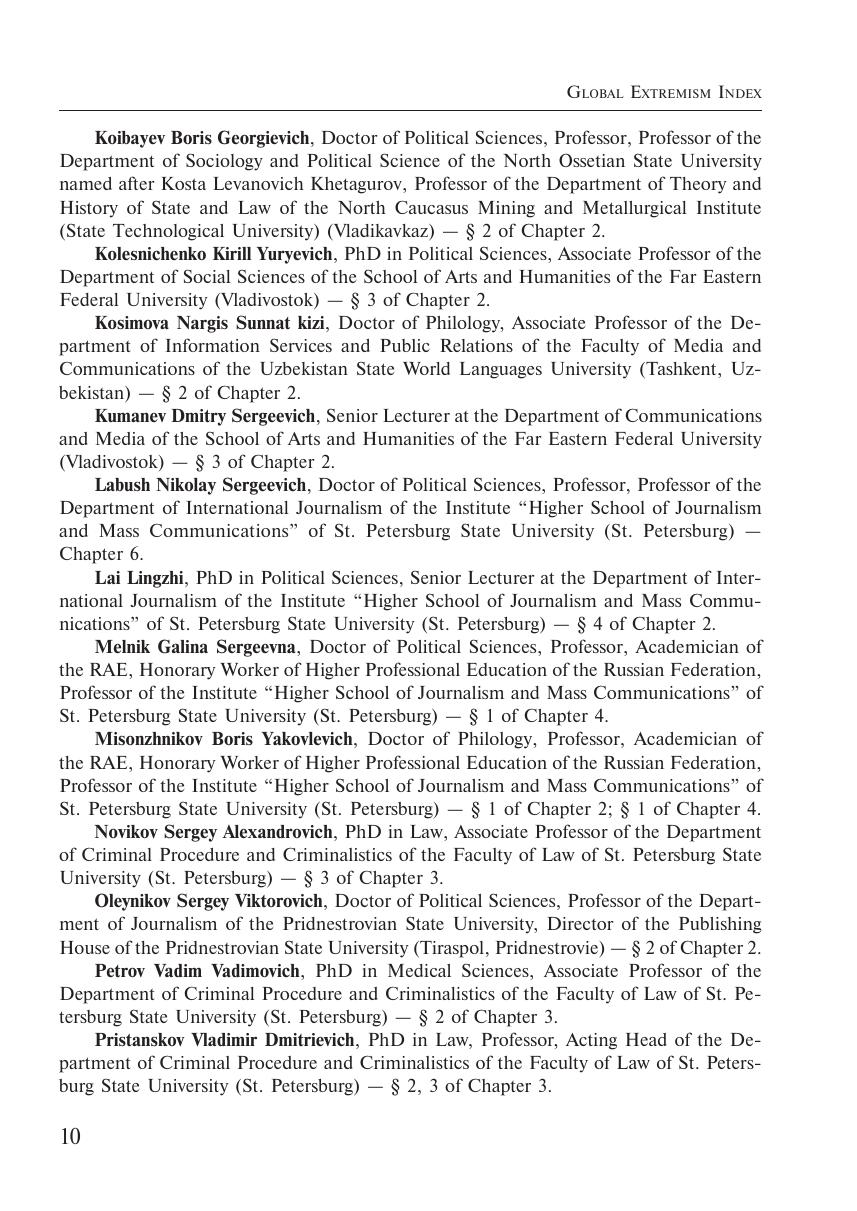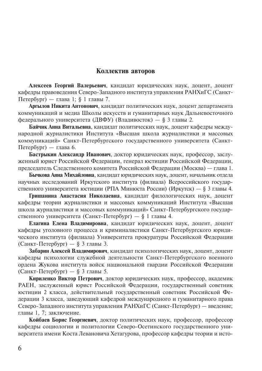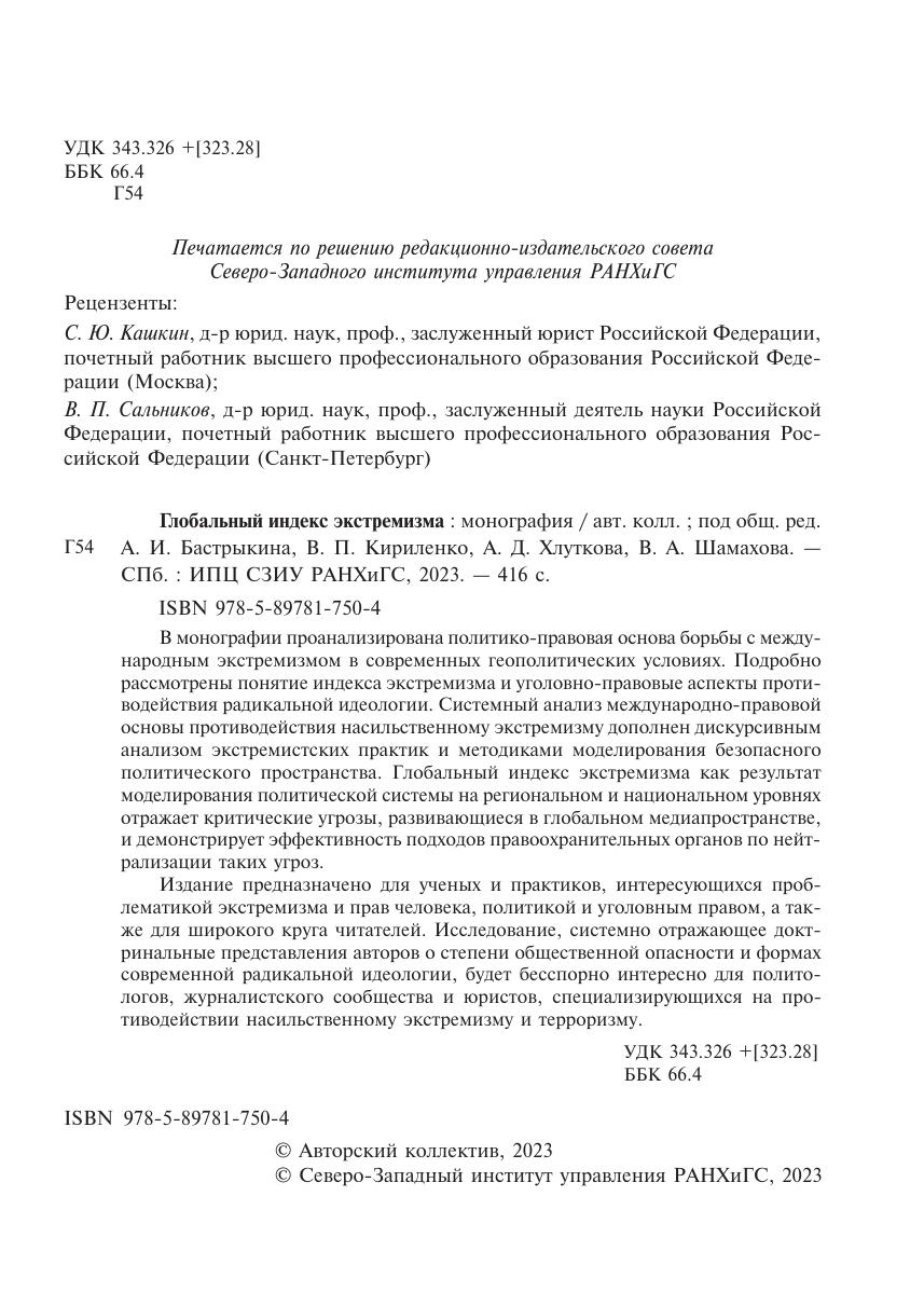 В монографии проанализирована политико-правовая основа борьбы с международным экстремизмом в современных геополитических условиях. Подробно рассмотрены понятие индекса экстремизма и уголовно-правовые аспекты противодействия радикальной идеологии. Системный анализ международно-правовой основы противодействия насильственному экстремизму дополнен дискурсивным анализом экстремистских практик и методиками моделирования безопасного политического пространства. Глобальный индекс экстремизма как результат моделирования политической системы на региональном и национальном уровнях отражает критические угрозы, развивающиеся в глобальном медиапространстве, и демонстрирует эффективность подходов правоохранительных органов по нейтрализации таких угроз. Издание предназначено для ученых и практиков, интересующихся проблематикой экстремизма и прав человека, политикой и уголовным правом, а также для широкого круга читателей. Исследование, системно отражающее доктринальные представления авторов о степени общественной опасности и формах современной радикальной идеологии, будет бесспорно интересно для политологов, журналистского сообщества и юристов, специализирующихся на противодействии насильственному экстремизму и терроризму.