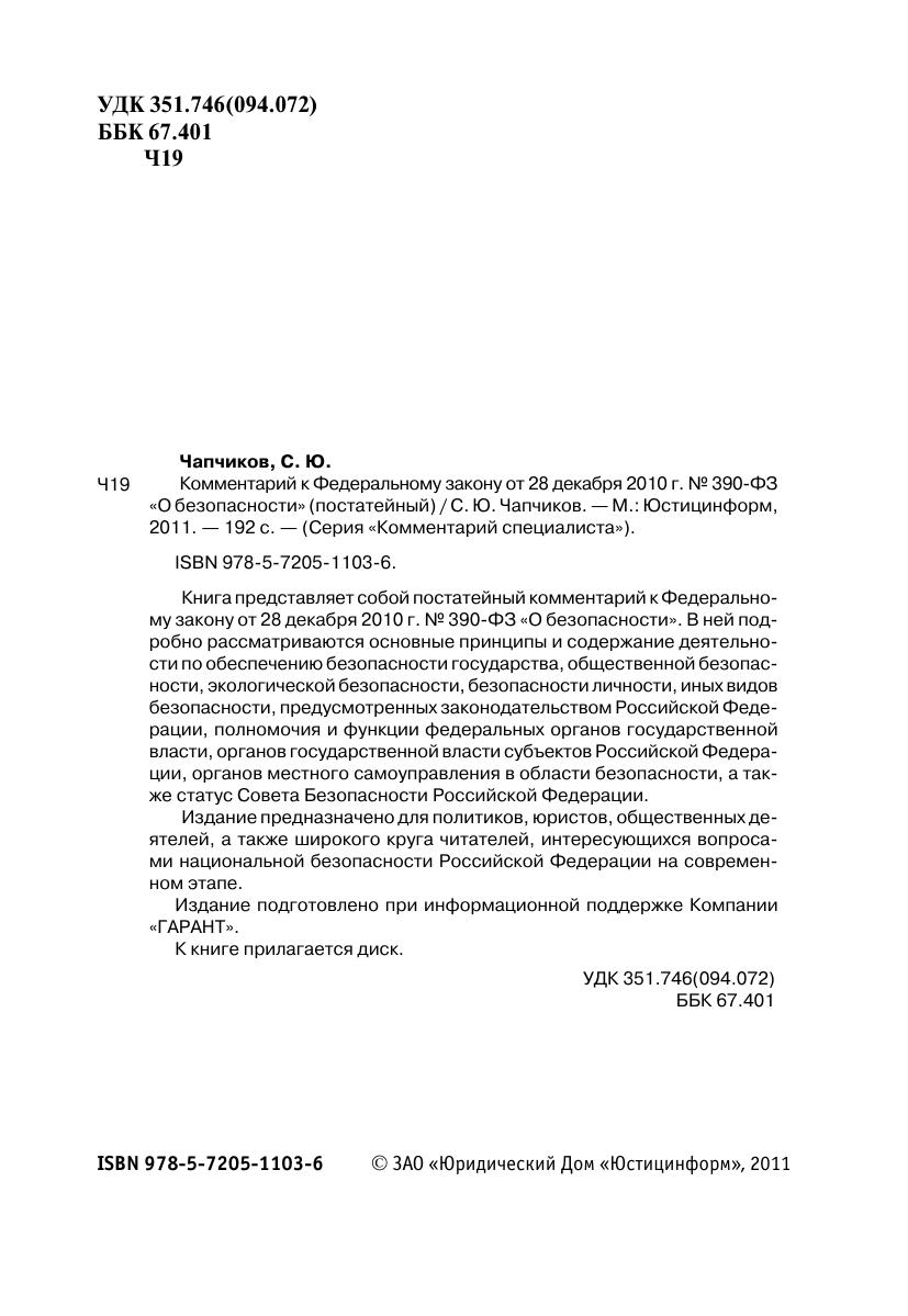Книга представляет собой постатейный комментарий к Федеральному закону от 28 декабря 2010 г. № 390-ФЗ «О безопасности». В ней подробно рассматриваются основные принципы и содержание деятельности по обеспечению безопасности государства, общественной безопасности, экологической безопасности, безопасности личности, иных видов безопасности, предусмотренных законодательством Российской Федерации, полномочия и функции федеральных органов государственной власти, органов государственной власти субъектов Российской Федерации, органов местного самоуправления в области безопасности, а также статус Совета Безопасности Российской Федерации.