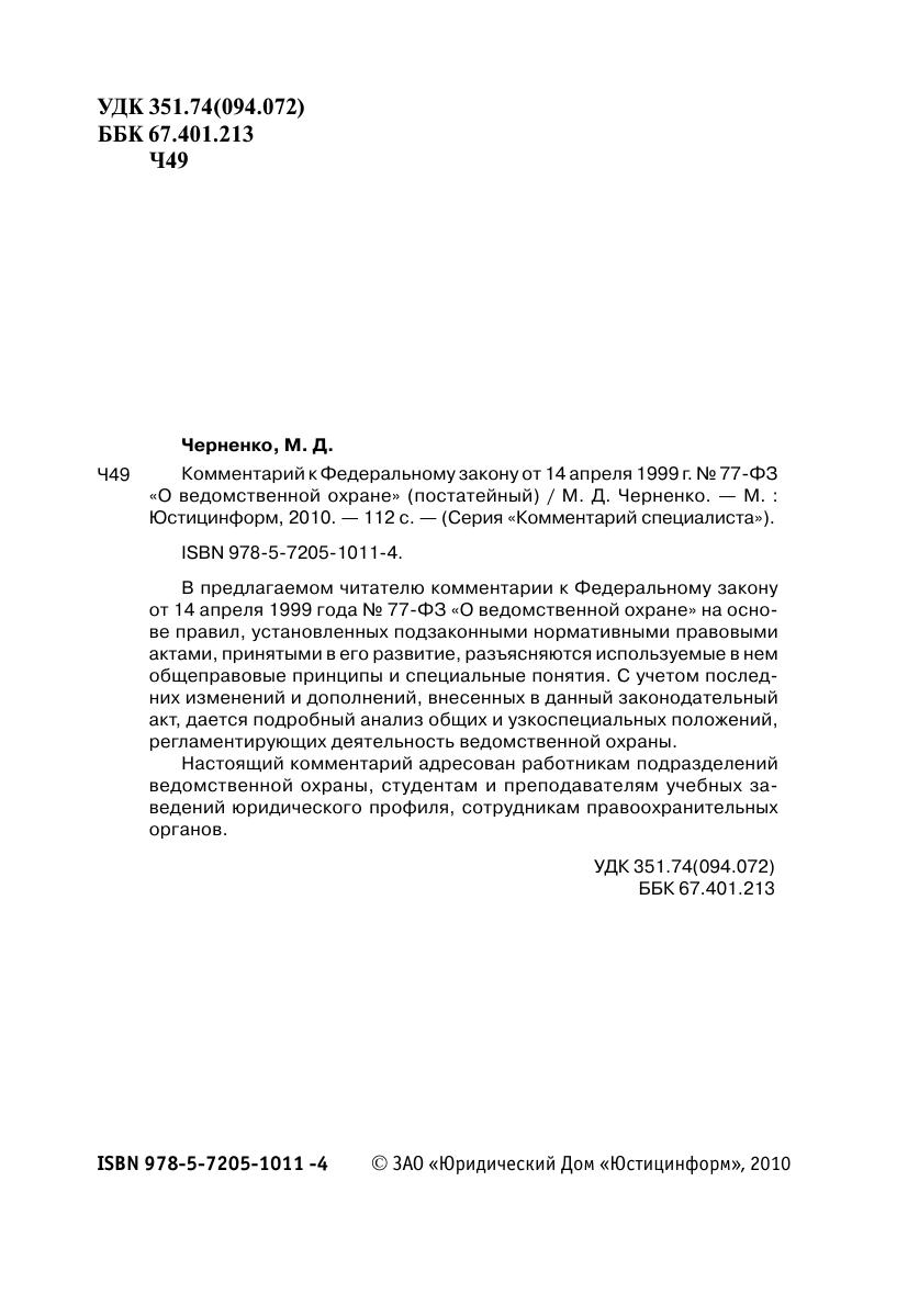 В предлагаемом читателю комментарии к Федеральному закону от 14 апреля 1999 года № 77-ФЗ «О ведомственной охране» на основе правил, установленных подзаконными нормативными правовыми актами, принятыми в его развитие, разъясняются используемые в нем общеправовые принципы и специальные понятия. С учетом последних изменений и дополнений, внесенных в данный законодательный акт, дается подробный анализ общих и узкоспециальных положений, регламентирующих деятельность ведомственной охраны. Настоящий комментарий адресован работникам подразделений ведомственной охраны, студентам и преподавателям учебных заведений юридического профиля, сотрудникам правоохранительных органов.