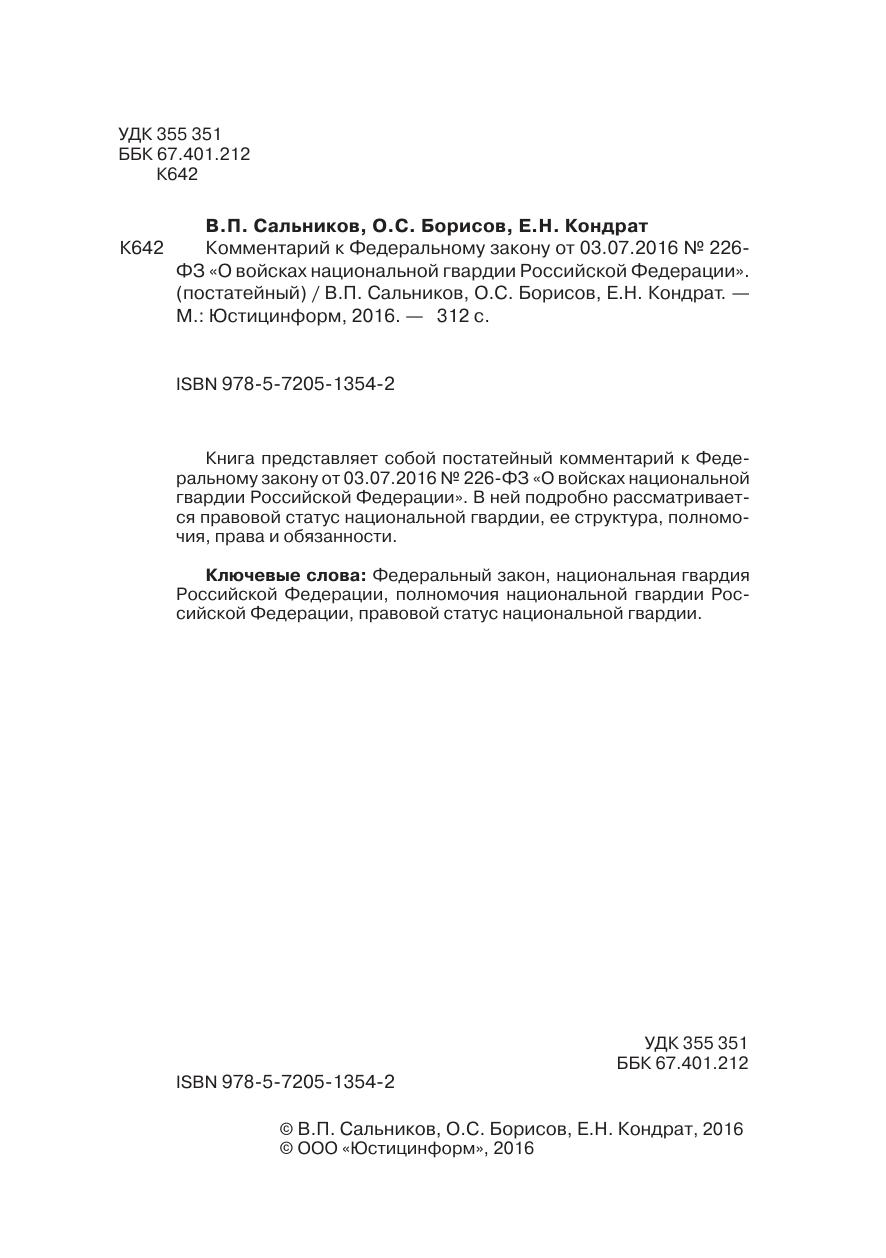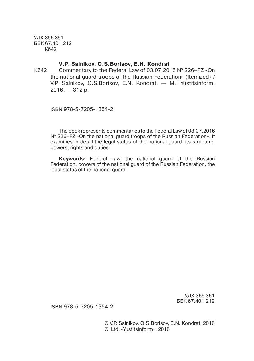 Книга представляет собой постатейный комментарий к федеральному закону от 03.07.2016 № 226-фЗ «о войсках национальной гвардии российской федерации». В ней подробно рассматривается правовой статус национальной гвардии, ее структура, полномочия, права и обязанности.