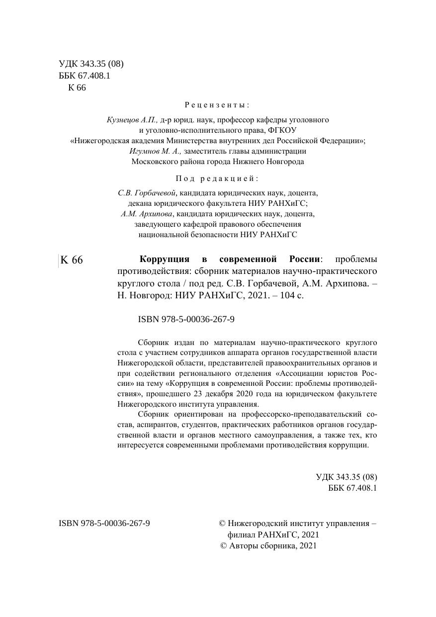 Сборник издан по материалам научно-практического круглого стола с участием сотрудников аппарата органов государственной власти Нижегородской области, представителей правоохранительных органов и при содействии регионального отделения «Ассоциации юристов России» на тему «Коррупция в современной России: проблемы противодействия», прошедшего 23 декабря 2020 года на юридическом факультете Нижегородского института управления. Сборник ориентирован на профессорско-преподавательский состав, аспирантов, студентов, практических работников органов государственной власти и органов местного самоуправления, а также тех, кто интересуется современными проблемами противодействия коррупции.