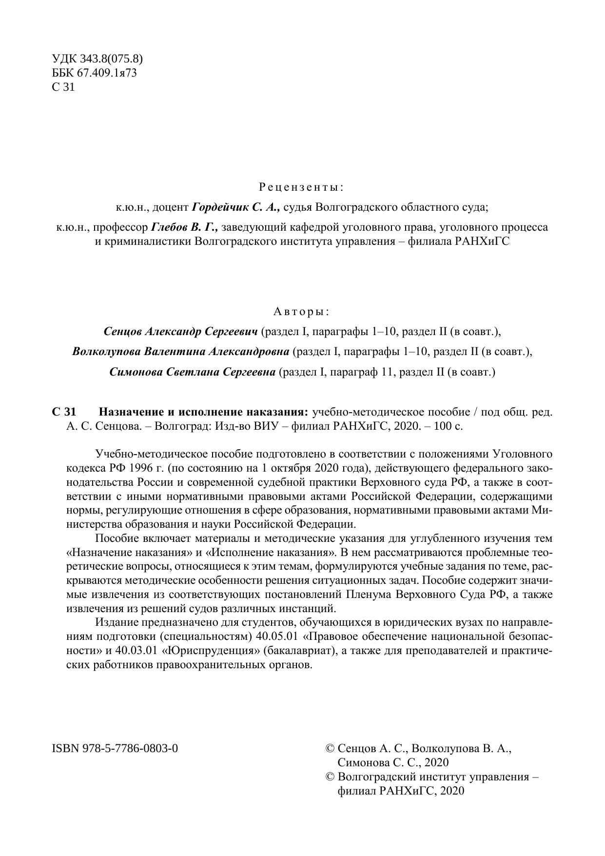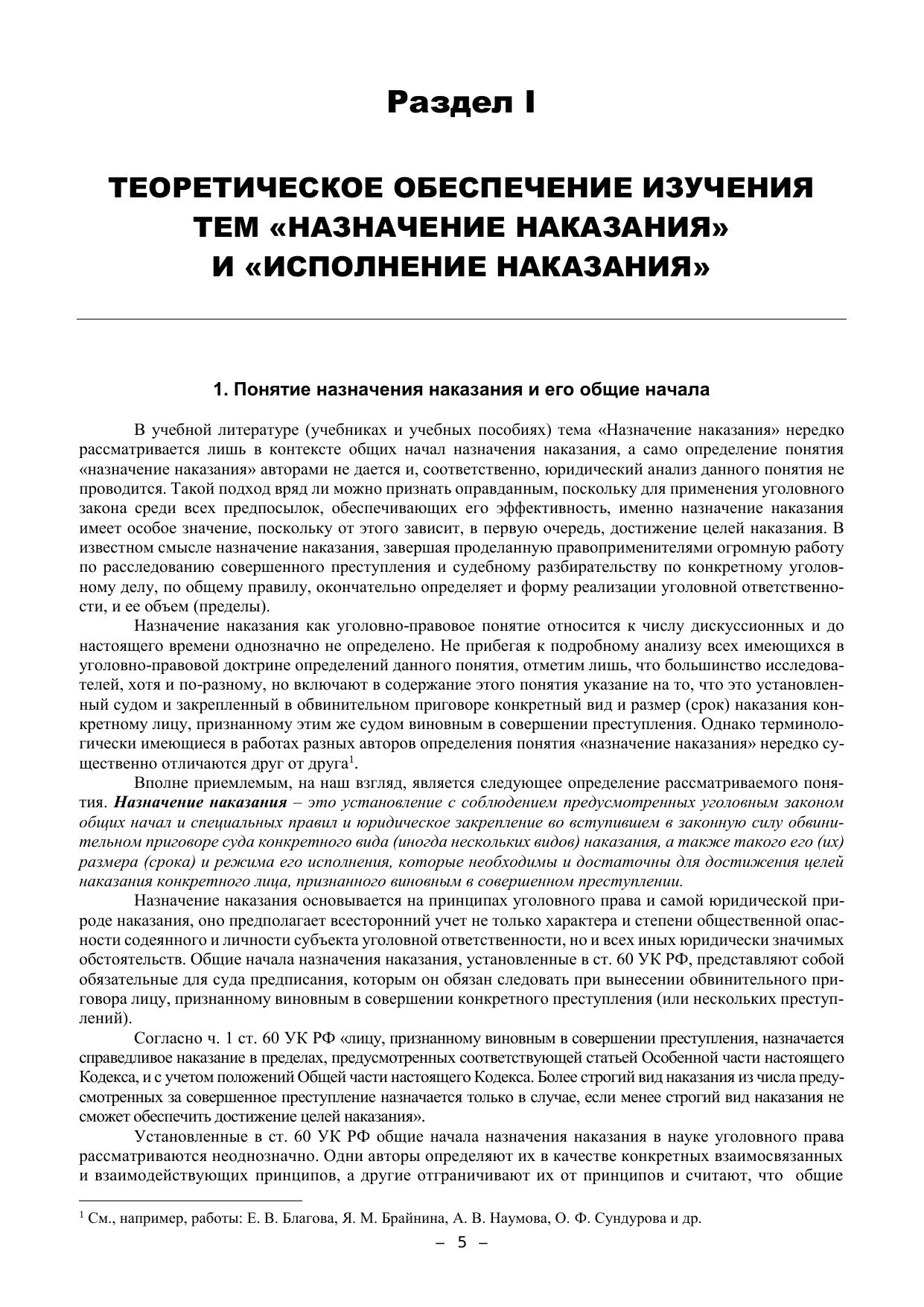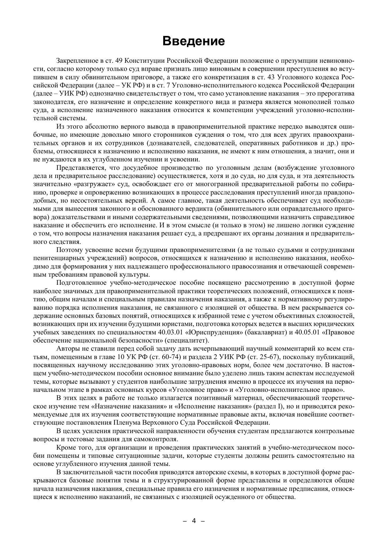 Учебно-методическое пособие подготовлено в соответствии с положениями Уголовного кодекса РФ 1996 г. (по состоянию на 1 октября 2020 года), действующего федерального зако-нодательства России и современной судебной практики Верховного суда РФ, а также в соот-ветствии с иными нормативными правовыми актами Российской Федерации, содержащими нормы, регулирующие отношения в сфере образования, нормативными правовыми актами Ми-нистерства образования и науки Российской Федерации. Пособие включает материалы и методические указания для углубленного изучения тем «Назначение наказания» и «Исполнение наказания». В нем рассматриваются проблемные тео-ретические вопросы, относящиеся к этим темам, формулируются учебные задания по теме, рас-крываются методические особенности решения ситуационных задач. Пособие содержит значи-мые извлечения из соответствующих постановлений Пленума Верховного Суда РФ, а также извлечения из решений судов различных инстанций. Издание предназначено для студентов, обучающихся в юридических вузах по направле-ниям подготовки (специальностям) 40.05.01 «Правовое обеспечение национальной безопас-ности» и 40.03.01 «Юриспруденция» (бакалавриат), а также для преподавателей и практиче-ских работников правоохранительных органов.