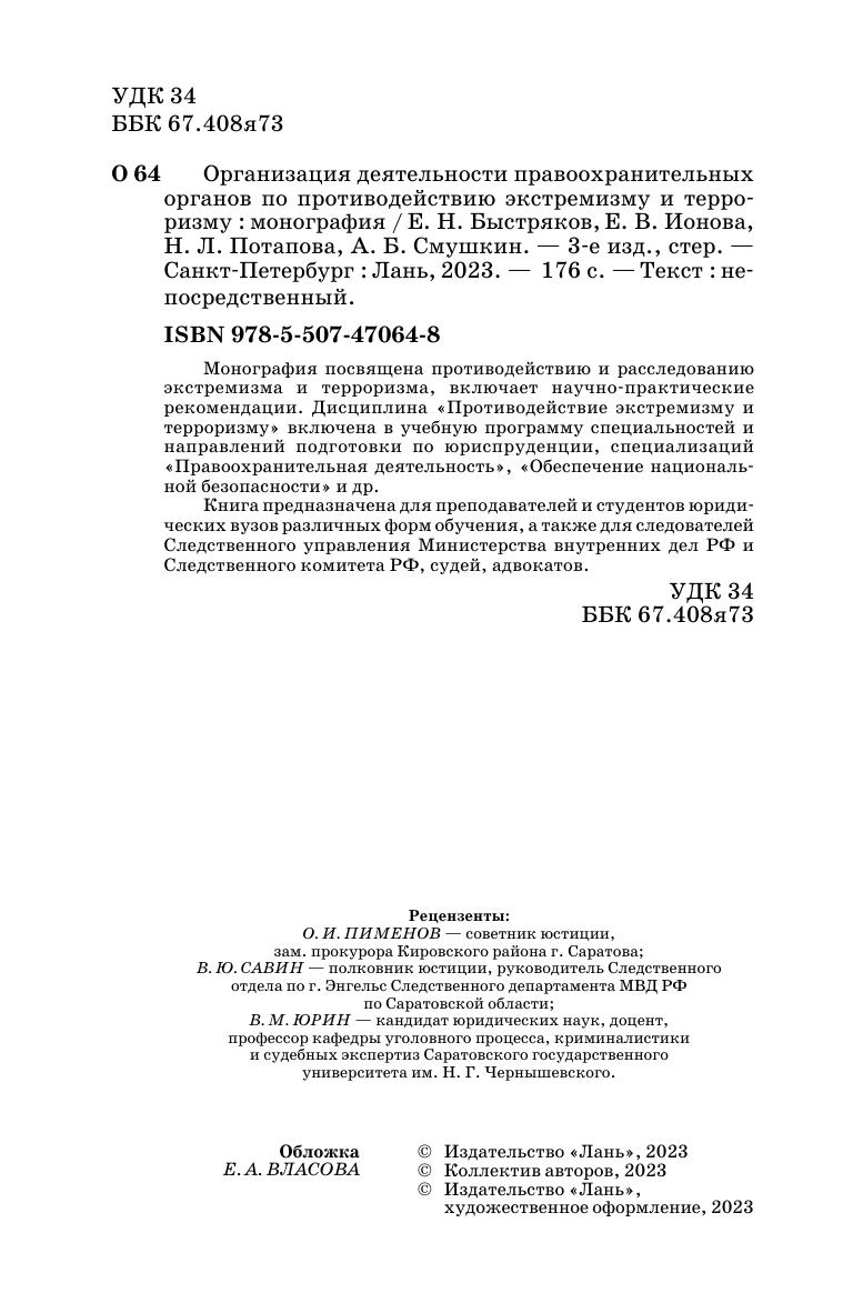Монография посвящена противодействию и расследованию экстремизма и терроризма, включает научно-практические рекомендации. Дисциплина «Противодействие экстремизму и терроризму» включена в учебную программу специальностей и направлений подготовки по юриспруденции, специализаций «Правоохранительная деятельность», «Обеспечение национальной безопасности» и др. Книга предназначена для преподавателей и студентов юридических вузов различных форм обучения, а также для следователей Следственного управления Министерства внутренних дел РФ и Следственного Комитета РФ, судей, адвокатов.
