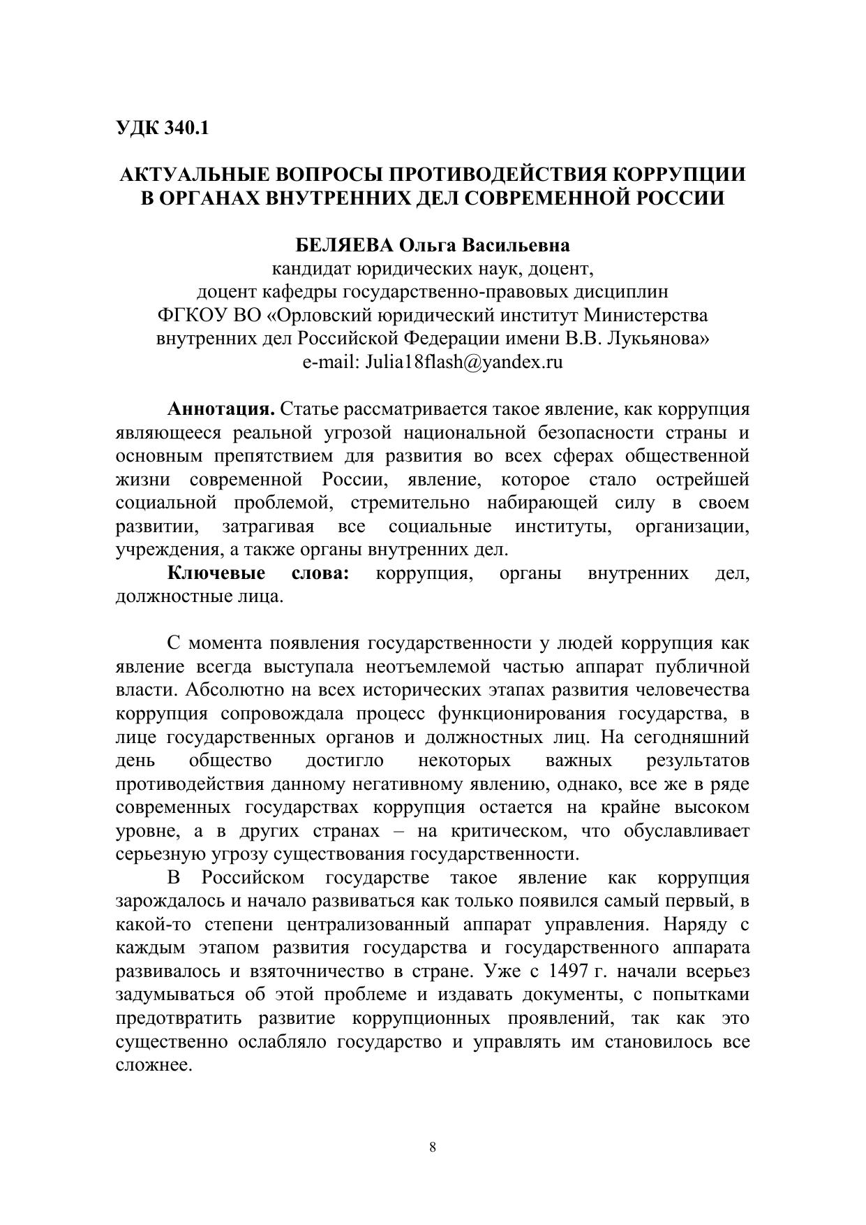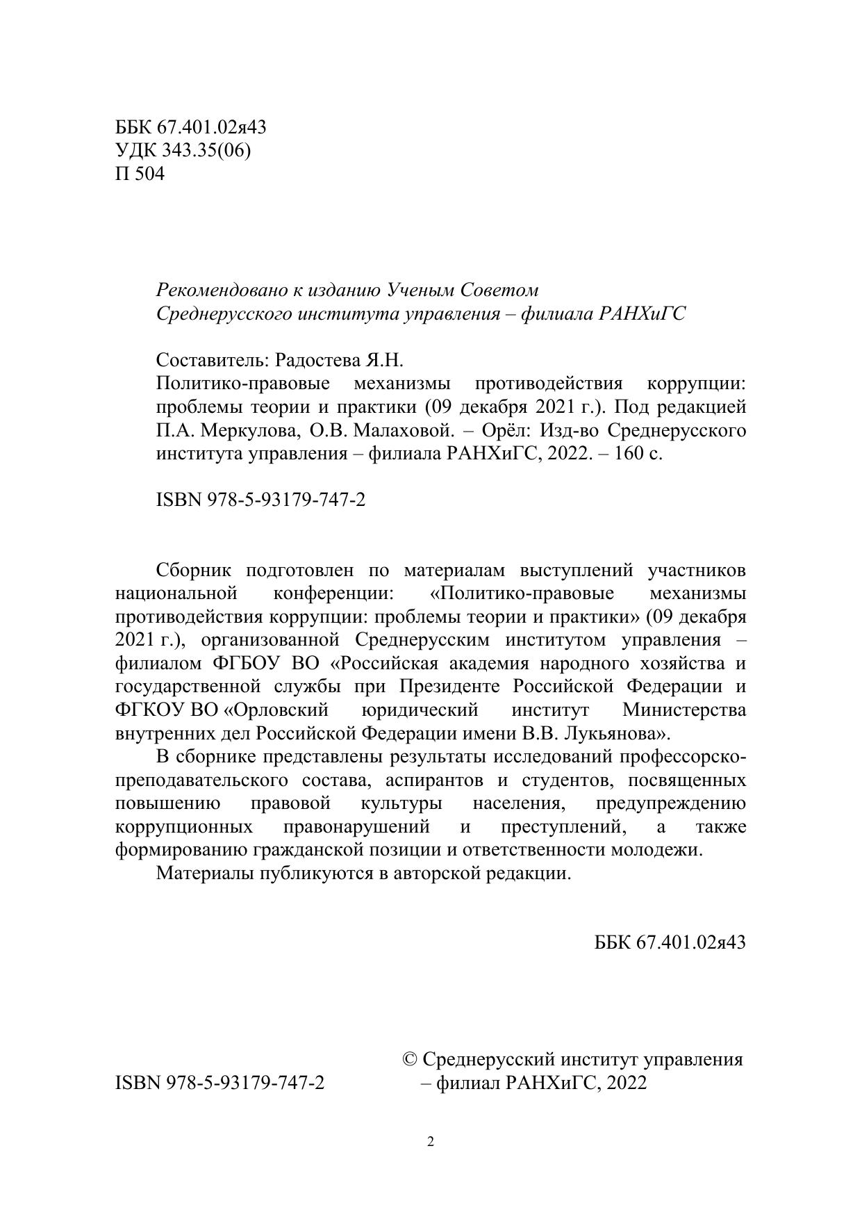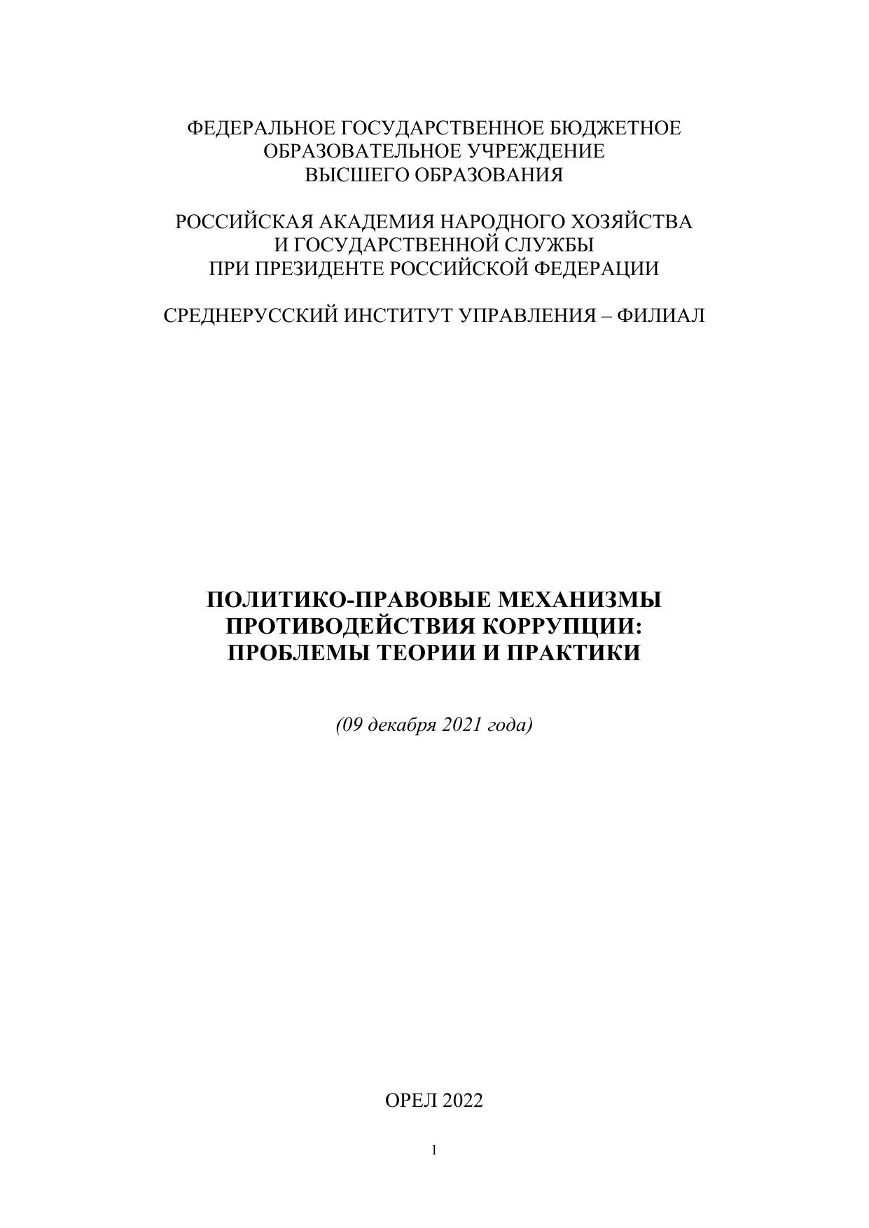 Сборник подготовлен по материалам выступлений участников национальной конференции: «Политико-правовые механизмы противодействия коррупции: проблемы теории и практики» (09 декабря 2021 г.), организованной Среднерусским институтом управления – филиалом ФГБОУ ВО «Российская академия народного хозяйства и государственной службы при Президенте Российской Федерации и ФГКОУ ВО «Орловский юридический институт Министерства внутренних дел Российской Федерации имени В.В. Лукьянова». В сборнике представлены результаты исследований профессорскопреподавательского состава, аспирантов и студентов, посвященных повышению правовой культуры населения, предупреждению коррупционных правонарушений и преступлений, а также формированию гражданской позиции и ответственности молодежи. Материалы публикуются в авторской редакции.
