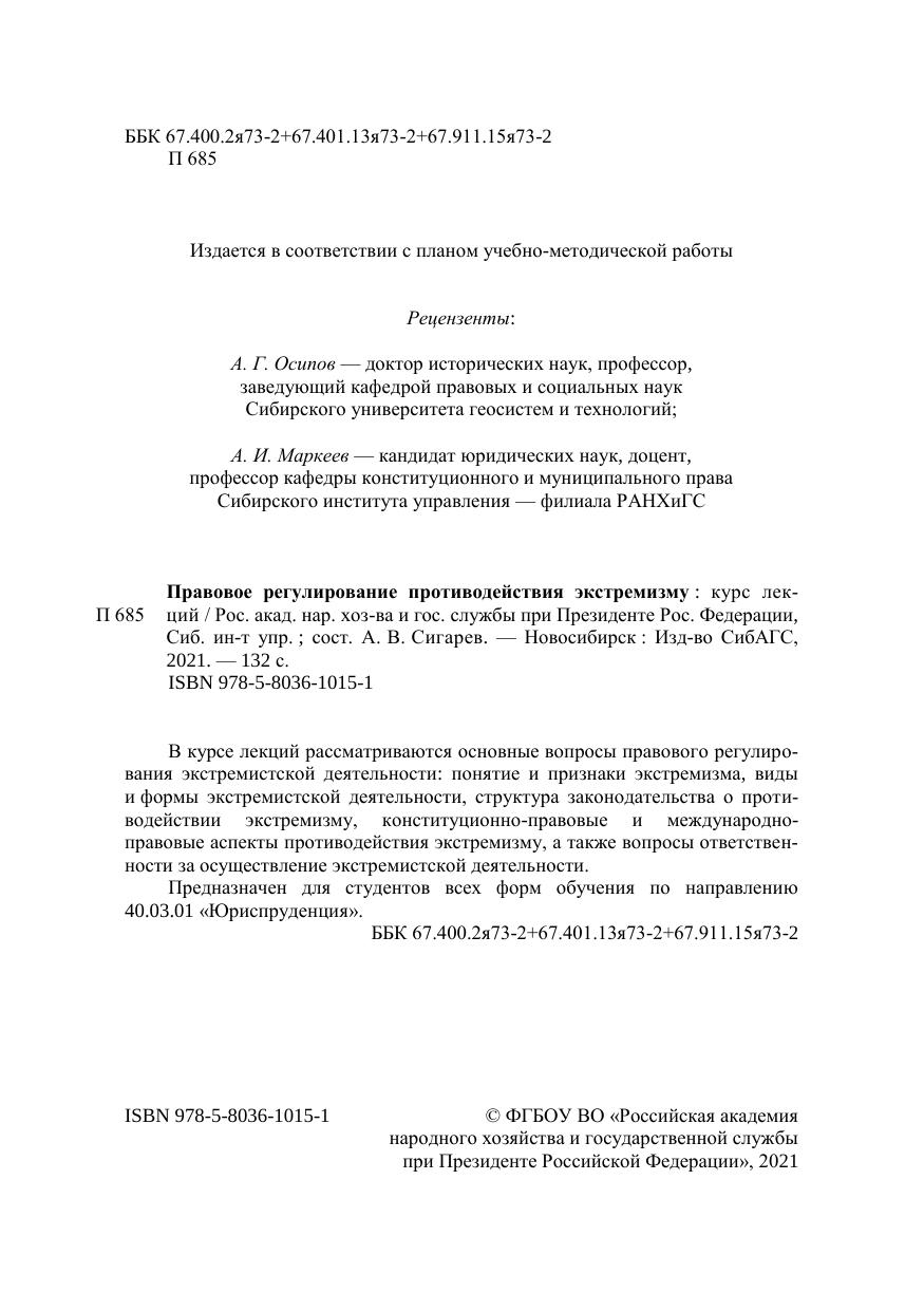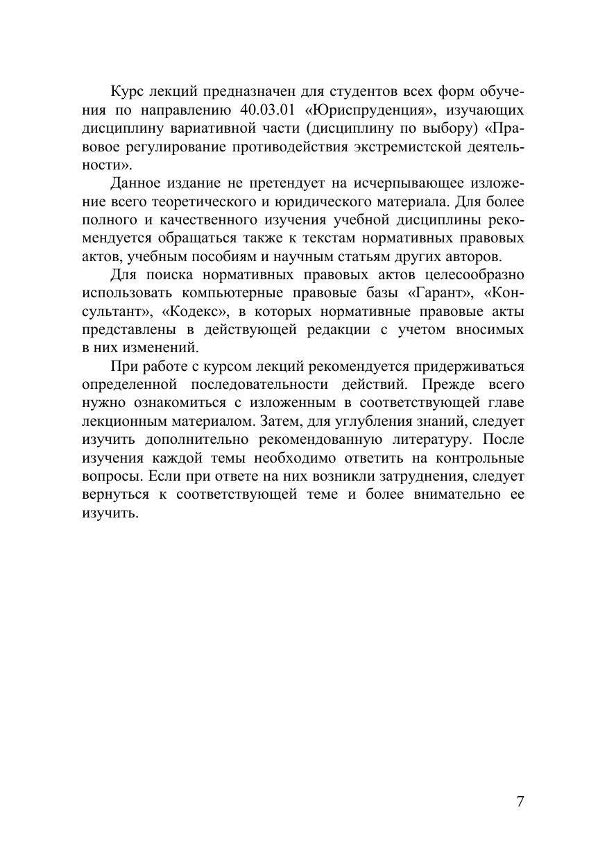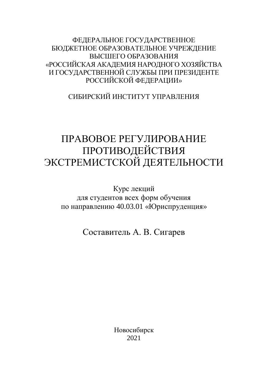 В курсе лекций рассматриваются основные вопросы правового регулиро-вания экстремистской деятельности: понятие и признаки экстремизма, виды и формы экстремистской деятельности, структура законодательства о проти-водействии экстремизму, конституционно-правовые и международно-правовые аспекты противодействия экстремизму, а также вопросы ответствен-ности за осуществление экстремистской деятельности. Предназначен для студентов всех форм обучения по направлению 40.03.01 «Юриспруденция».