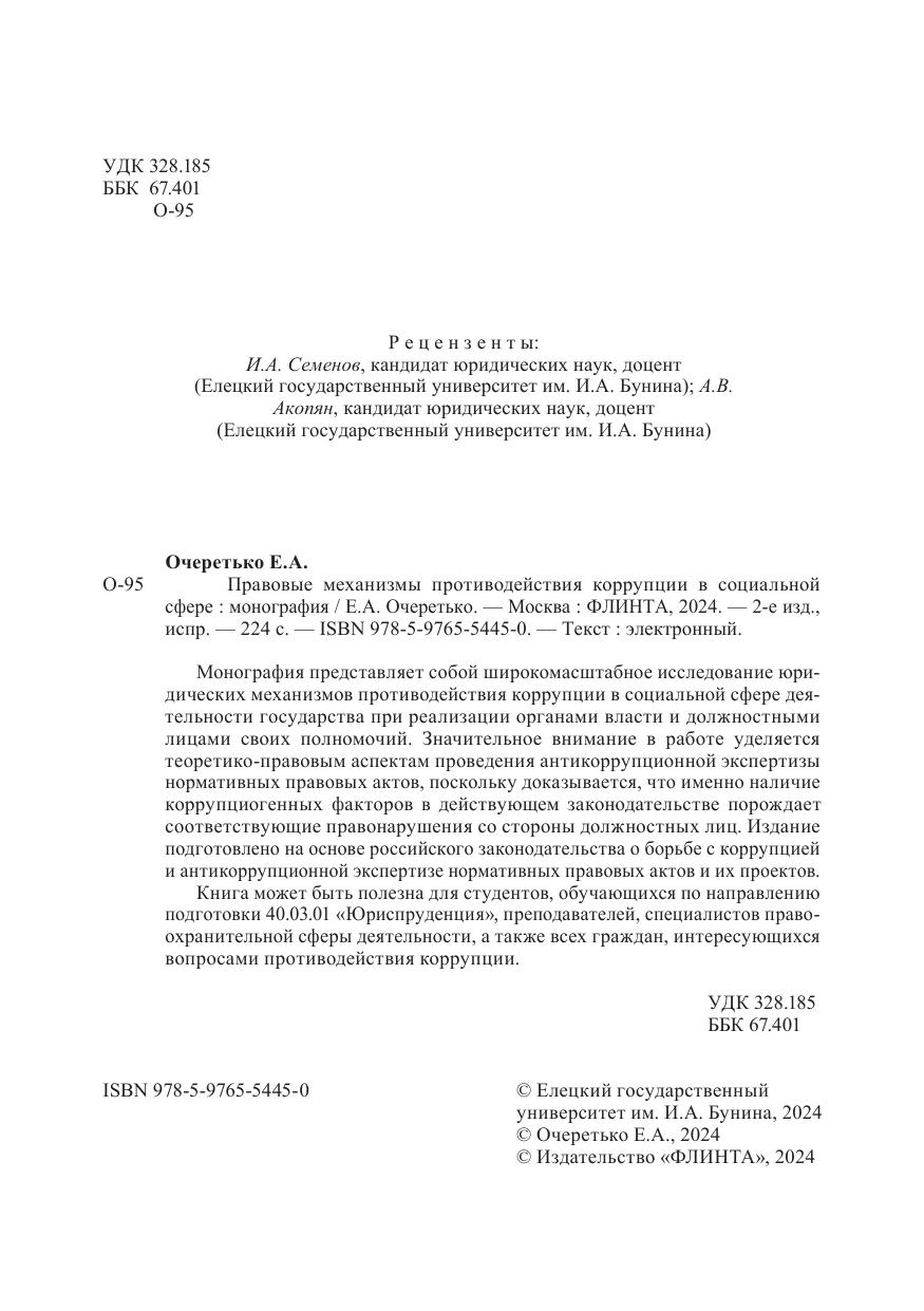 Монография представляет собой широкомасштабное исследование юридических механизмов противодействия коррупции в социальной сфере деятельности государства при реализации органами власти и должностными лицами своих полномочий. Значительное внимание в работе уделяется теоретико-правовым аспектам проведения антикоррупционной экспертизы нормативных правовых актов, поскольку доказывается, что именно наличие коррупциогенных факторов в действующем законодательстве порождает соответствующие правонарушения со стороны должностных лиц. Издание подготовлено на основе российского законодательства о борьбе с коррупцией и антикоррупционной экспертизе нормативных правовых актов и их проектов.