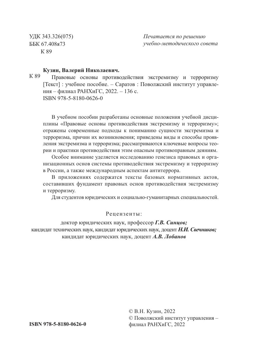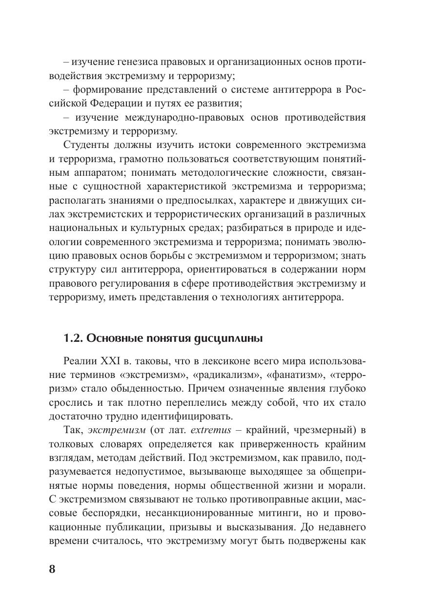 В учебном пособии разработаны основные положения учебной дисциплины «Правовые основы противодействия экстремизму и терроризму»; отражены современные подходы к пониманию сущности экстремизма и терроризма, причин их возникновения; приведены виды и способы проявления экстремизма и терроризма; рассматриваются ключевые вопросы теории и практики противодействия этим опасным противоправным деяниям. Особое внимание уделяется исследованию генезиса правовых и организационных основ системы противодействия экстремизму и терроризму в России, а также международным аспектам антитеррора. В приложениях содержатся тексты базовых нормативных актов, составивших фундамент правовых основ противодействия экстремизму и терроризму. Для студентов юридических и социально-гуманитарных специальностей.