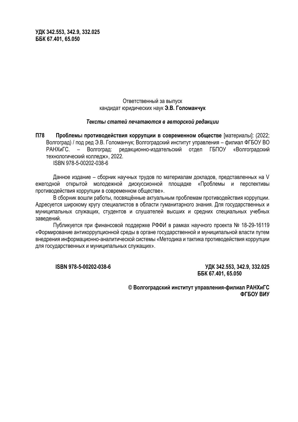 Данное издание – сборник научных трудов по материалам докладов, представленных на V ежегодной открытой молодежной дискуссионной площадке «Проблемы и перспективы противодействия коррупции в современном обществе». В сборник вошли работы, посвящённые актуальным проблемам противодействия коррупции. Адресуется широкому кругу специалистов в области гуманитарного знания. Для государственных и муниципальных служащих, студентов и слушателей высших и средних специальных учебных заведений. Публикуется при финансовой поддержке РФФИ в рамках научного проекта № 18-29-16119 «Формирование антикоррупционной среды в органе государственной и муниципальной власти путем внедрения информационно-аналитической системы «Методика и тактика противодействия коррупции для государственных и муниципальных служащих».