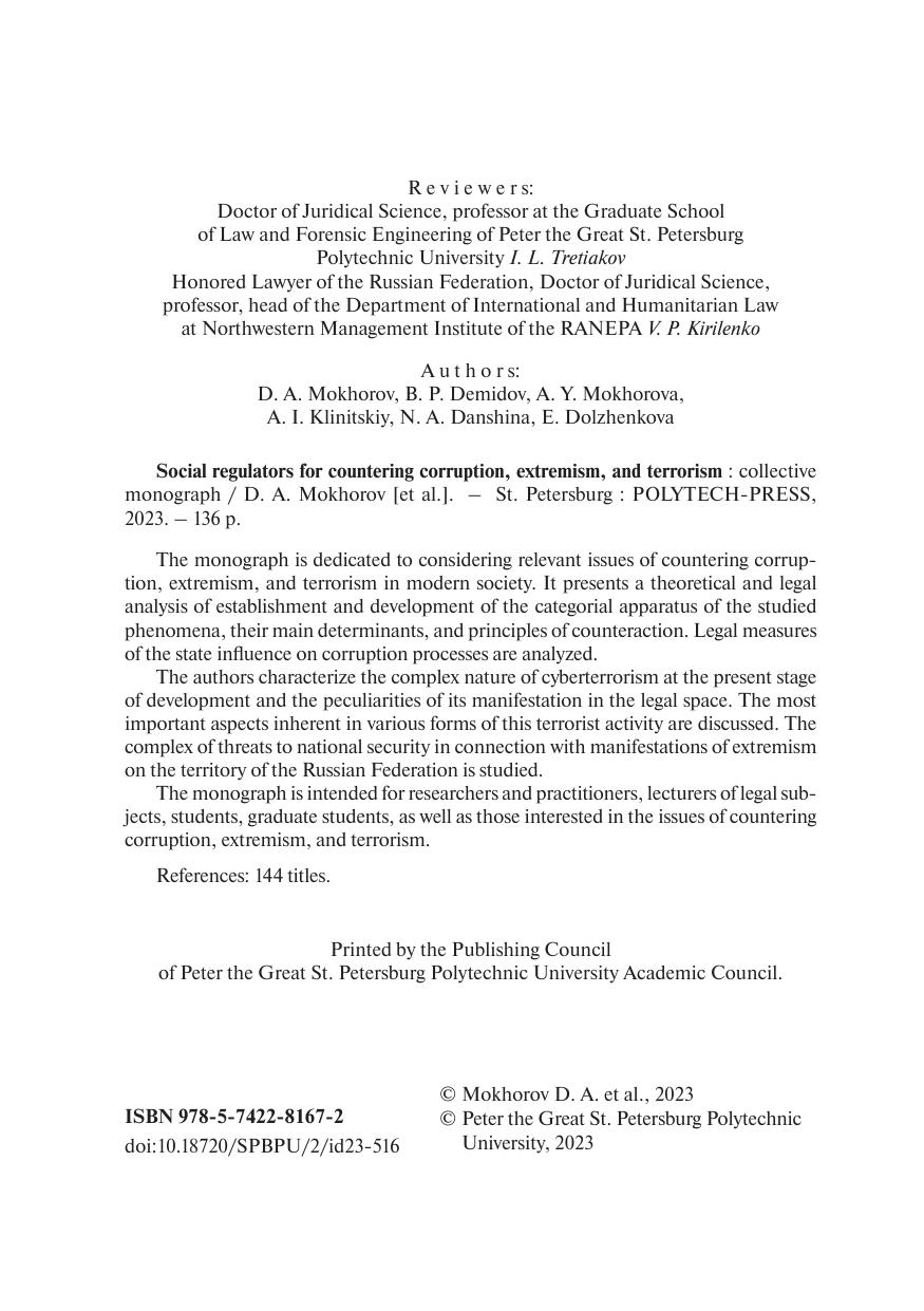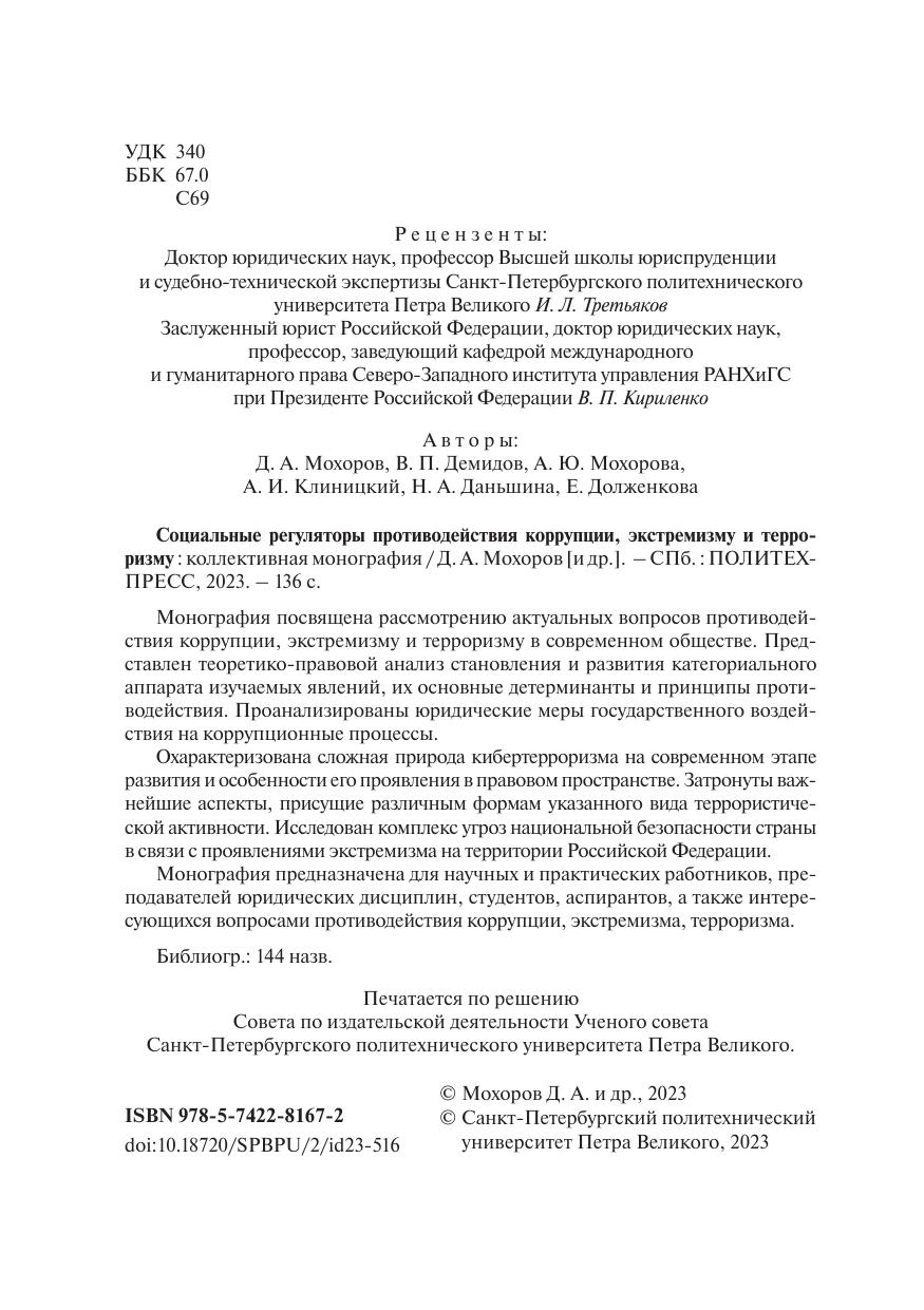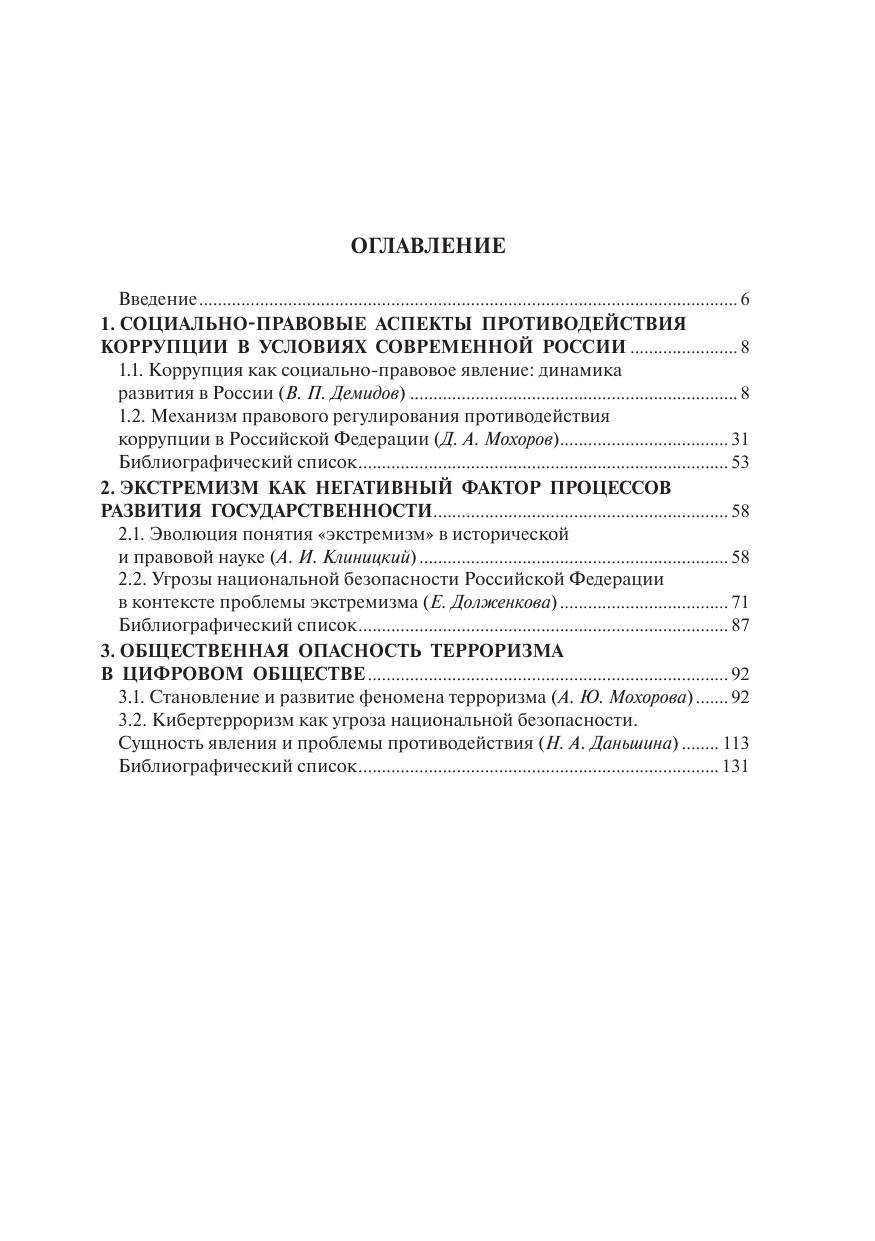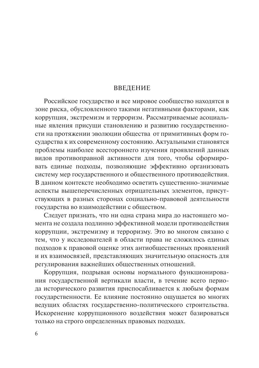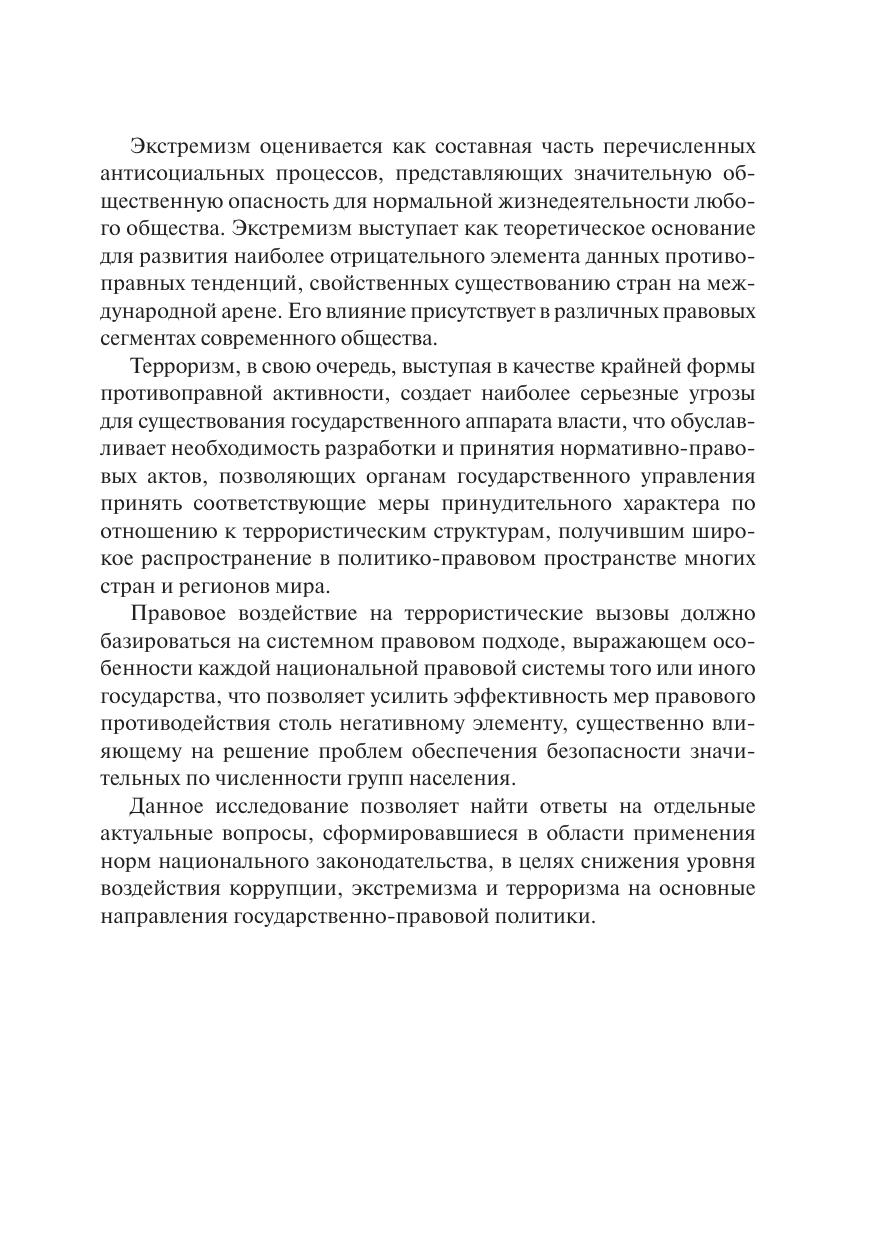 Монография посвящена рассмотрению актуальных вопросов противодействия коррупции, экстремизму и терроризму в современном обществе. Представлен теоретико-правовой анализ становления и развития категориального аппарата изучаемых явлений, их основные детерминанты и принципы противодействия. Проанализированы юридические меры государственного воздействия на коррупционные процессы. Охарактеризована сложная природа кибертерроризма на современном этапе развития и особенности его проявления в правовом пространстве. Затронуты важнейшие аспекты, присущие различным формам указанного вида террористической активности. Исследован комплекс угроз национальной безопасности страны в связи с проявлениями экстремизма на территории Российской Федерации. Монография предназначена для научных и практических работников, преподавателей юридических дисциплин, студентов, аспирантов, а также интересующихся вопросами противодействия коррупции, экстремизма, терроризма.