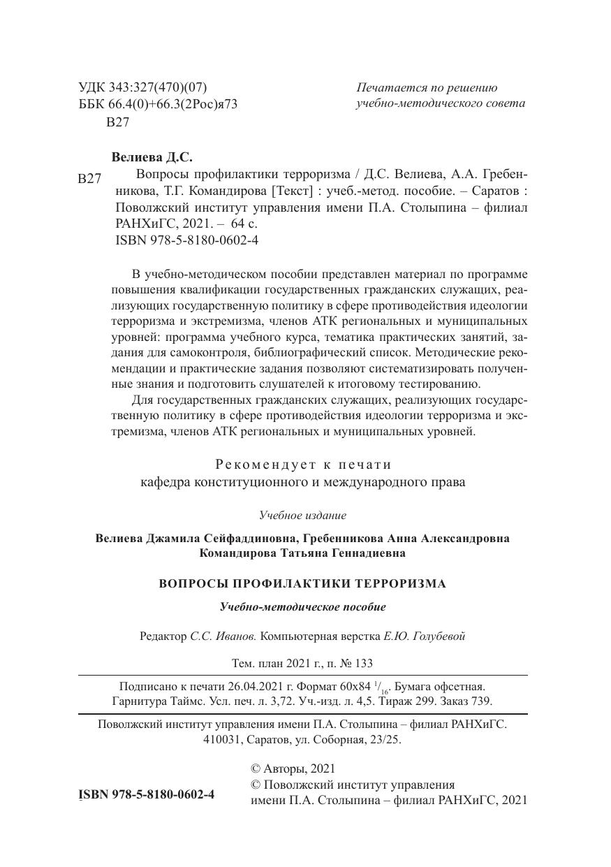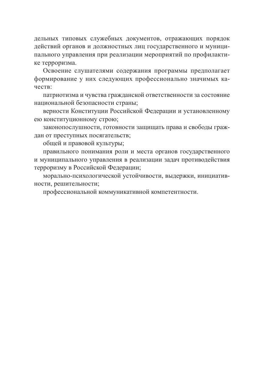 В учебно-методическом пособии представлен материал по программе повышения квалификации государственных гражданских служащих, реализующих государственную политику в сфере противодействия идеологии терроризма и экстремизма, членов АТК региональных и муниципальных уровней: программа учебного курса, тематика практических занятий, задания для самоконтроля, библиографический список. Методические рекомендации и практические задания позволяют систематизировать полученные знания и подготовить слушателей к итоговому тестированию. Для государственных гражданских служащих, реализующих государственную политику в сфере противодействия идеологии терроризма и экстремизма, членов АТК региональных и муниципальных уровней.