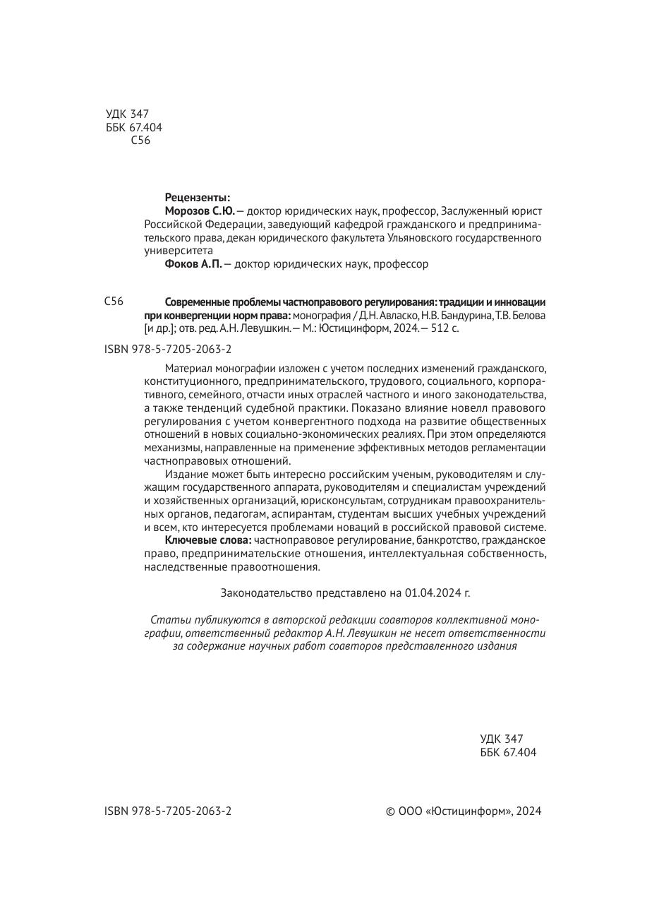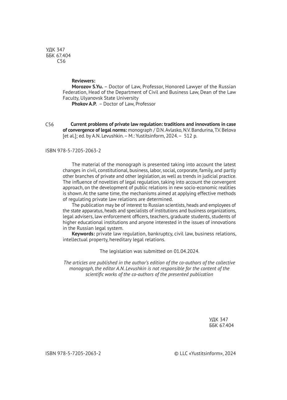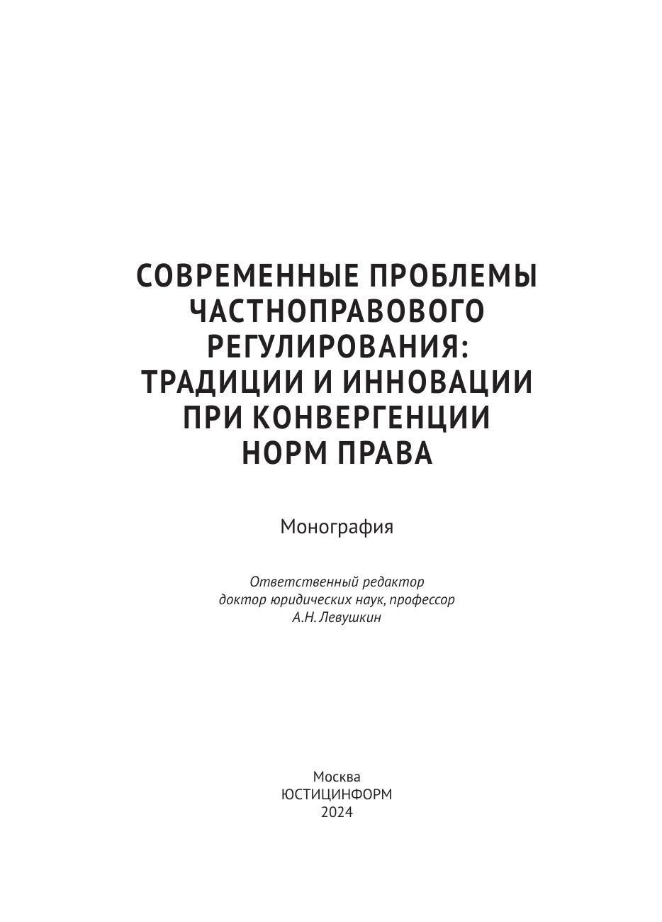 Материал монографии изложен с учетом последних изменений гражданского, конституционного, предпринимательского, трудового, социального, корпоративного, семейного, отчасти иных отраслей частного и иного законодательства, а также тенденций судебной практики. Показано влияние новелл правового регулирования с учетом конвергентного подхода на развитие общественных отношений в новых социально-экономических реалиях. При этом определяются механизмы, направленные на применение эффективных методов регламентации частноправовых отношений. Издание может быть интересно российским ученым, руководителям и служащим государственного аппарата, руководителям и специалистам учреждений и хозяйственных организаций, юрисконсультам, сотрудникам правоохранительных органов, педагогам, аспирантам, студентам высших учебных учреждений и всем, кто интересуется проблемами новаций в российской правовой системе.