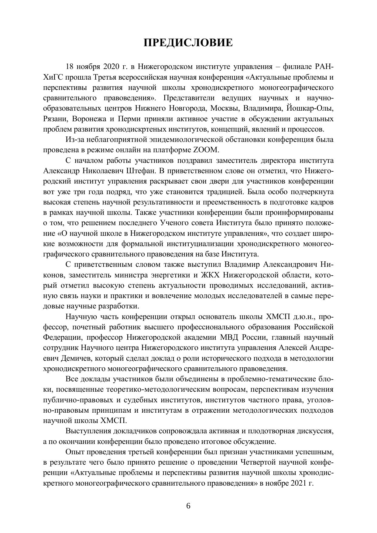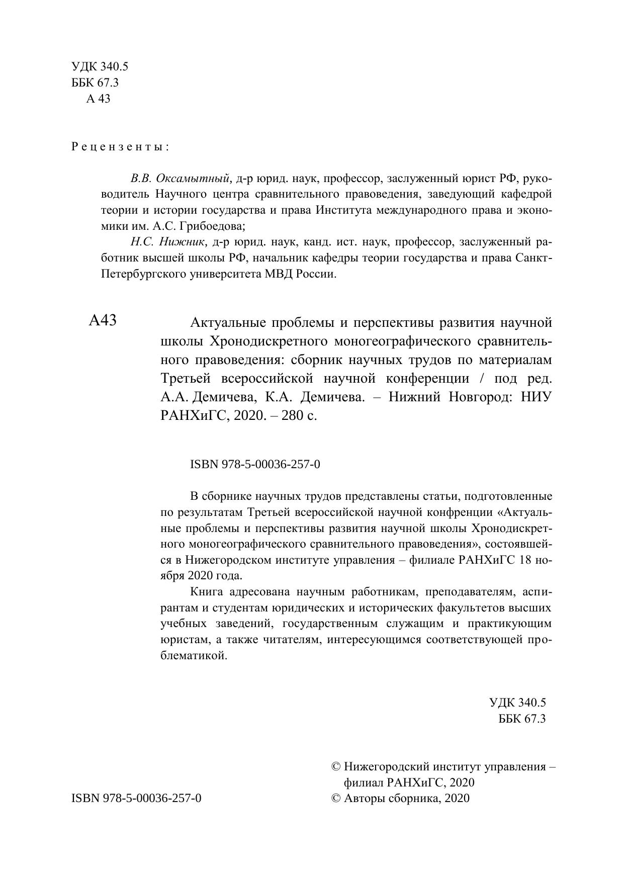 В сборнике научных трудов представлены статьи, подготовленные по результатам Третьей всероссийской научной конфренции «Актуаль-ные проблемы и перспективы развития научной школы Хронодискретного моногеографического сравнительного правоведения», состоявшейся в Нижегородском институте управления – филиале РАНХиГС 18 ноября 2020 года. Книга адресована научным работникам, преподавателям, аспирантам и студентам юридических и исторических факультетов высших учебных заведений, государственным служащим и практикующим юристам, а также читателям, интересующимся соответствующей про-блематикой.