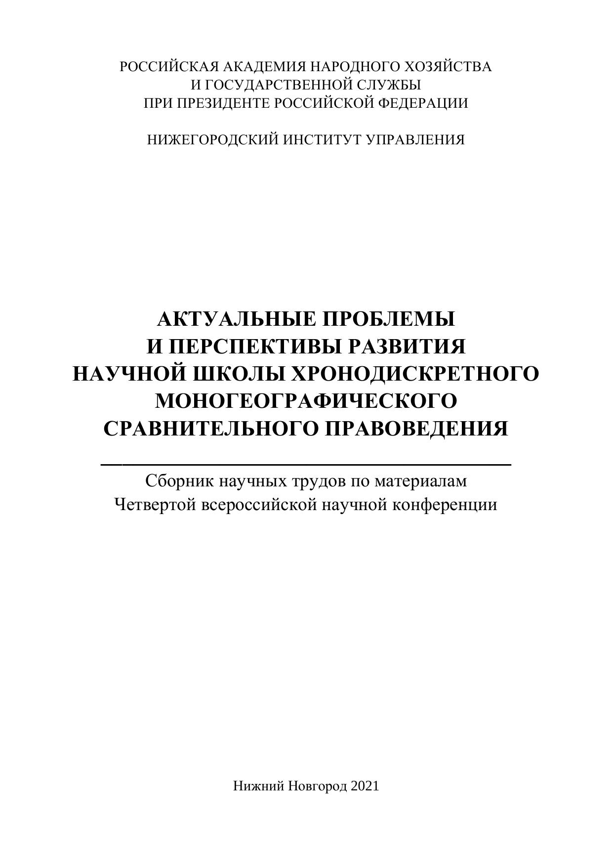 В сборнике научных трудов представлены статьи, подготовленные по результатам Четвертой всероссийской научной конфренции «Акту-альные проблемы и перспективы развития научной школы Хронодис-кретного моногеографического сравнительного правоведения», состояв-шейся в Нижегородском институте управления – филиале РАНХиГС 17 ноября 2021 года. Книга адресована научным работникам, преподавателям, аспирантам и студентам юридических и исторических факультетов высших учебных заведений, государственным служащим и практикующим юристам, а так-же читателям, интересующимся соответствующей проблематикой.