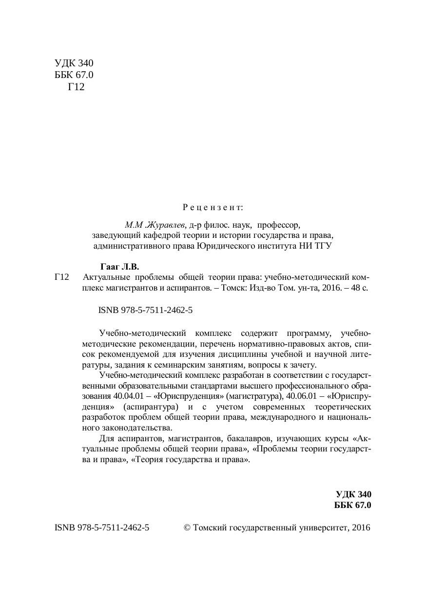 Учебно-методический комплекс содержит программу, учебно-методические рекомендации, перечень нормативно-правовых актов, список рекомендуемой для изучения дисциплины учебной и научной литературы, задания к семинарским занятиям, вопросы к зачету. Учебно-методический комплекс разработан в соответствии с государственными образовательными стандартами высшего профессионального образования 40.04.01 «Юриспруденция» (магистратура) и с учетом современных теоретических разработок проблем общей теории права, международного и национального законодательства. Для аспирантов, магистрантов, бакалавров, изучающих курсы «Актуальные проблемы общей теории права», «Проблемы теории государства и права», «Теория государства и права».