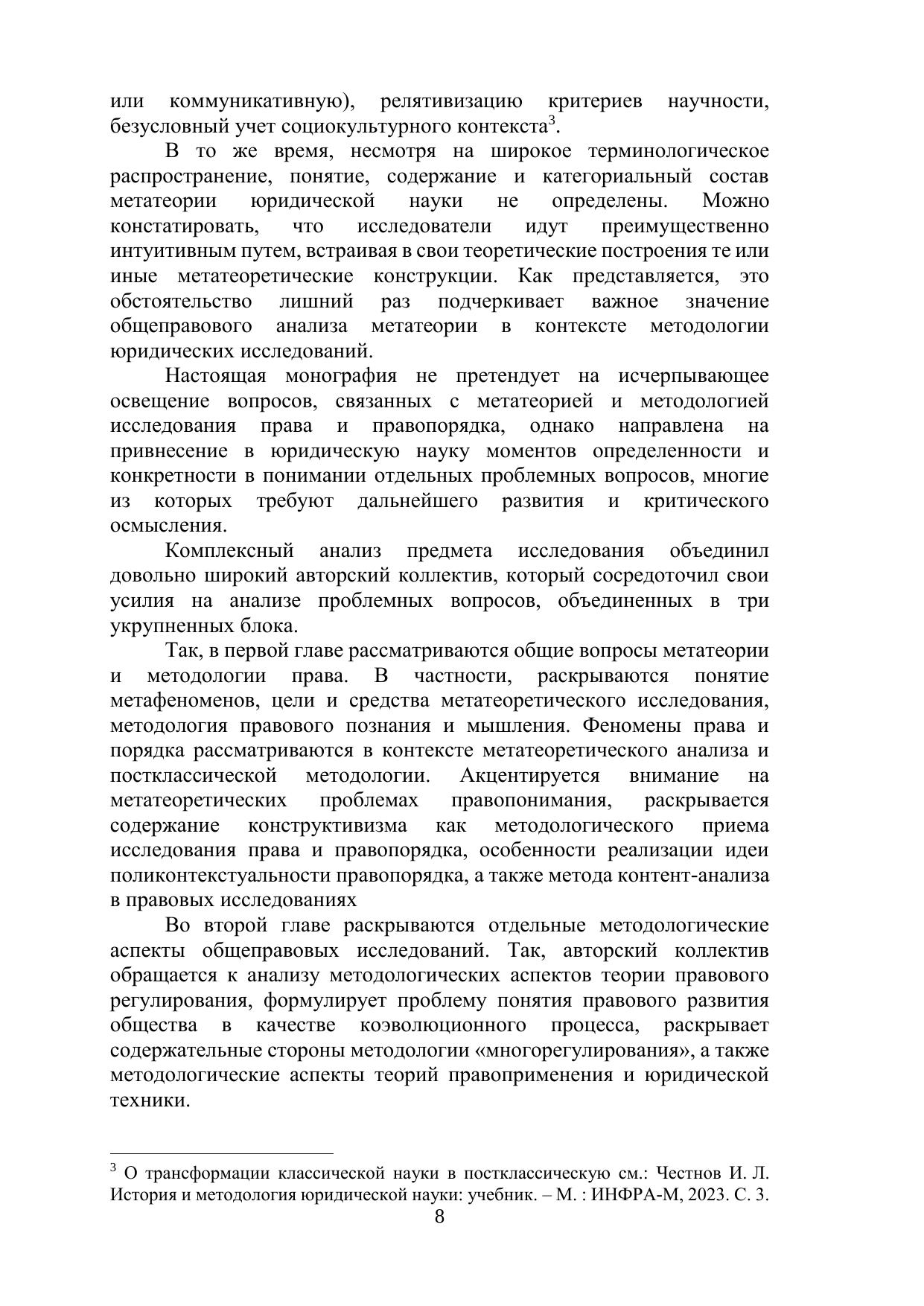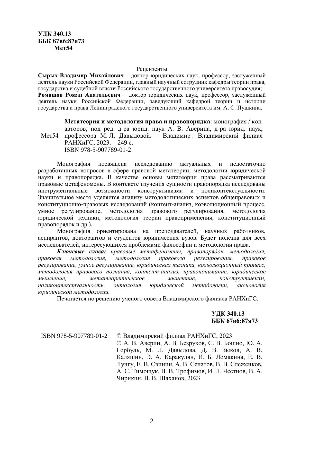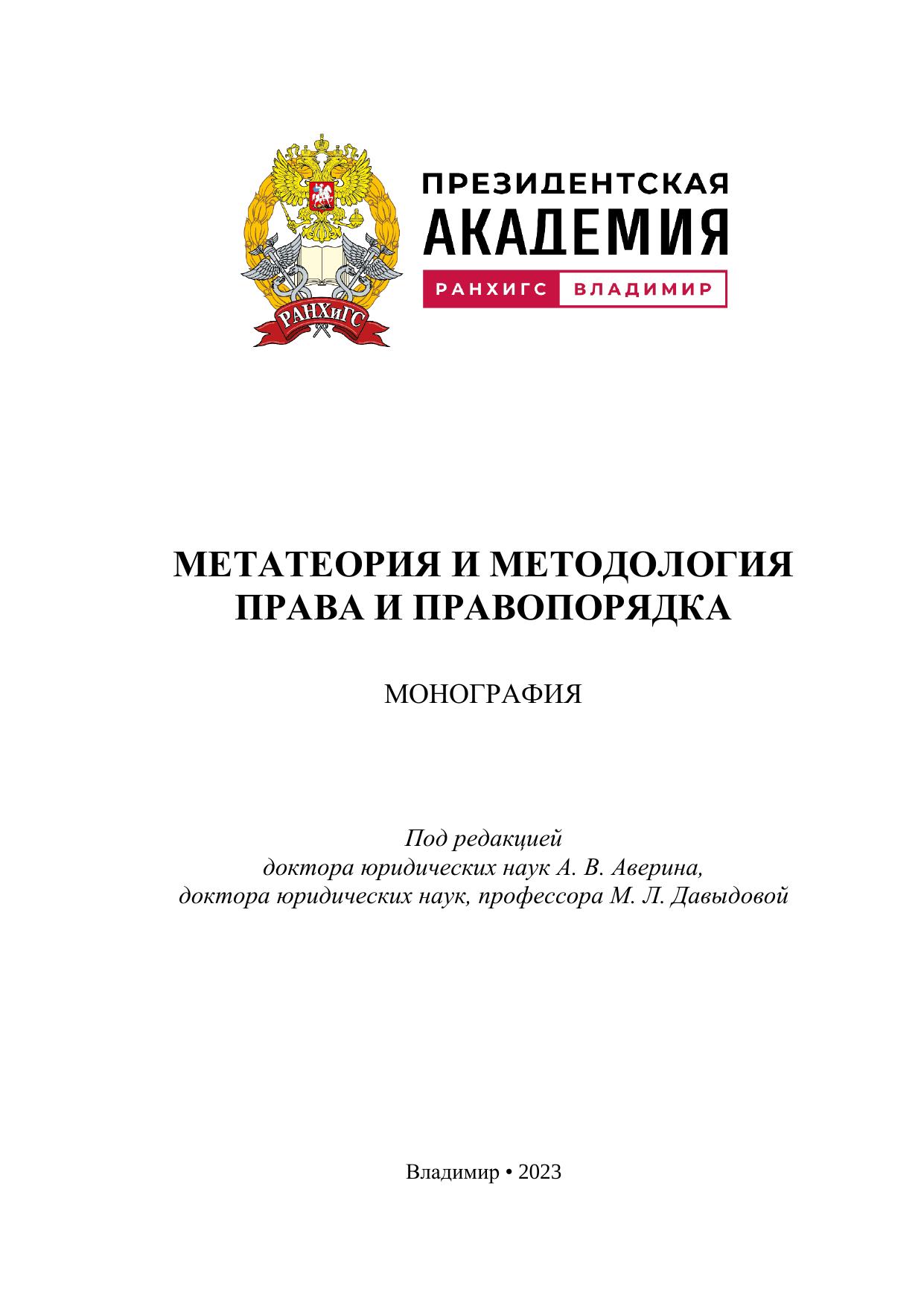 Монография посвящена исследованию актуальных и недостаточно разработанных вопросов в сфере правовой метатеории, методологии юридической науки и правопорядка. В качестве основы метатеории права рассматриваются правовые метафеномены. В контексте изучения сущности правопорядка исследованы инструментальные возможности конструктивизма и поликонтекстуальности. Значительное место уделяется анализу методологических аспектов общеправовых и конституционно-правовых исследований (контент-анализ, коэволюционный процесс, умное регулирование, методология правового регулирования, методология юридической техники, методология теории правоприменения, конституционный правопорядок и др.). Монография ориентирована на преподавателей, научных работников, аспирантов, докторантов и студентов юридических вузов. Будет полезна для всех исследователей, интересующихся проблемами философии и методологии права. Ключевые слова: правовые метафеномены, правопорядок, методология, правовая методология, методология правового регулирования, правовое регулирование, умное регулирование, юридическая техника, коэволюционный процесс, методология правового познания, контент-анализ, правопонимание, юридическое мышление, метатеоретическое мышление, конструктивизм, поликонтекстуальность, онтология юридической методологии, аксиология юридической методологии. Печатается по решению ученого совета Владимирского филиала РАНХиГС.