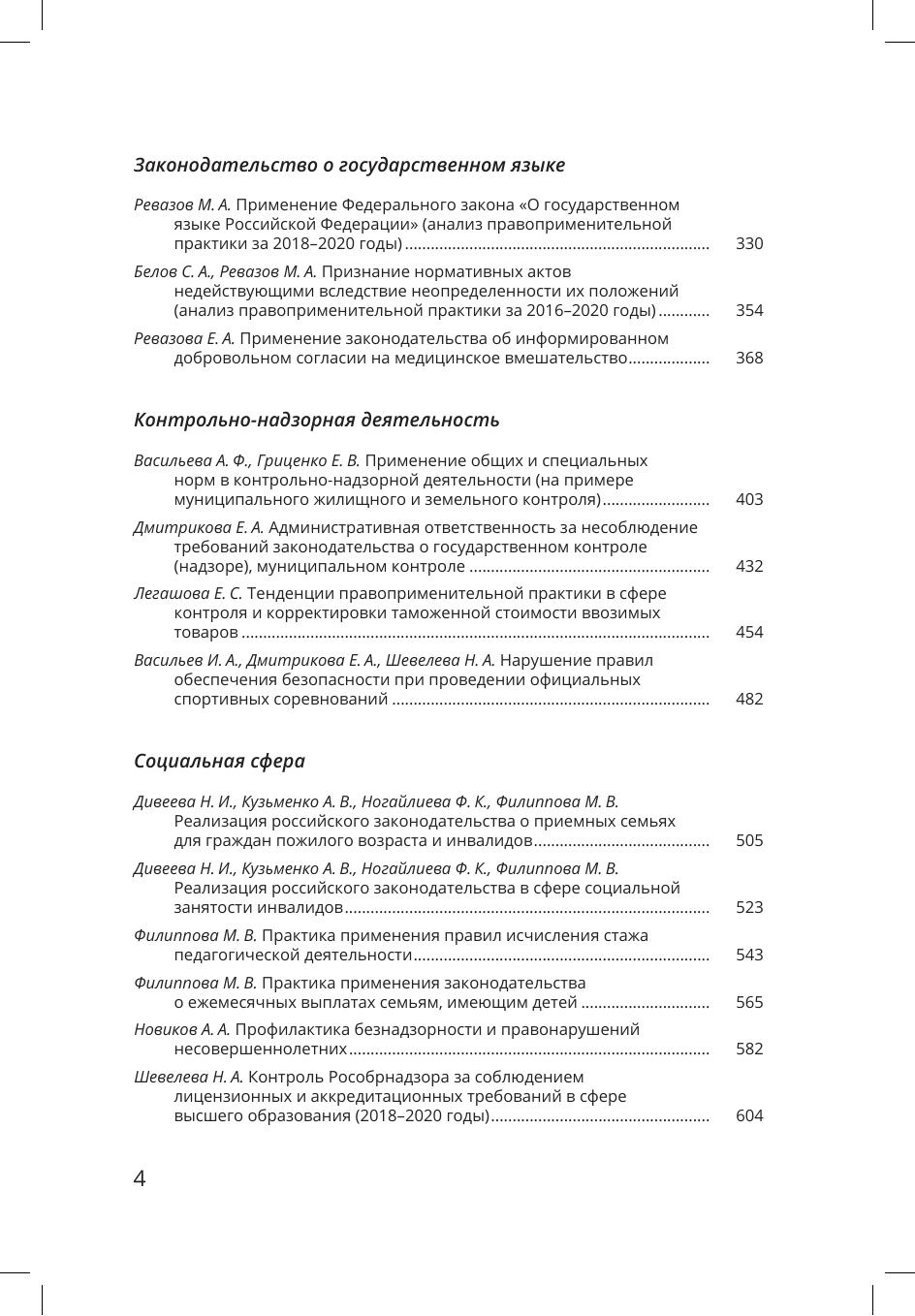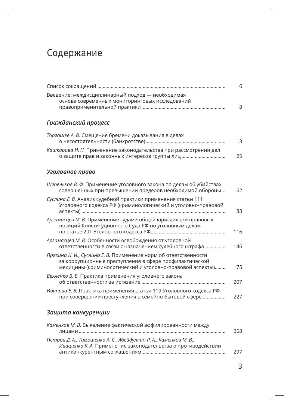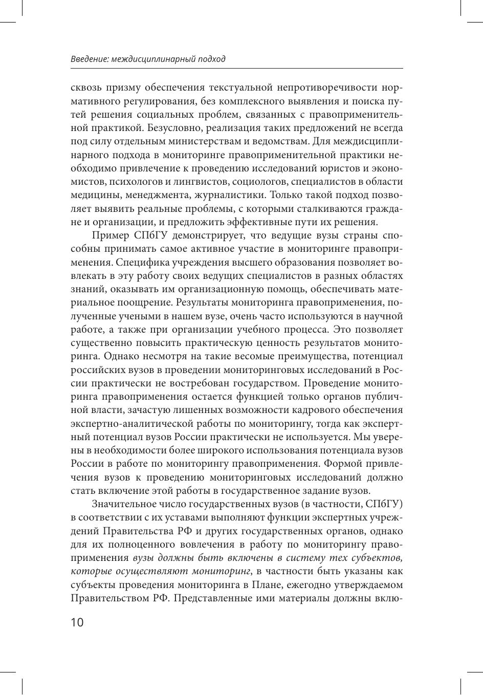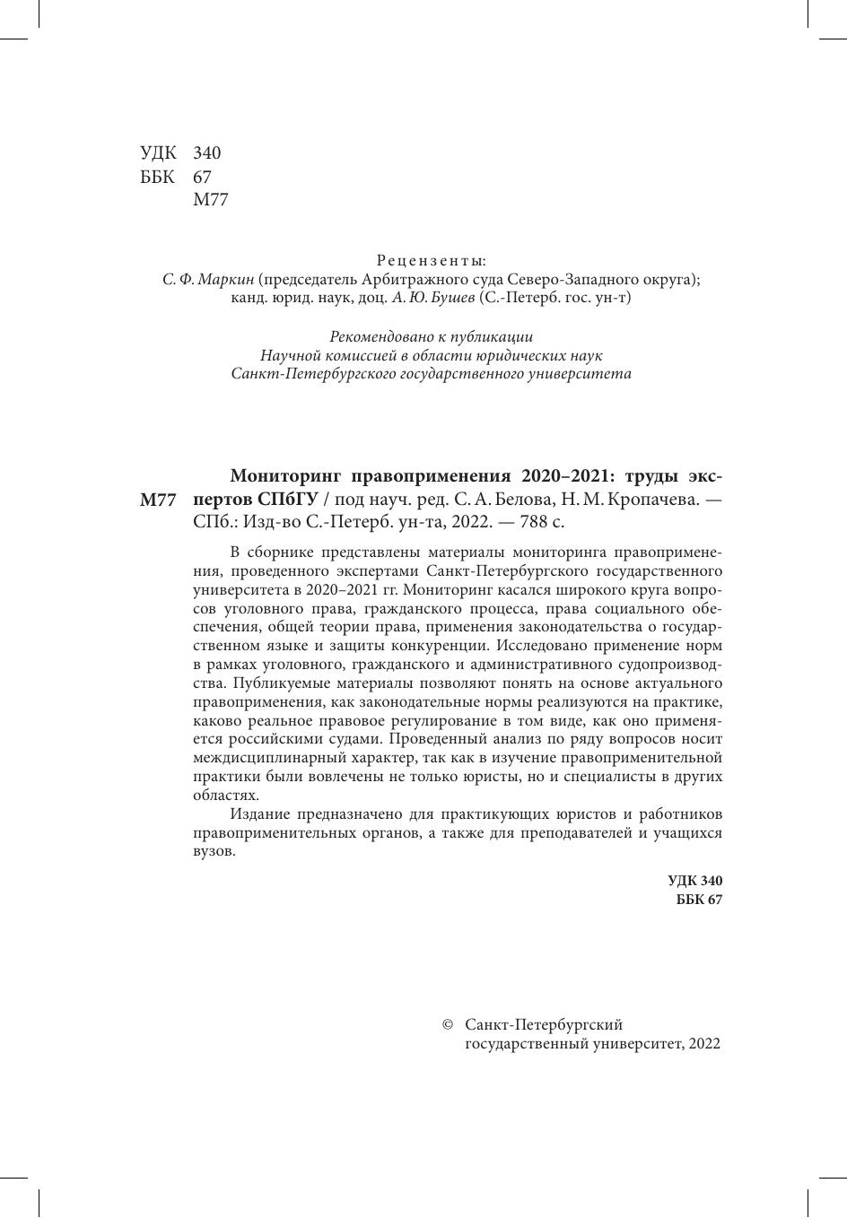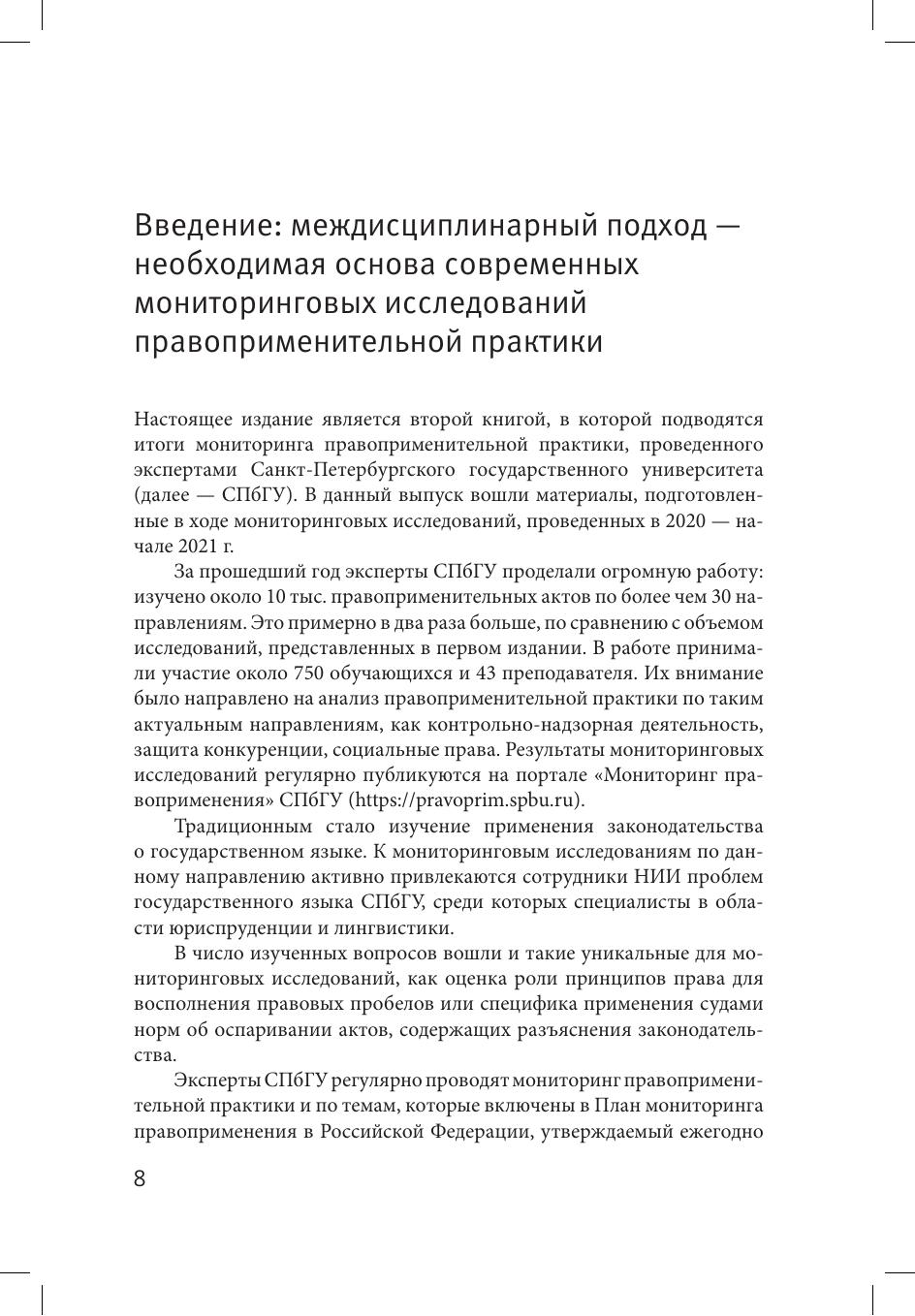 В сборнике представлены материалы мониторинга правоприменения, проведенного экспертами Санкт-Петербургского государственного университета в 2020-2021 гг. Мониторинг касался широкого круга вопросов уголовного права, гражданского процесса, права социального обеспечения, общей теории права, применения законодательства о государственном языке и защите конкуренции. Исследовано применение норм в рамках уголовного, гражданского и административного судопроизводства. Публикуемые материалы позволяют понять на основе актуального правоприменения, как законодательные нормы реализуются на практике, каково реальное правовое регулирование в том виде, как оно применяется российскими судами. Проведенный анализ по ряду вопросов носит междисциплинарный характер, так как в изучение правоприменительной практики были вовлечены не только юристы, но и специалисты в других областях.