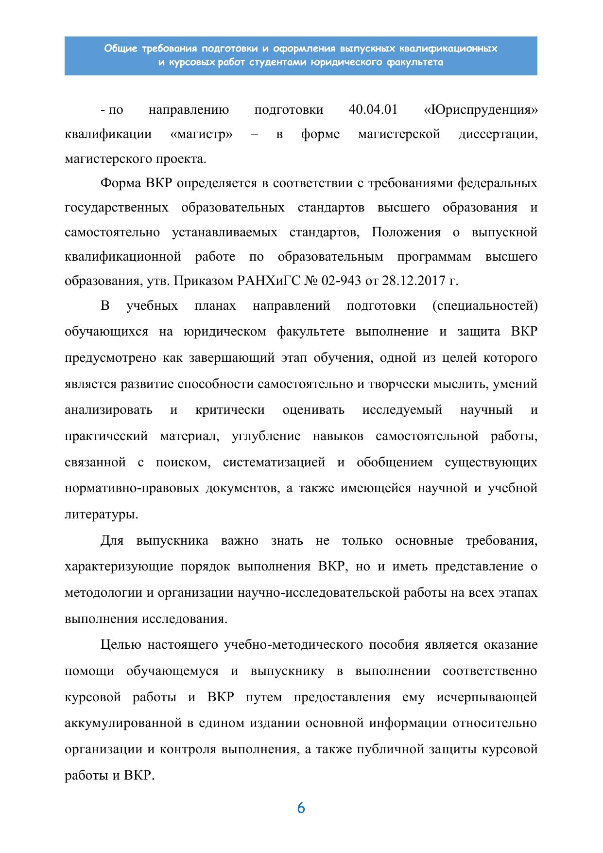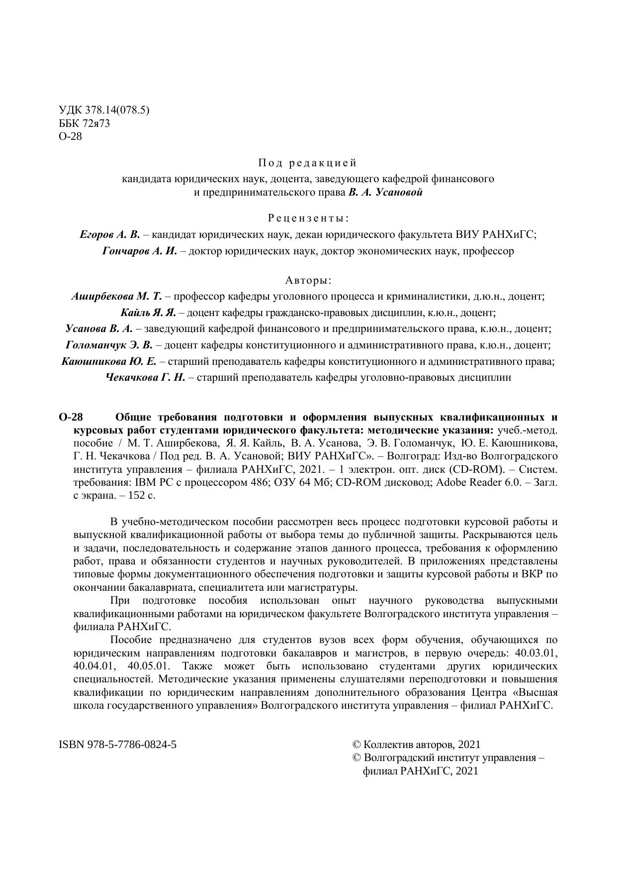 В учебно-методическом пособии рассмотрен весь процесс подготовки курсовой работы и выпускной квалификационной работы от выбора темы до публичной защиты. Раскрываются цель и задачи, последовательность и содержание этапов данного процесса, требования к оформлению работ, права и обязанности студентов и научных руководителей. В приложениях представлены типовые формы документационного обеспечения подготовки и защиты курсовой работы и ВКР по окончании бакалавриата, специалитета или магистратуры. При подготовке пособия использован опыт научного руководства выпускными квалификационными работами на юридическом факультете Волгоградского института управления – филиала РАНХиГС. Пособие предназначено для студентов вузов всех форм обучения, обучающихся по юридическим направлениям подготовки бакалавров и магистров, в первую очередь: 40.03.01, 40.04.01, 40.05.01. Также может быть использовано студентами других юридических специальностей. Методические указания применены слушателями переподготовки и повышения квалификации по юридическим направлениям дополнительного образования Центра «Высшая школа государственного управления» Волгоградского института управления – филиал РАНХиГС.