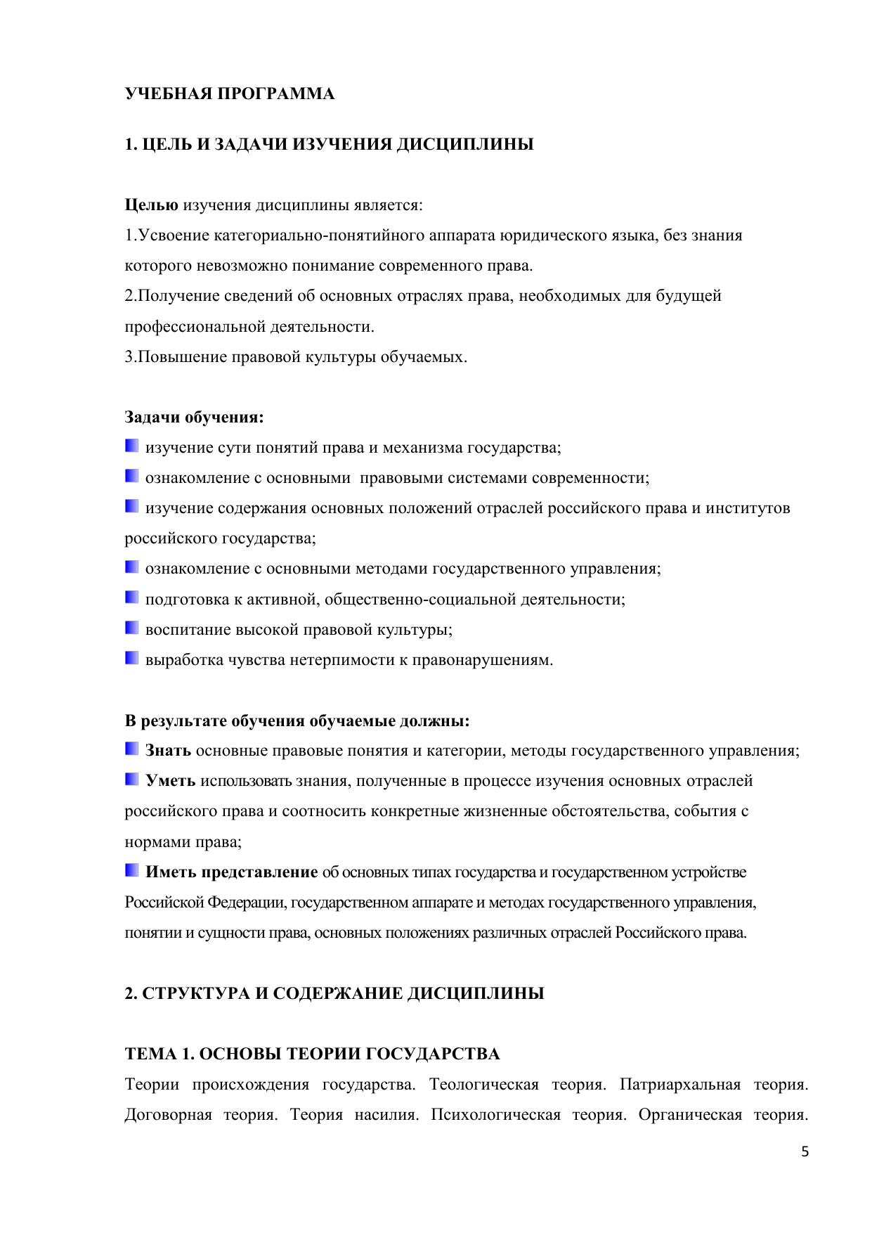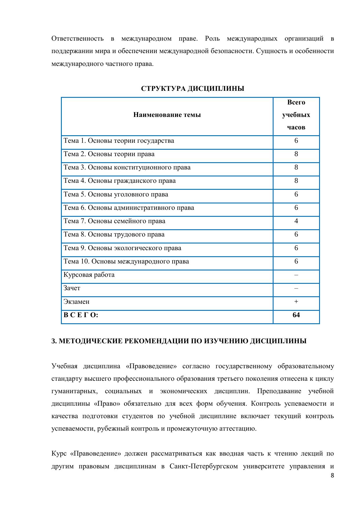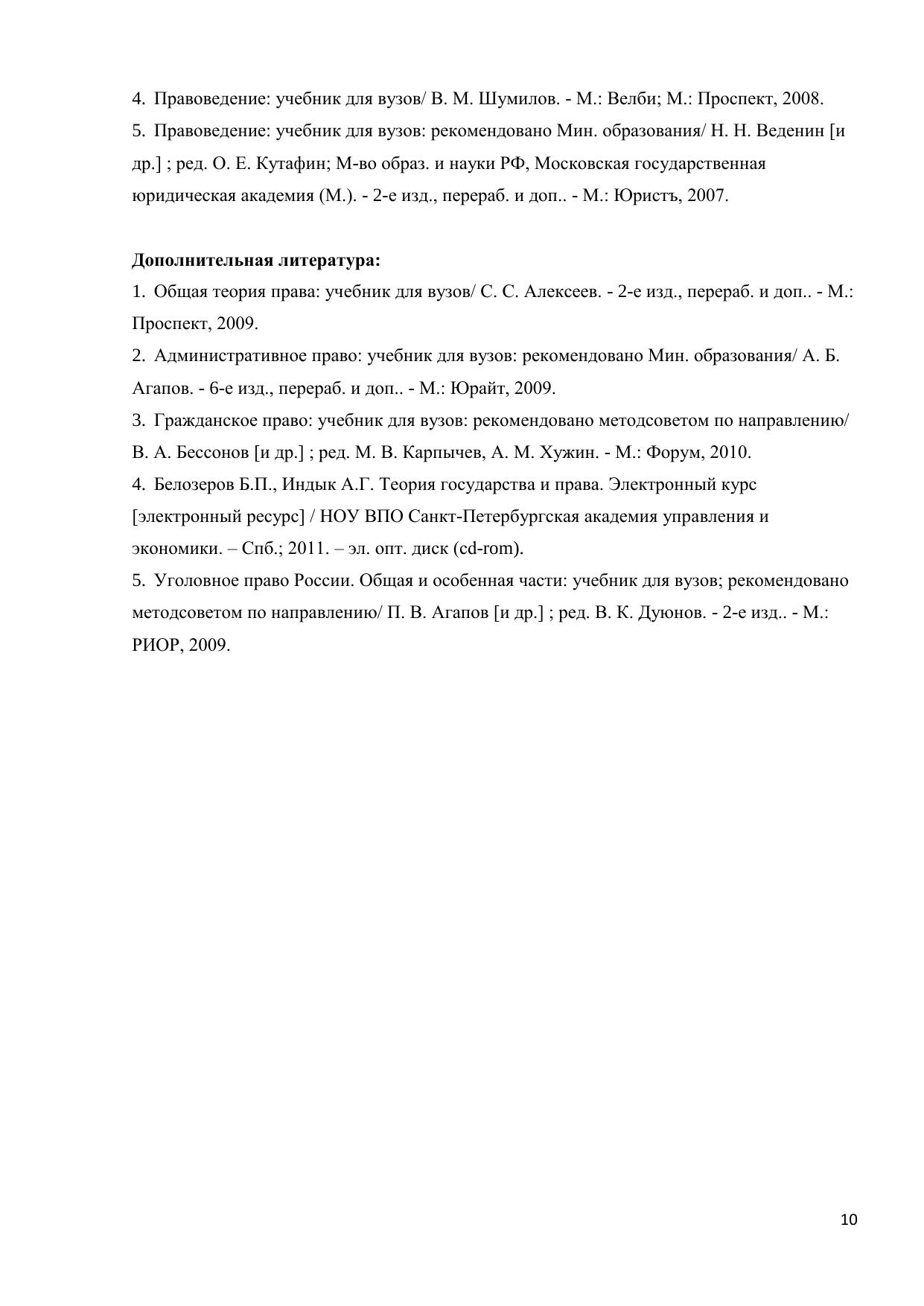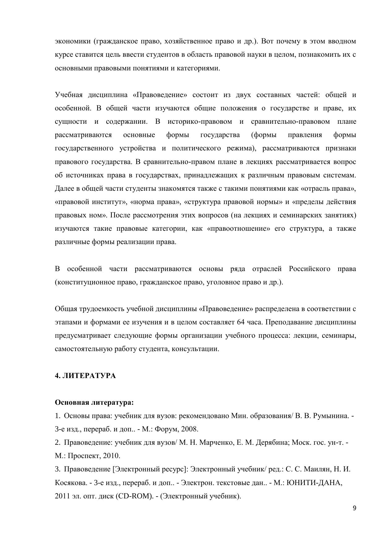 Предлагаемый электронный курс по дисциплине «Правоведение» предусматривает возможность самостоятельного ознакомления студентов всех форм обучения с материалами данного предмета. В курсе лекций студентам дается возможность проверить усвоение материала с помощью контрольных вопросов и тестовых заданий. Одновременно авторы предлагают научную и учебную литературу по данной дисциплине, что будет способствовать более глубокому и объективному анализу основных отраслей Российского права. Данный электронный курс соответствует Государственному стандарту высшего профессионального образования второго поколения и учебно-методическому комплексу по дисциплине «Правоведение». Электронный курс состоит из: 1) Структурно-логической схемы изучения дисциплины, включающей в себя программу курса и распределение учебного времени, по темам и видам учебных занятий. 2) Курса лекций по учебной дисциплине «Правоведение и права» в соответствии с программой. 3) Научной и учебной литературы по всем темам курса лекций. Электронный курс по дисциплине «Правоведение» предназначен в качестве учебного пособия, для студентов всех форм обучения, по специальности 030500 и 030501 «Юриспруденция».
