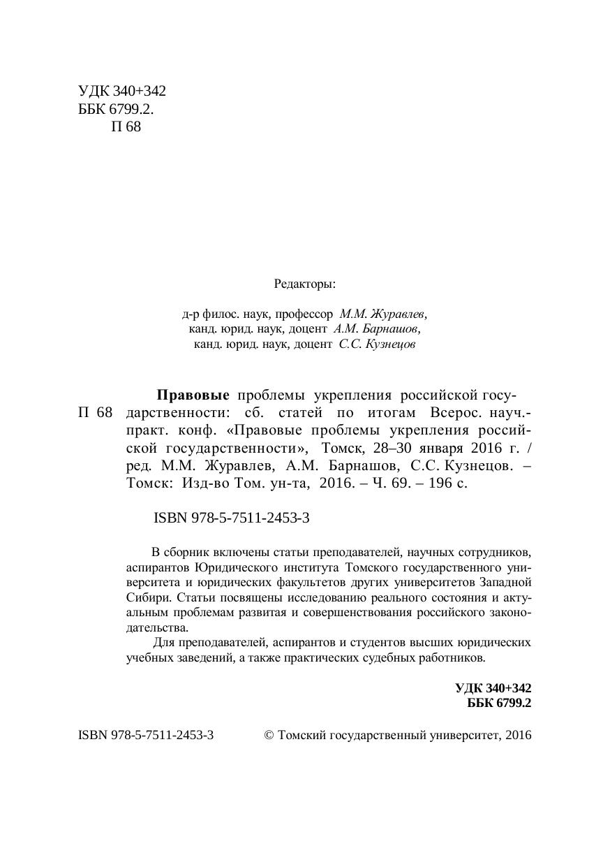 Представлены статьи преподавателей, научных сотрудников, аспирантов Юридического института ТГУ и юридических факультетов других университетов Западной Сибири. Исследуются реальное состояние и актуальные проблемы развития и совершенствования российского законодательства, авторами вносятся предложения по совершенствованию и повышению эффективности нормативного регулирования в различных отраслях права. Для преподавателей, аспирантов и студентов высших юридических учебных заведений, а также практических судебных работников.