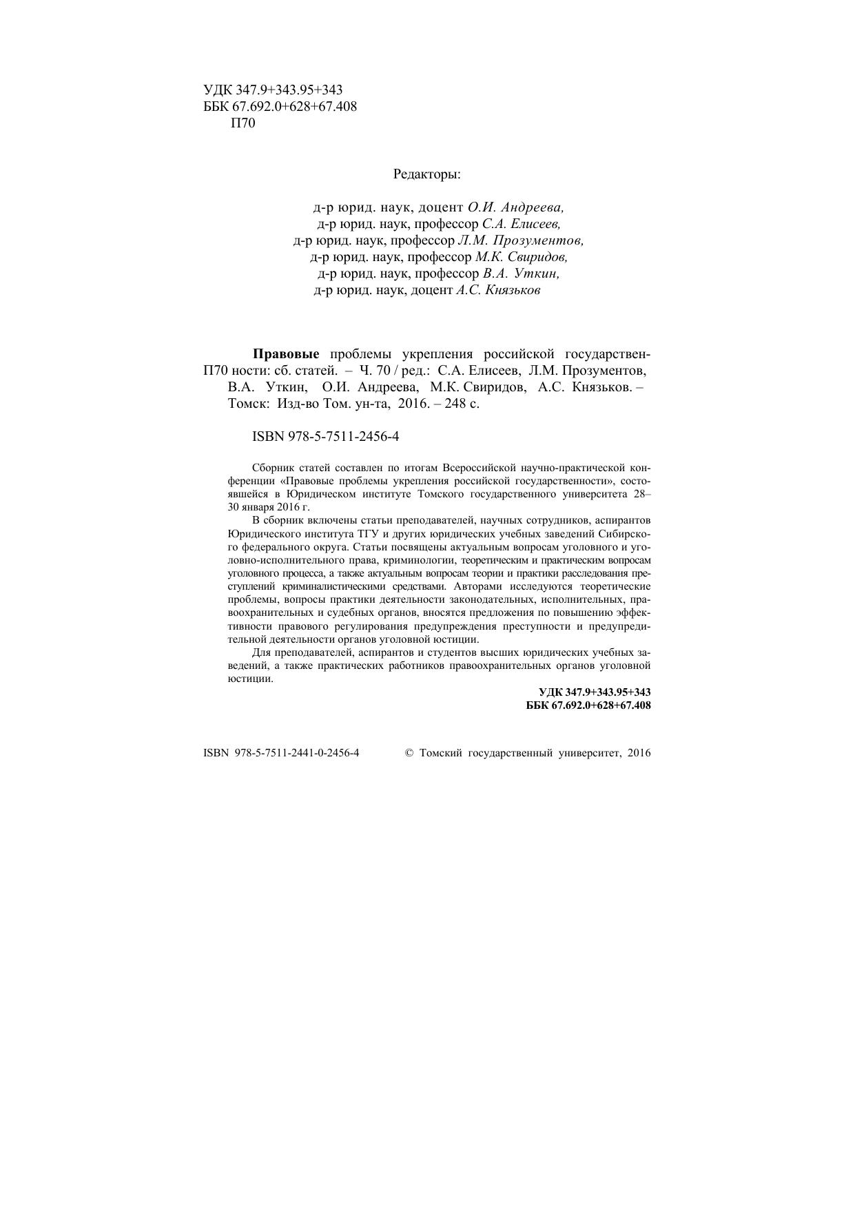 Сборник статей составлен по итогам Всероссийской научно-практической конференции «Правовые проблемы укрепления российской государственности», состоявшейся в Юридическом институте Томского государственного университета 28–30 января 2016 г. В сборник включены статьи преподавателей, научных сотрудников, аспирантов Юридического института ТГУ и других юридических учебных заведений Сибирского федерального округа. Статьи посвящены актуальным вопросам уголовного и уголовно-исполнительного права, криминологии, теоретическим и практическим вопросам уголовного процесса, а также актуальным вопросам теории и практики расследования преступлений криминалистическими средствами. Авторами исследуются теоретические проблемы, вопросы практики деятельности законодательных, исполнительных, правоохранительных и судебных органов, вносятся предложения по повышению эффективности правового регулирования предупреждения преступности и предупредительной деятельности органов уголовной юстиции. Для преподавателей, аспирантов и студентов высших юридических учебных заведений, а также практических работников правоохранительных органов уголовной юстиции.
