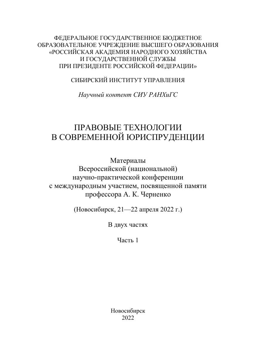 Правовые технологии в современной юриспруденции : материалы Всерос. (национальной) науч.-практ. конф. с междунар. участием, посвященной памяти проф. А. К. Черненко (Новосибирск, 21—22 апреля 2022 г.): в 2 ч.— Ч. 1