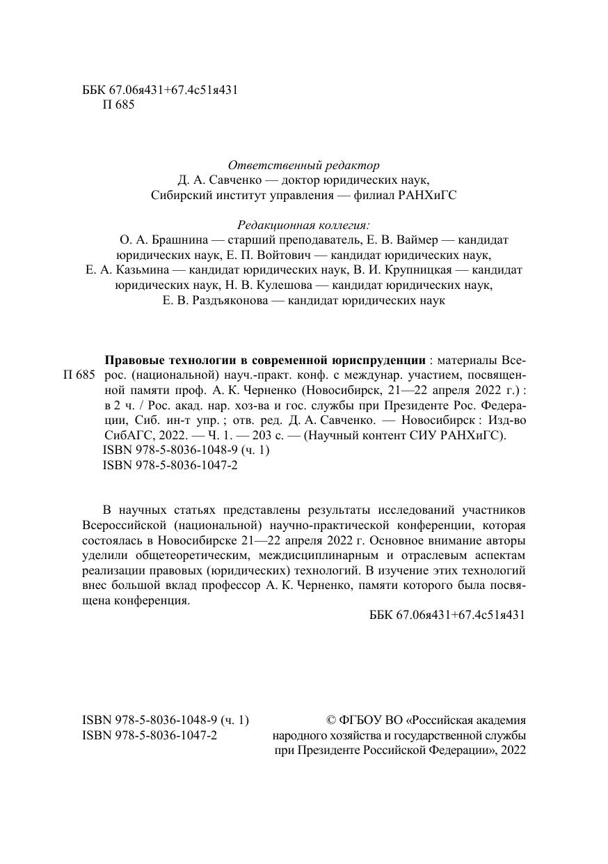 В научных статьях представлены результаты исследований участников Всероссийской (национальной) научно-практической конференции, которая состоялась в Новосибирске 21—22 апреля 2022 г. Основное внимание авторы уделили общетеоретическим, междисциплинарным и отраслевым аспектам реализации правовых (юридических) технологий. В изучение этих технологий внес большой вклад профессор А. К. Черненко, памяти которого была посвя-щена конференция.