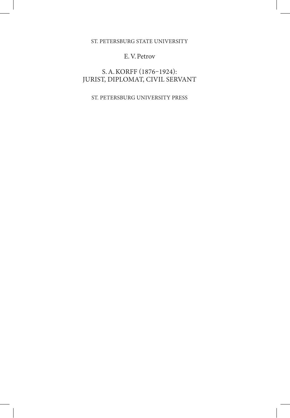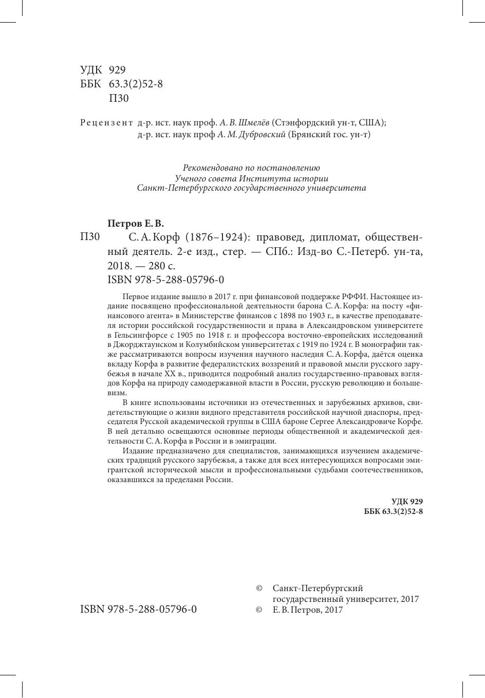 Первое издание вышло в 2017 г. при финансовой поддержке РФФИ. Настоящее издание посвящено профессиональной деятельности барона С. А. Корфа: на посту «финансового агента» в Министерстве финансов с 1898 по 1903 г., в качестве преподавателя истории российской государственности и права в Александровском университете в Гельсингфорсе с 1905 по 1918 г. и профессора восточно-европейских исследований в Джорджтаунском и Колумбийском университетах с 1919 по 1924 г. В монографии также рассматриваются вопросы изучения научного наследия С. А. Корфа, даётся оценка вкладу Корфа в развитие федералистских воззрений и правовой мысли русского зарубежья в начале XX в., приводится подробный анализ государственно-правовых взглядов Корфа на природу самодержавной власти в России, русскую революцию и большевизм.