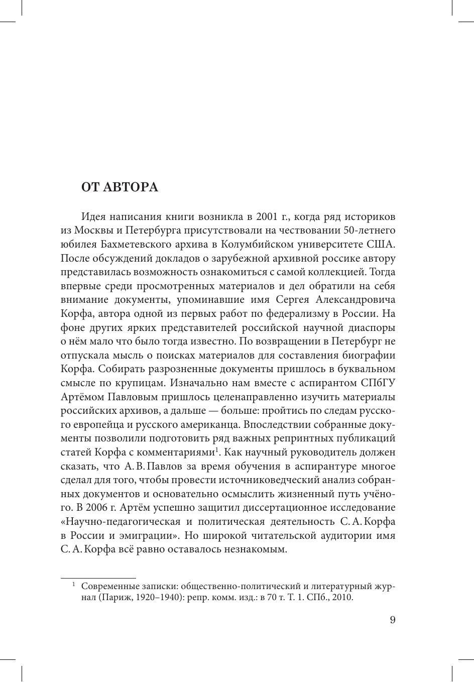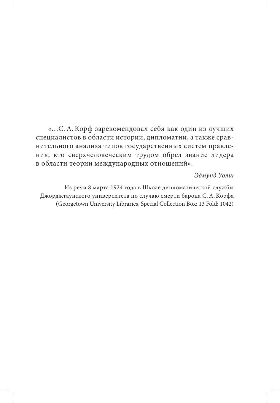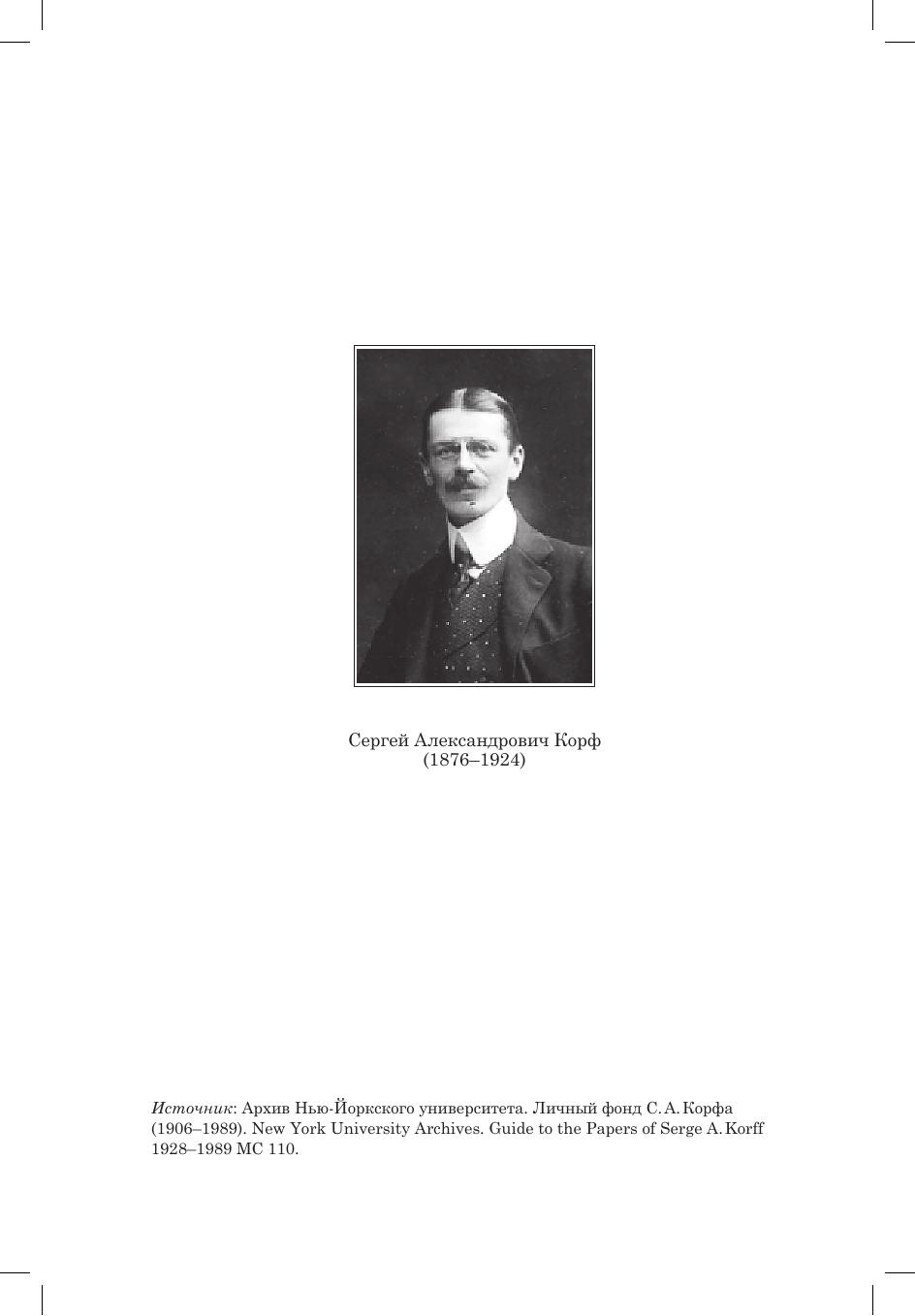 В книге использованы источники из отечественных и зарубежных архивов, свидетельствующие о жизни видного представителя российской научной диаспоры, председателя Русской академической группы в США бароне Сергее Александровиче Корфе. В ней детально освещаются основные периоды общественной и академической деятельности С. А. Корфа в России и в эмиграции.