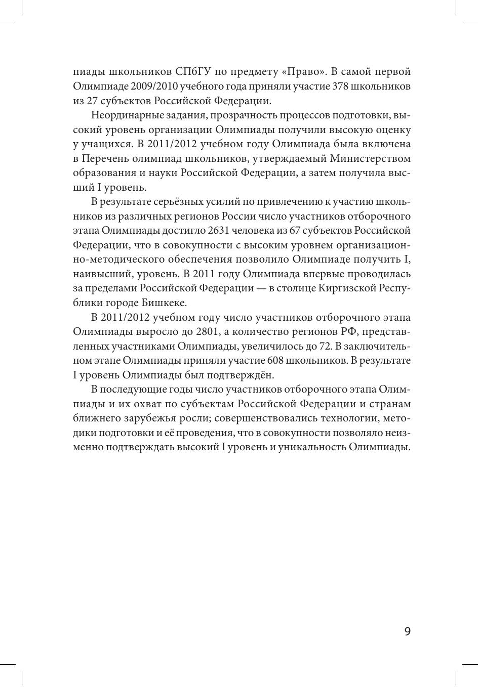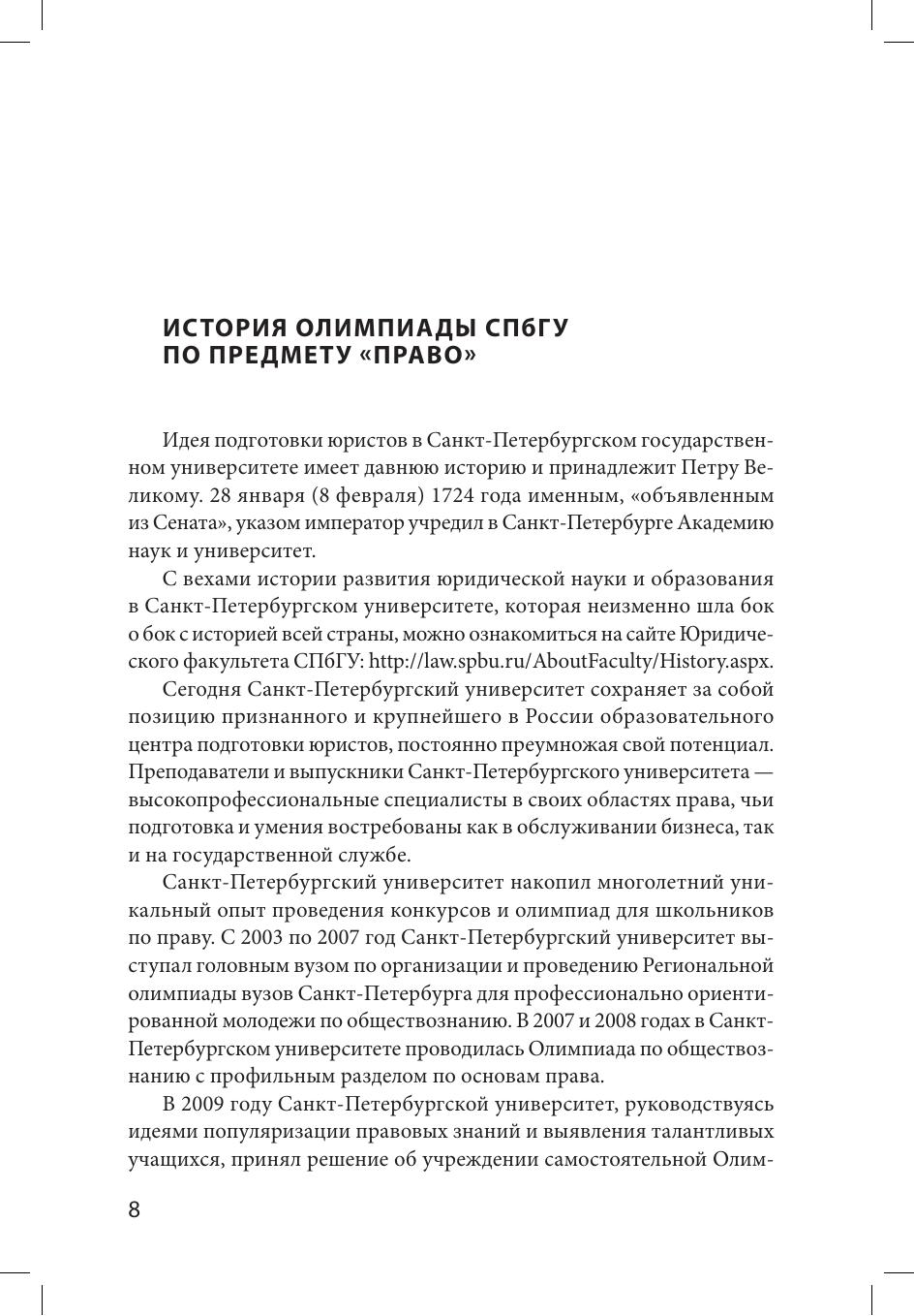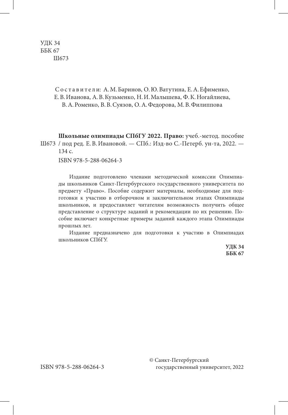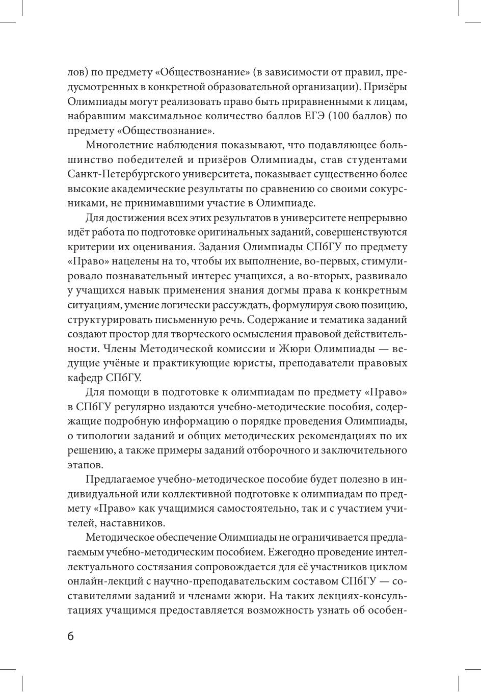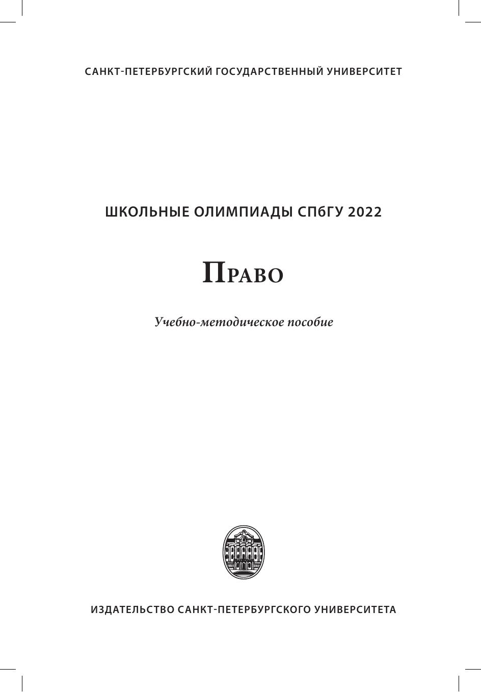 Издание подготовлено членами методической комиссии Олимпиады школьников Санкт-Петербургского государственного университета по предмету "Право". Пособие содержит материалы, необходимые для подготовки к участию в отборочном и заключительном этапах Олимпиады школьников, и предоставляет читателям возможность получить общее представление о структуре заданий и рекомендации по их решению. Пособие включает конкретные примеры заданий каждого этапа Олимпиады прошлых лет. Издание предназначено для подготовки к участию в Олимпиаде школьников СПбГУ.