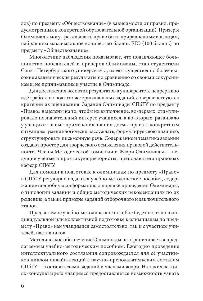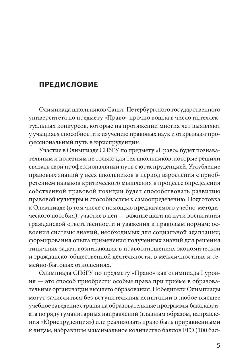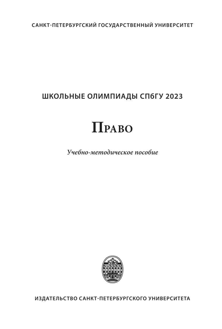 Издание подготовлено членами методической комиссии Олимпиады школьников Санкт-Петербургского государственного университета по предмету "Право". Пособие содержит материалы, необходимые для подготовки к участию в отборочном и заключительном этапах Олимпиады школьников, и предоставляет читателям возможность получить общее представление о структуре заданий и рекомендации по их решению. Пособие включает конкретные примеры заданий каждого этапа Олимпиады прошлых лет. Издание предназначено для подготовки к участию в Олимпиадах школьников СПбГУ.