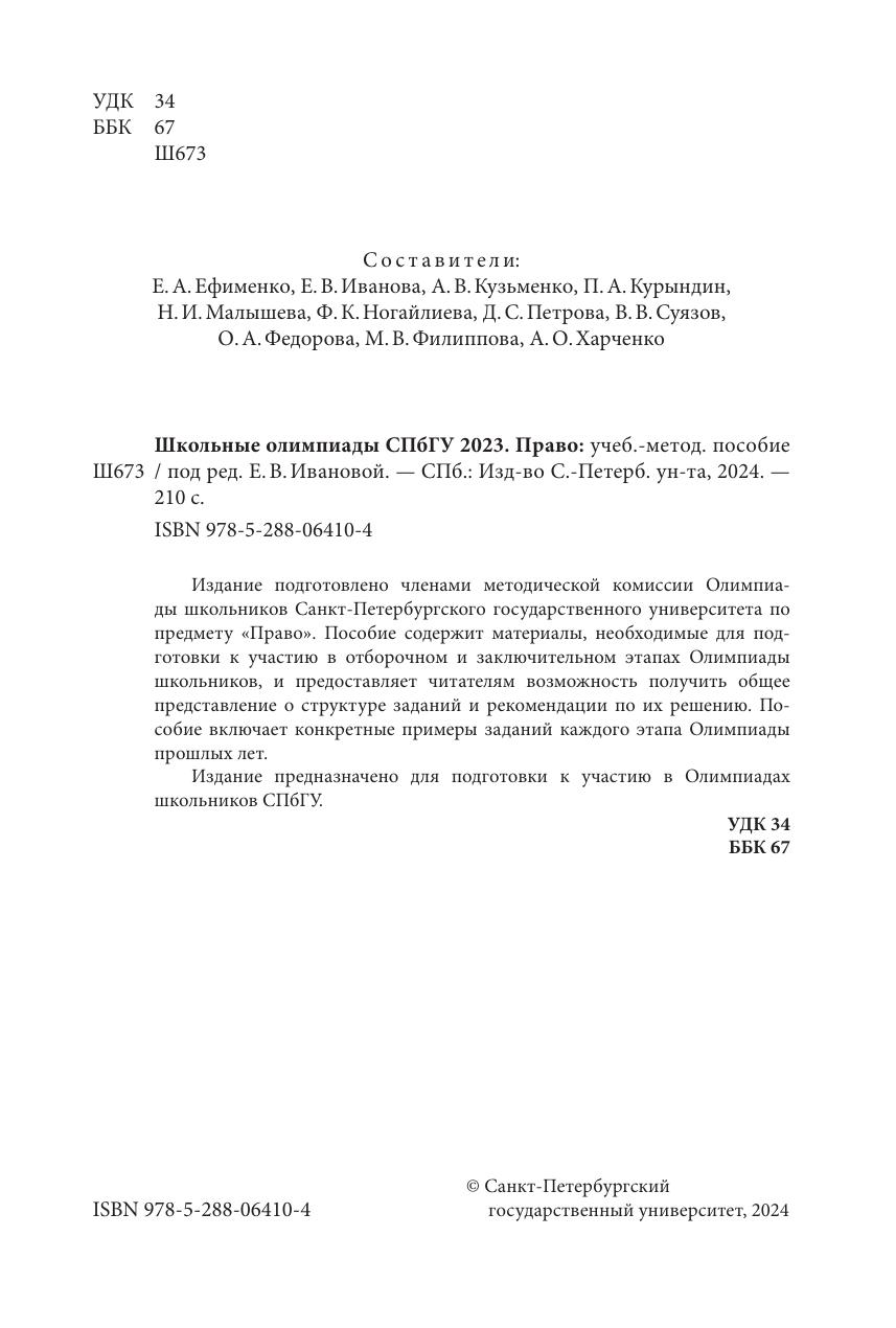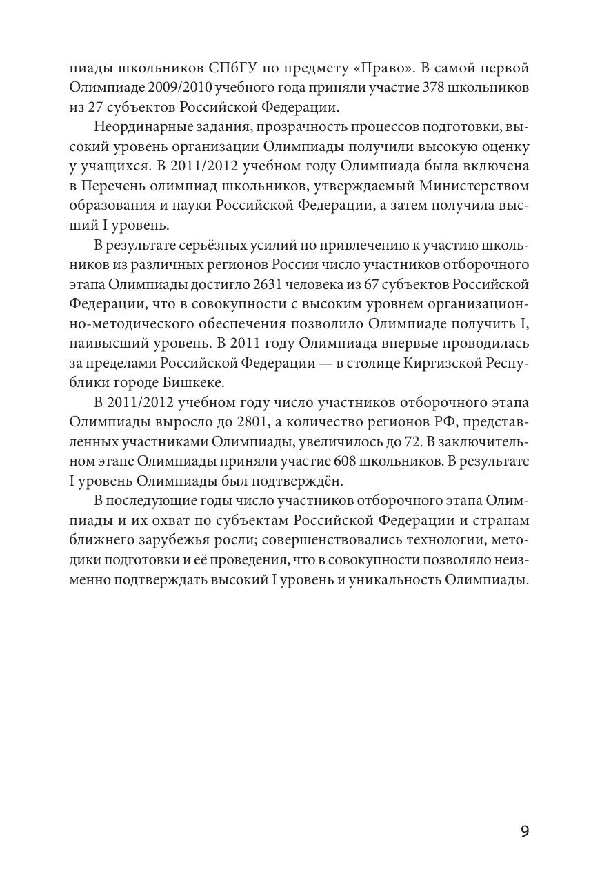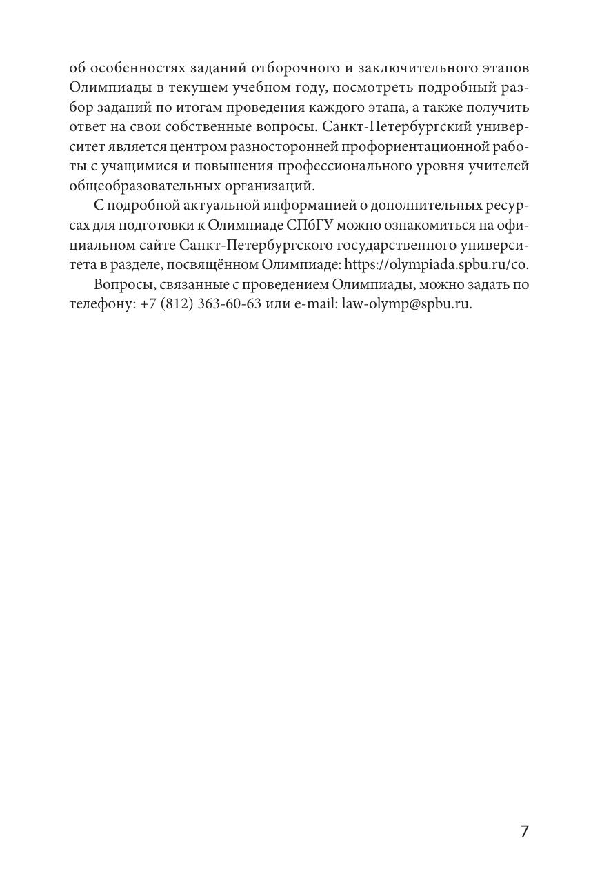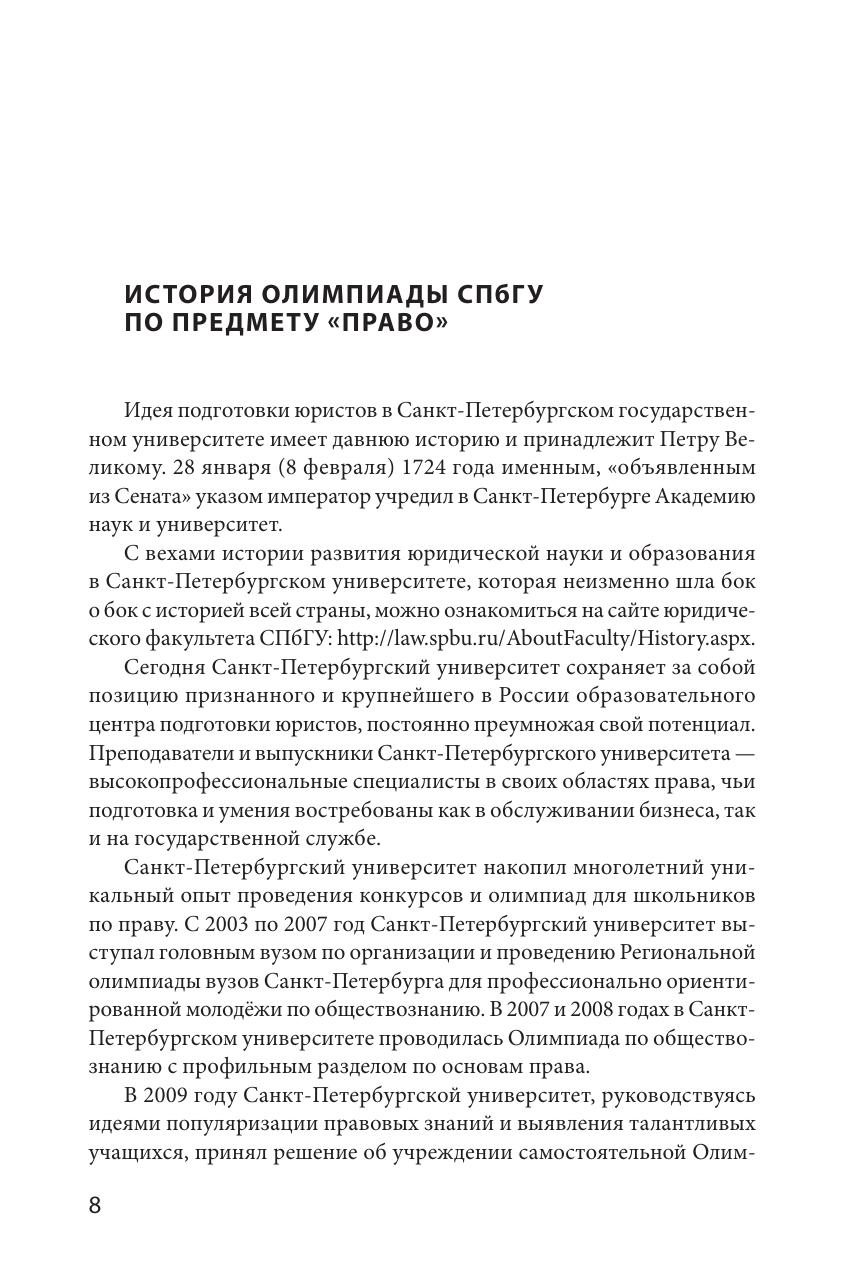 Издание подготовлено членами методической комиссии Олимпиады школьников Санкт-Петербургского государственного университета по предмету "Право". Пособие содержит материалы, необходимые для подготовки к участию в отборочном и заключительном этапах Олимпиады школьников, и предоставляет читателям возможность получить общее представление о структуре заданий и рекомендации по их решению. Пособие включает конкретные примеры заданий каждого этапа Олимпиады прошлых лет. Издание предназначено для подготовки к участию в Олимпиадах школьников СПбГУ.