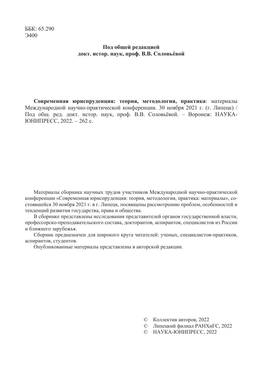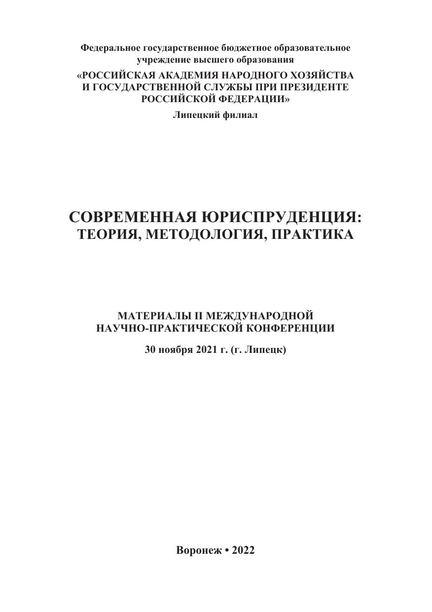 Современная юриспруденция: теория, методология, практика: материалы Международной научно-практической конференции. 30 ноября 2021 г. (г. Липецк)