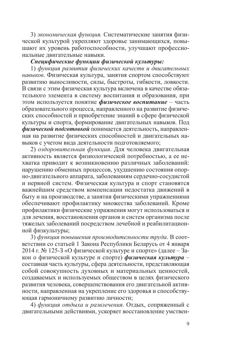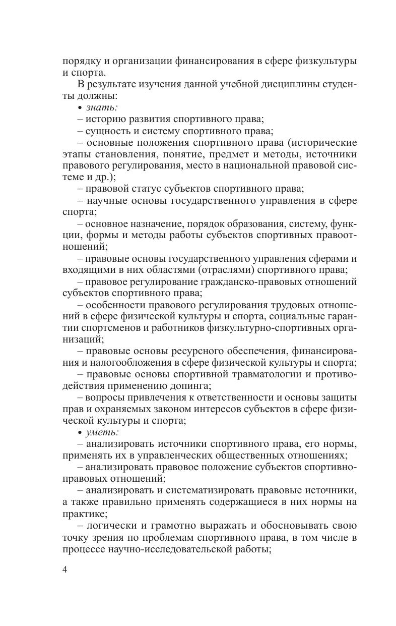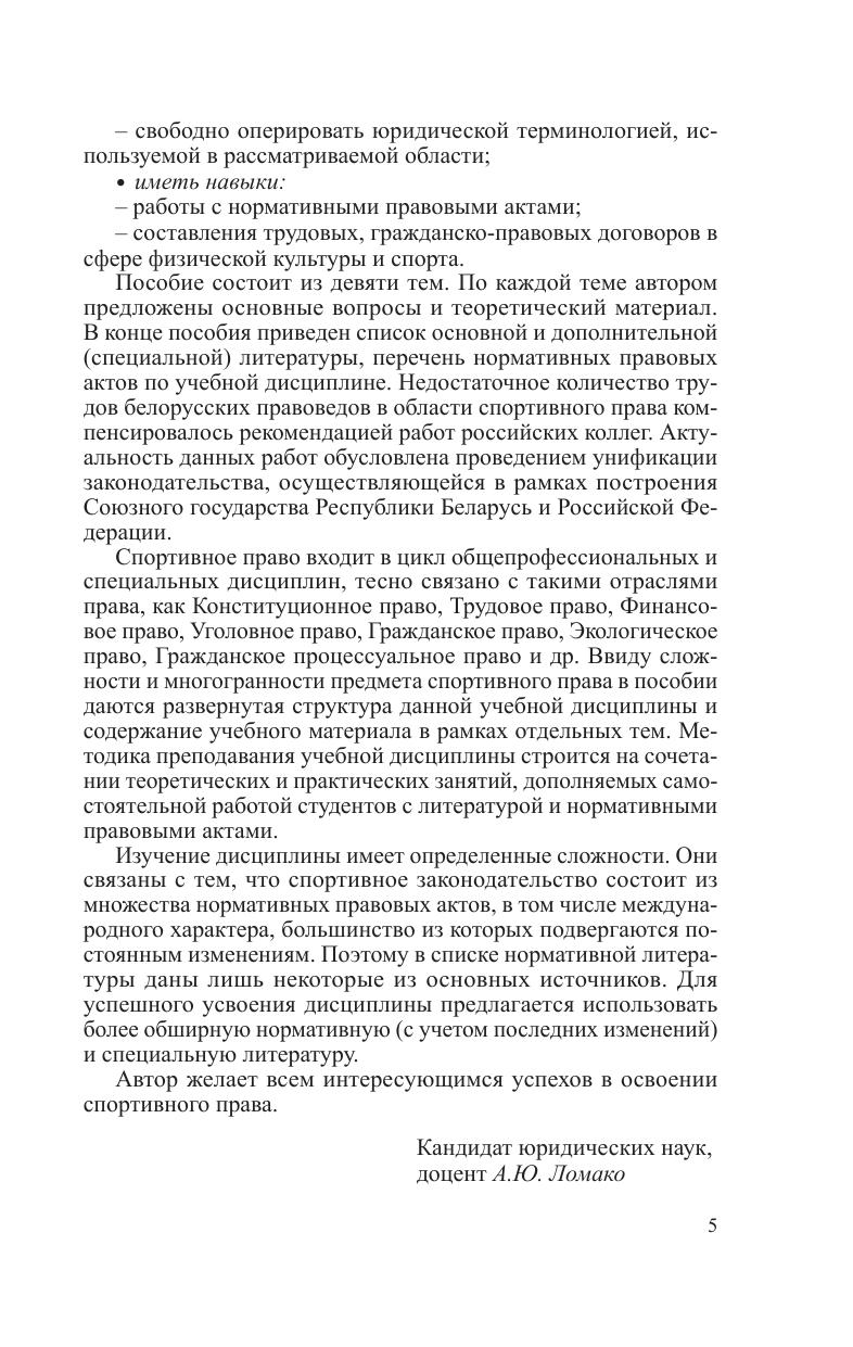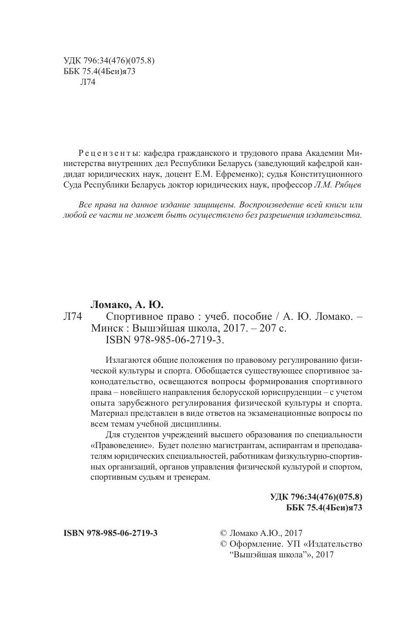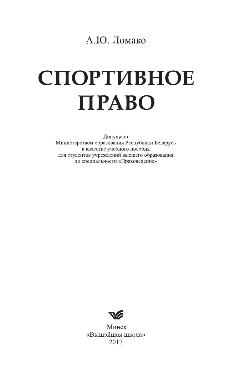 Излагаются общие положения по правовому регулированию физической культуры и спорта. Обобщается существующее спортивное законодательство, освещаются вопросы формирования спортивного права – новейшего направления белорусской юриспруденции – с учетом опыта зарубежного регулирования физической культуры и спорта. Материал представлен в виде ответов на экзаменационные вопросы по всем темам учебной дисциплины. Для студентов учреждений высшего образования по специальности «Правоведение». Будет полезно магистрантам, аспирантам и преподавателям юридических специальностей, работникам физкультурно-спортивных организаций, органов управления физической культурой и спортом, спортивным судьям и тренерам