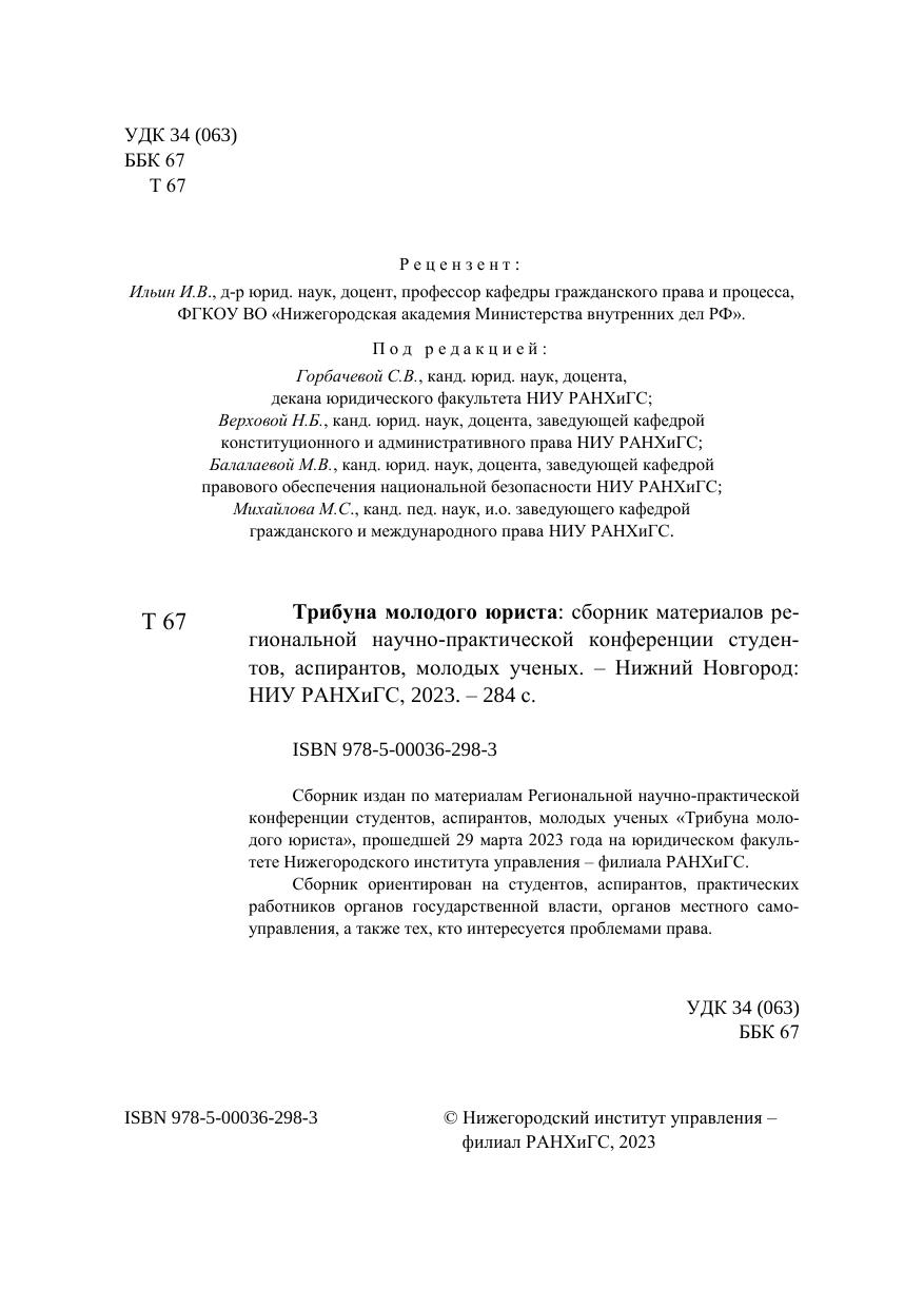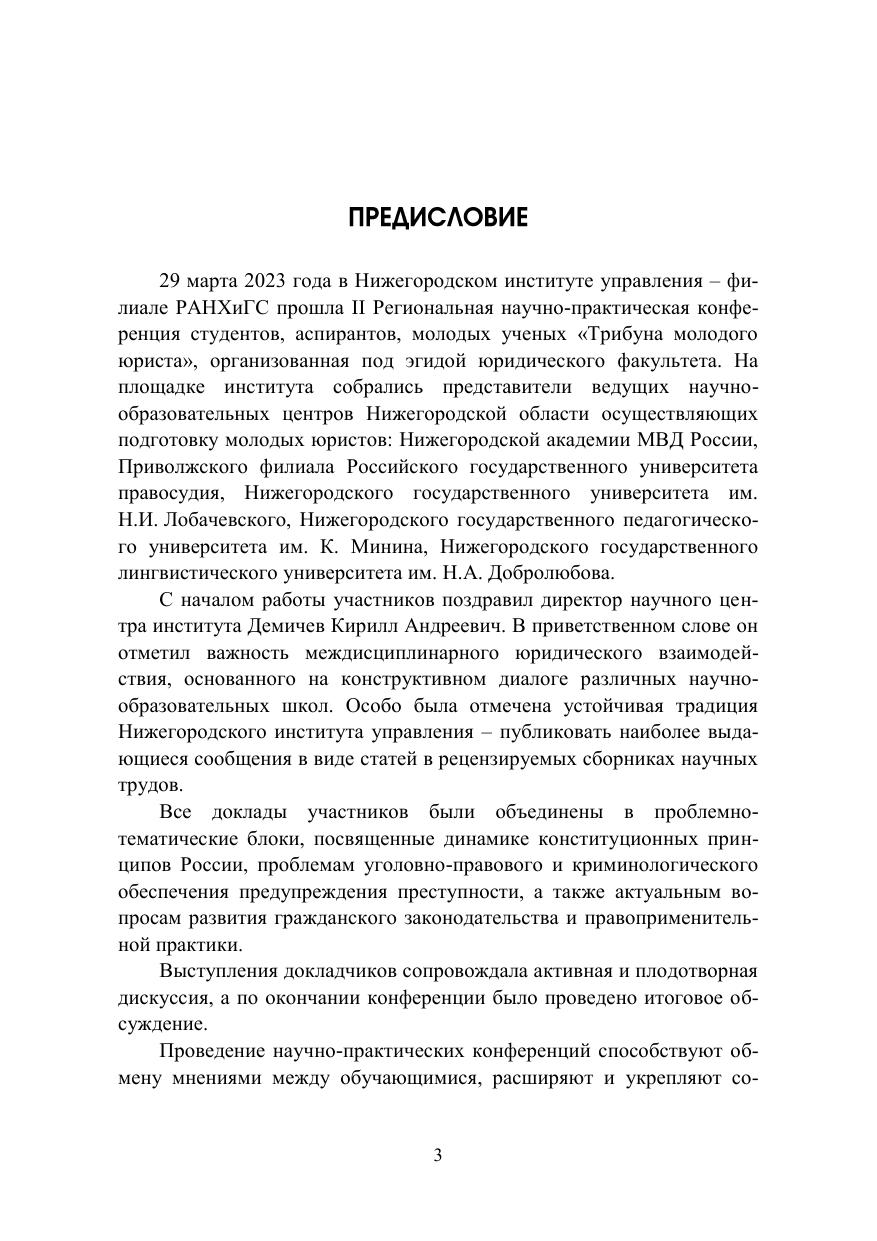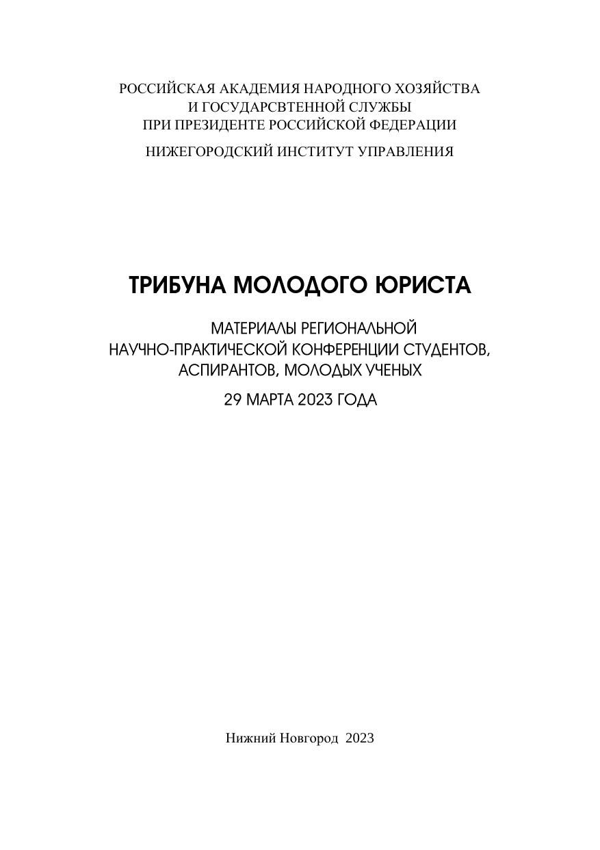 Сборник издан по материалам Региональной научно-практической конференции студентов, аспирантов, молодых ученых «Трибуна моло-дого юриста», прошедшей 29 марта 2023 года на юридическом факуль-тете Нижегородского института управления – филиала РАНХиГС. Сборник ориентирован на студентов, аспирантов, практических работников органов государственной власти, органов местного само-управления, а также тех, кто интересуется проблемами права.