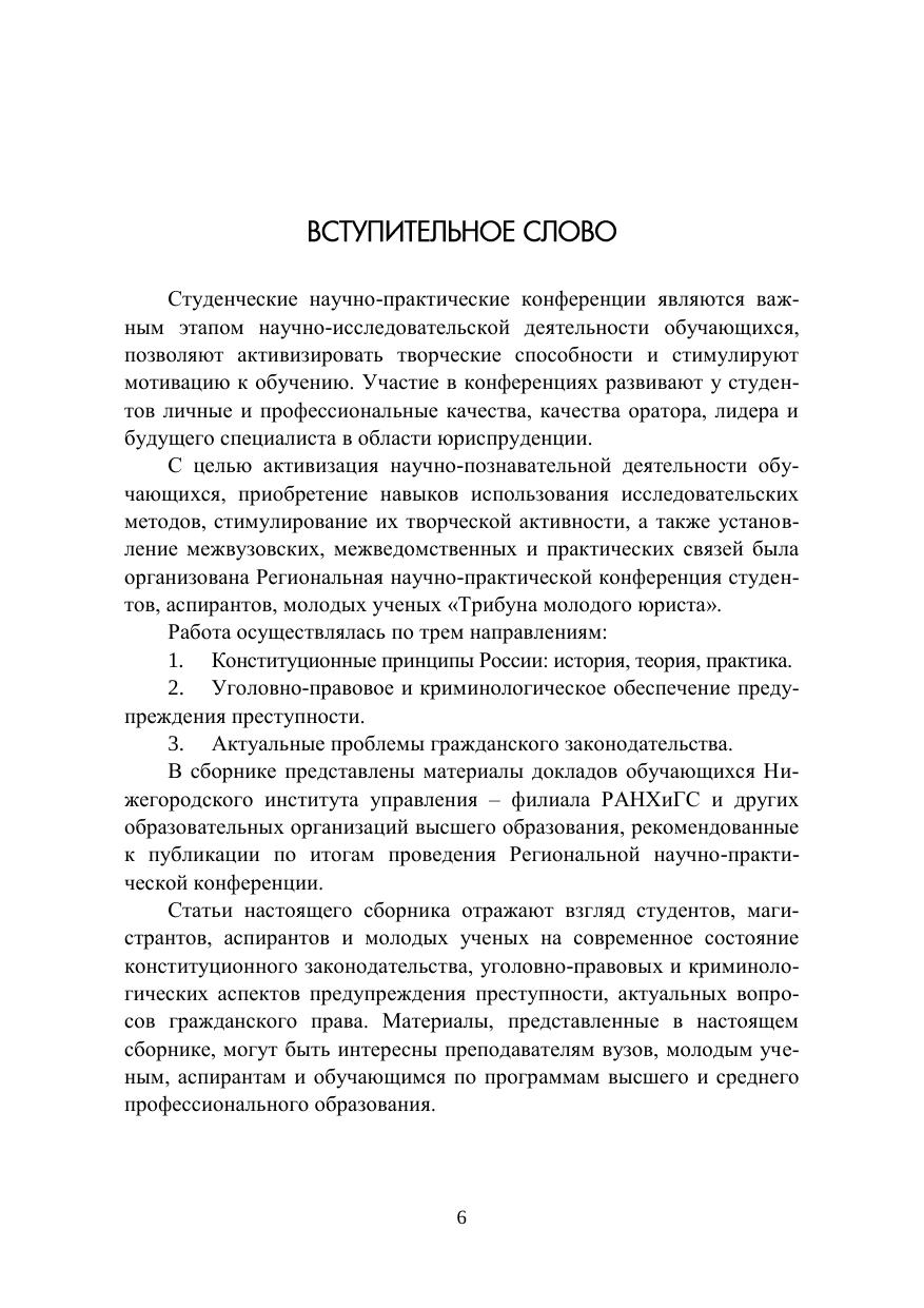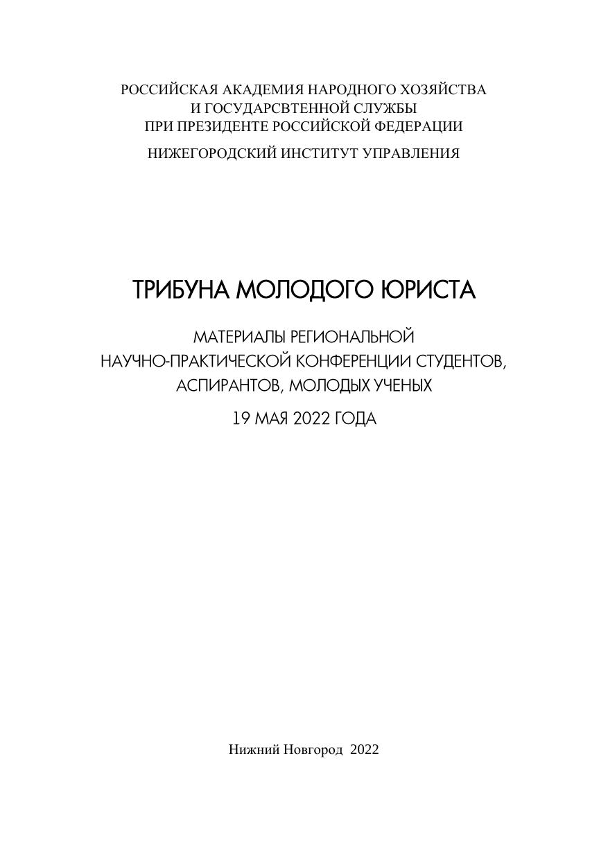 Сборник издан по материалам региональной научно-практической конференции студентов, аспирантов, молодых ученых «Трибуна моло-дого юриста», прошедшего 19 мая 2022 года на юридическом факульте-те Нижегородского института управления – филиала РАНХиГС. Сборник ориентирован на студентов, аспирантов, практических работников органов государственной власти, органов местного само-управления, а также тех, кто интересуется проблемами права.