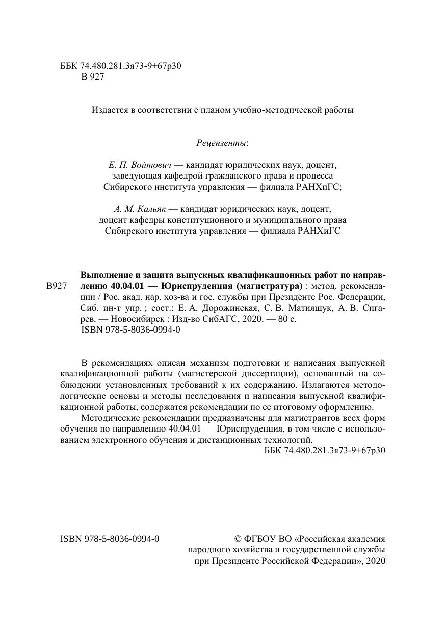 В рекомендациях описан механизм подготовки и написания выпускной квалификационной работы (магистерской диссертации), основанный на со-блюдении установленных требований к их содержанию. Излагаются методо-логические основы и методы исследования и написания выпускной квалифи-кационной работы, содержатся рекомендации по ее итоговому оформлению. Методические рекомендации предназначены для магистрантов всех форм обучения по направлению 40.04.01 — Юриспруденция, в том числе с использо-ванием электронного обучения и дистанционных технологий.