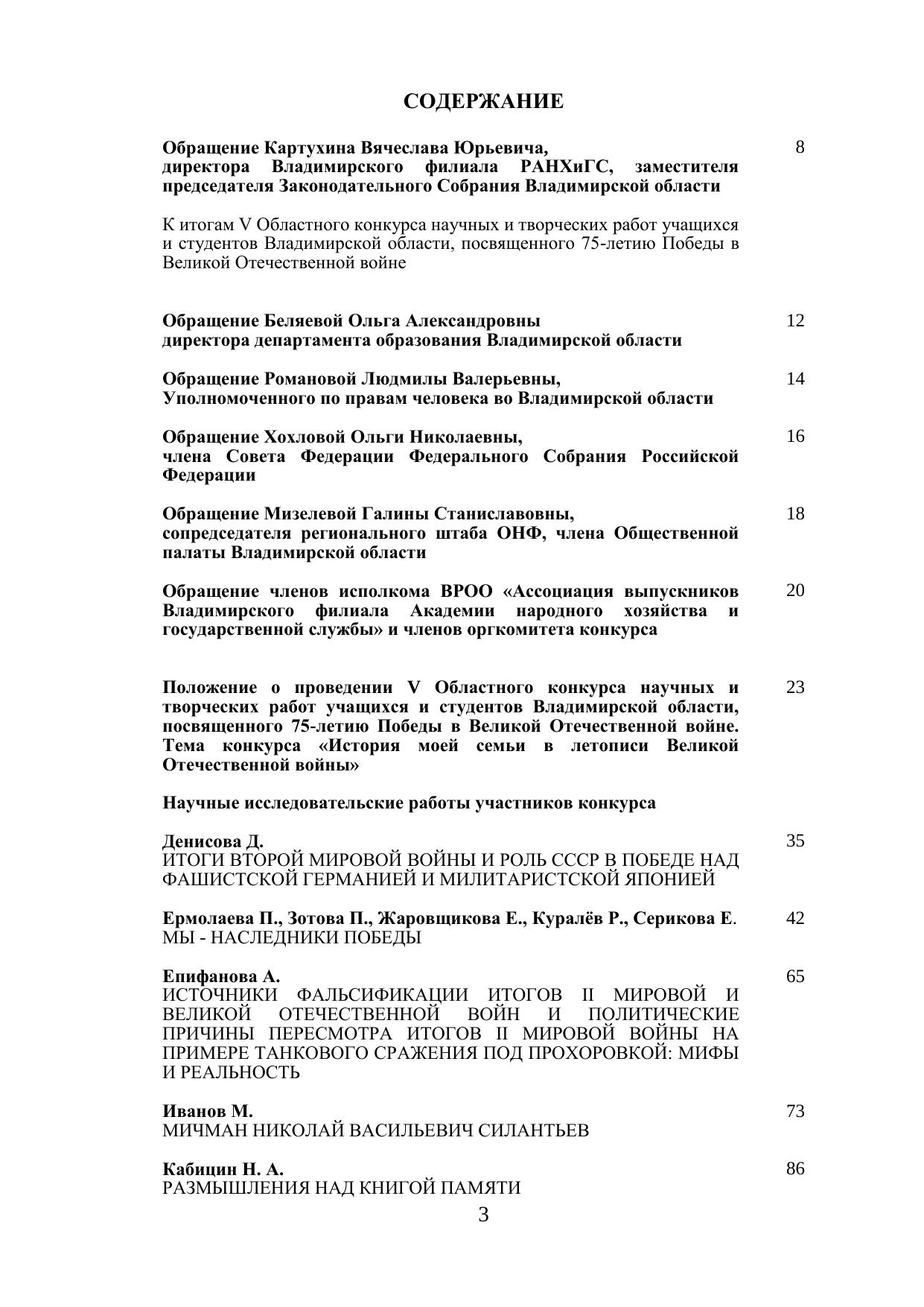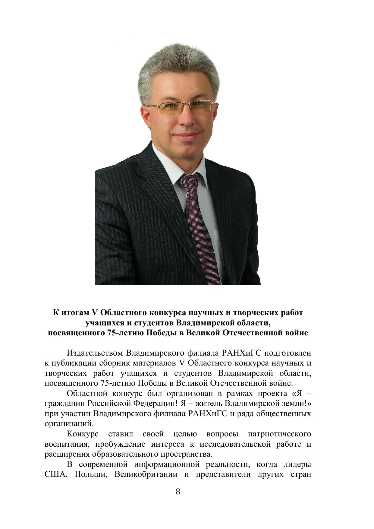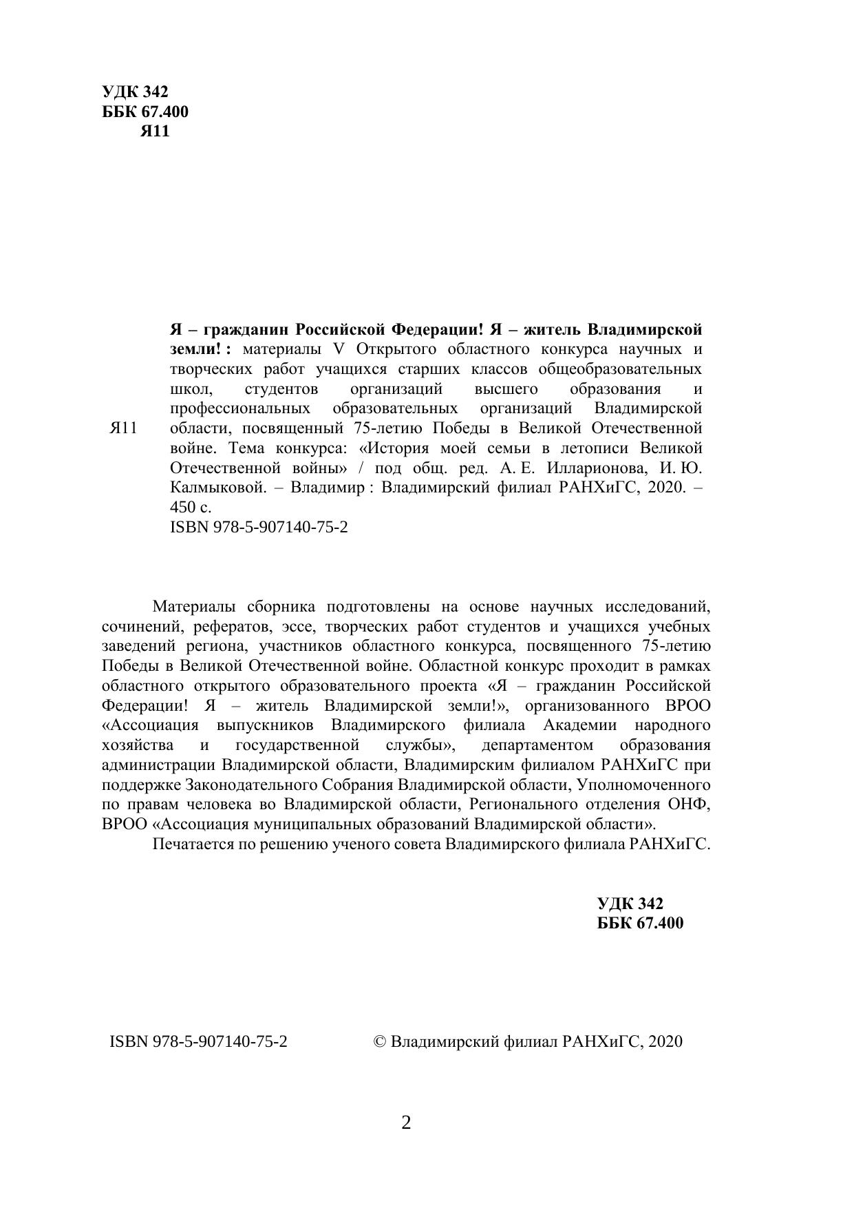 Материалы сборника подготовлены на основе научных исследований, сочинений, рефератов, эссе, творческих работ студентов и учащихся учебных заведений региона, участников областного конкурса, посвященного 75-летию Победы в Великой Отечественной войне. Областной конкурс проходит в рамках областного открытого образовательного проекта «Я – гражданин Российской Федерации! Я – житель Владимирской земли!», организованного ВРОО «Ассоциация выпускников Владимирского филиала Академии народного хозяйства и государственной службы», департаментом образования администрации Владимирской области, Владимирским филиалом РАНХиГС при поддержке Законодательного Собрания Владимирской области, Уполномоченного по правам человека во Владимирской области, Регионального отделения ОНФ, ВРОО «Ассоциация муниципальных образований Владимирской области». Печатается по решению ученого совета Владимирского филиала РАНХиГС.