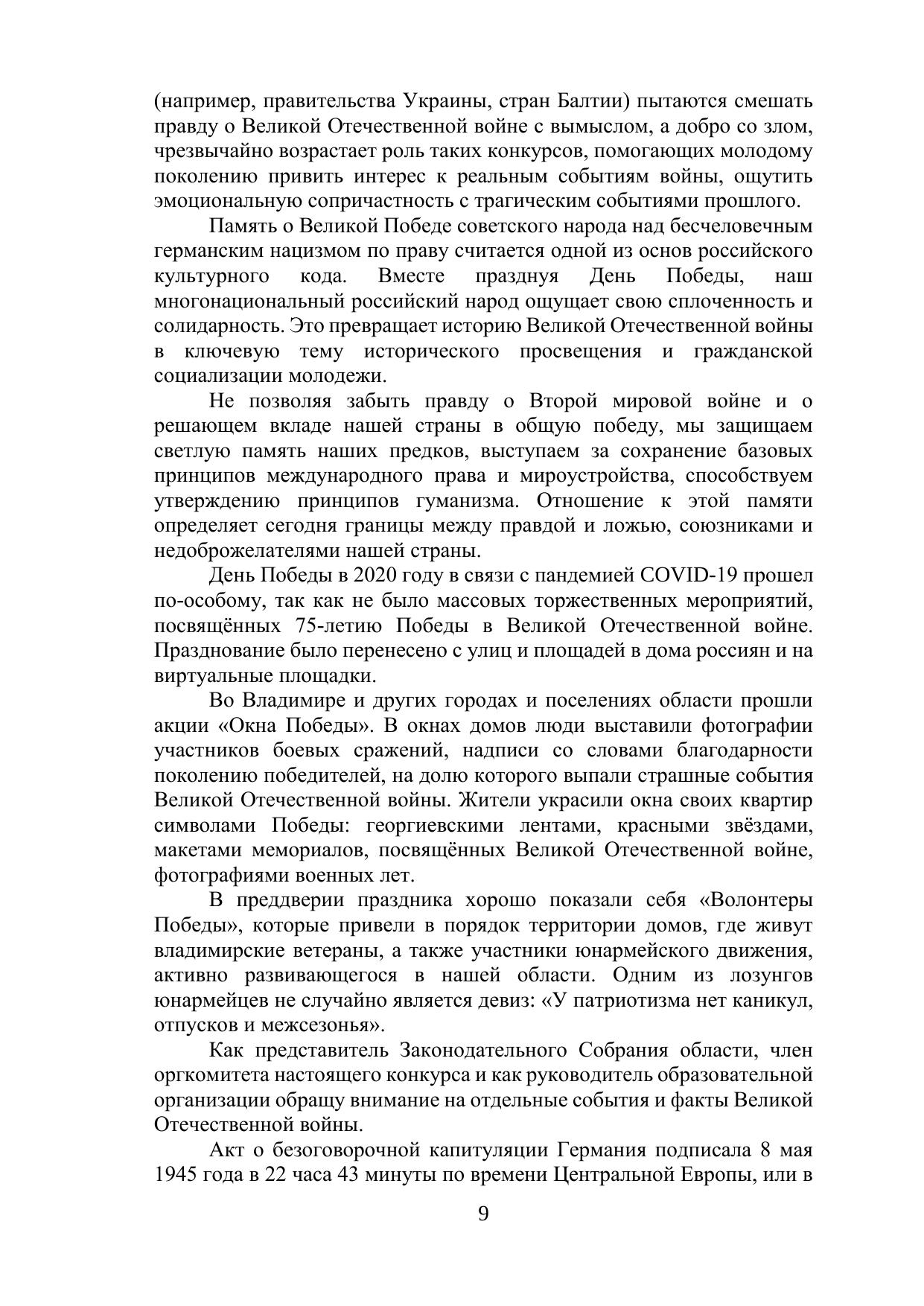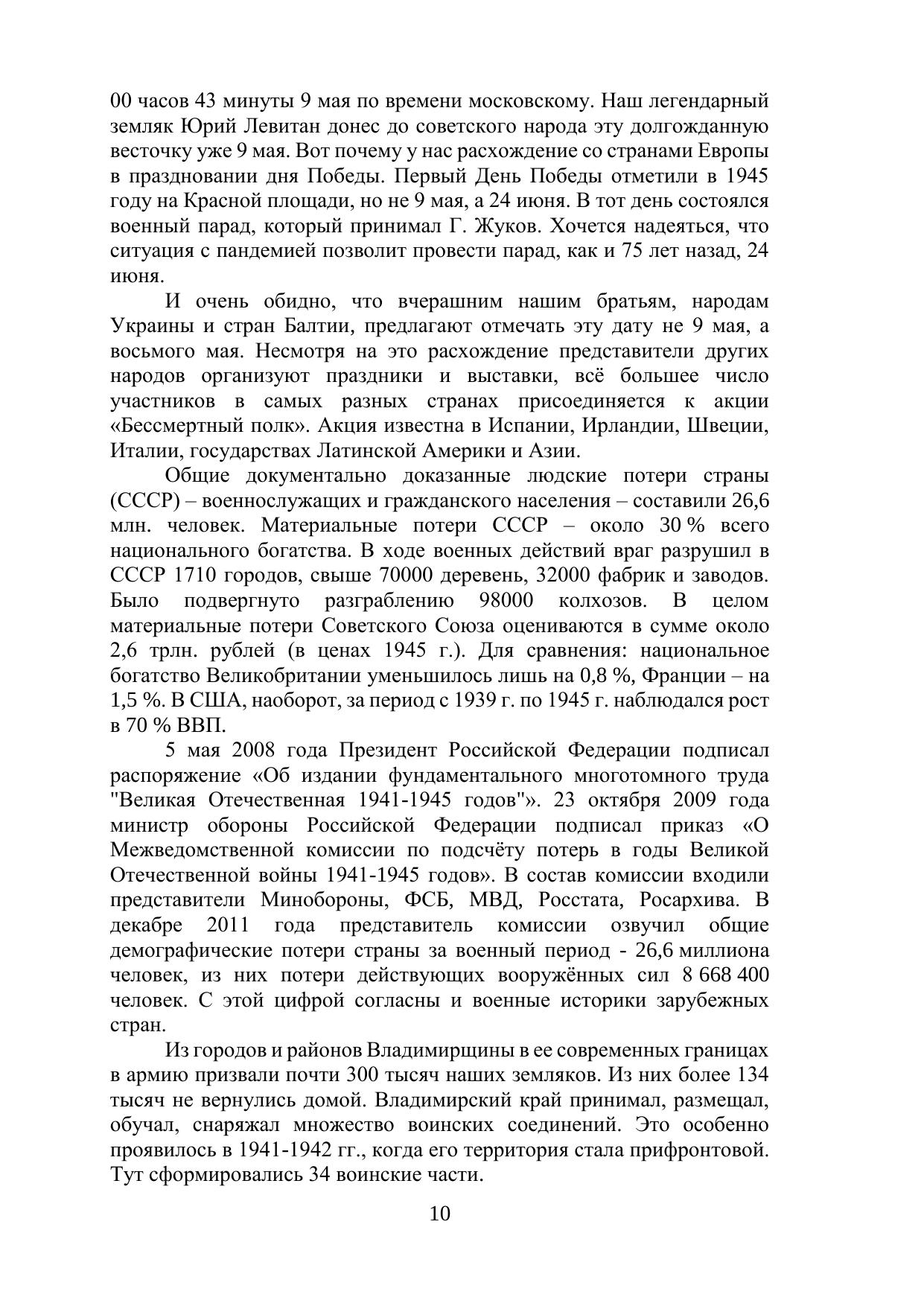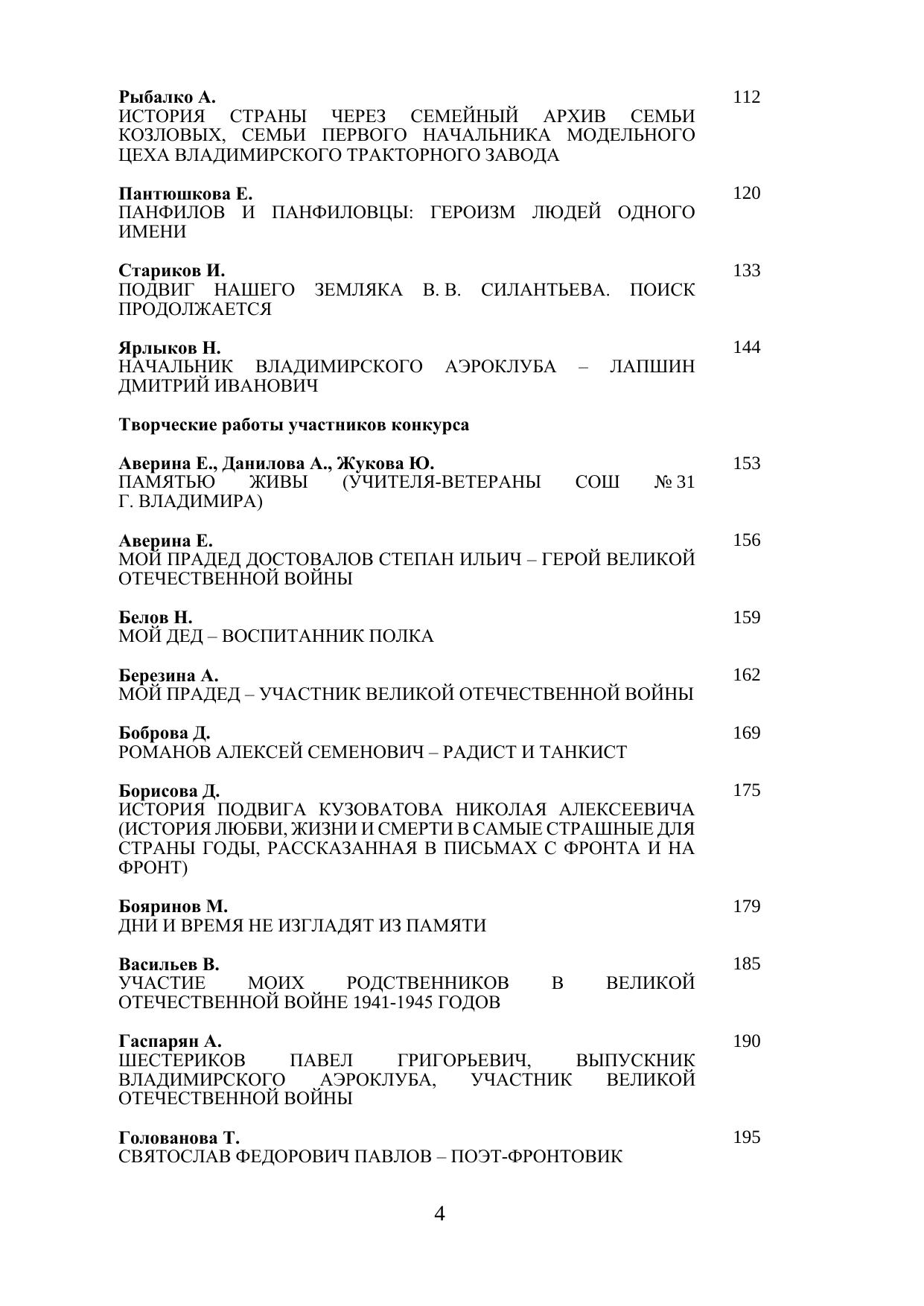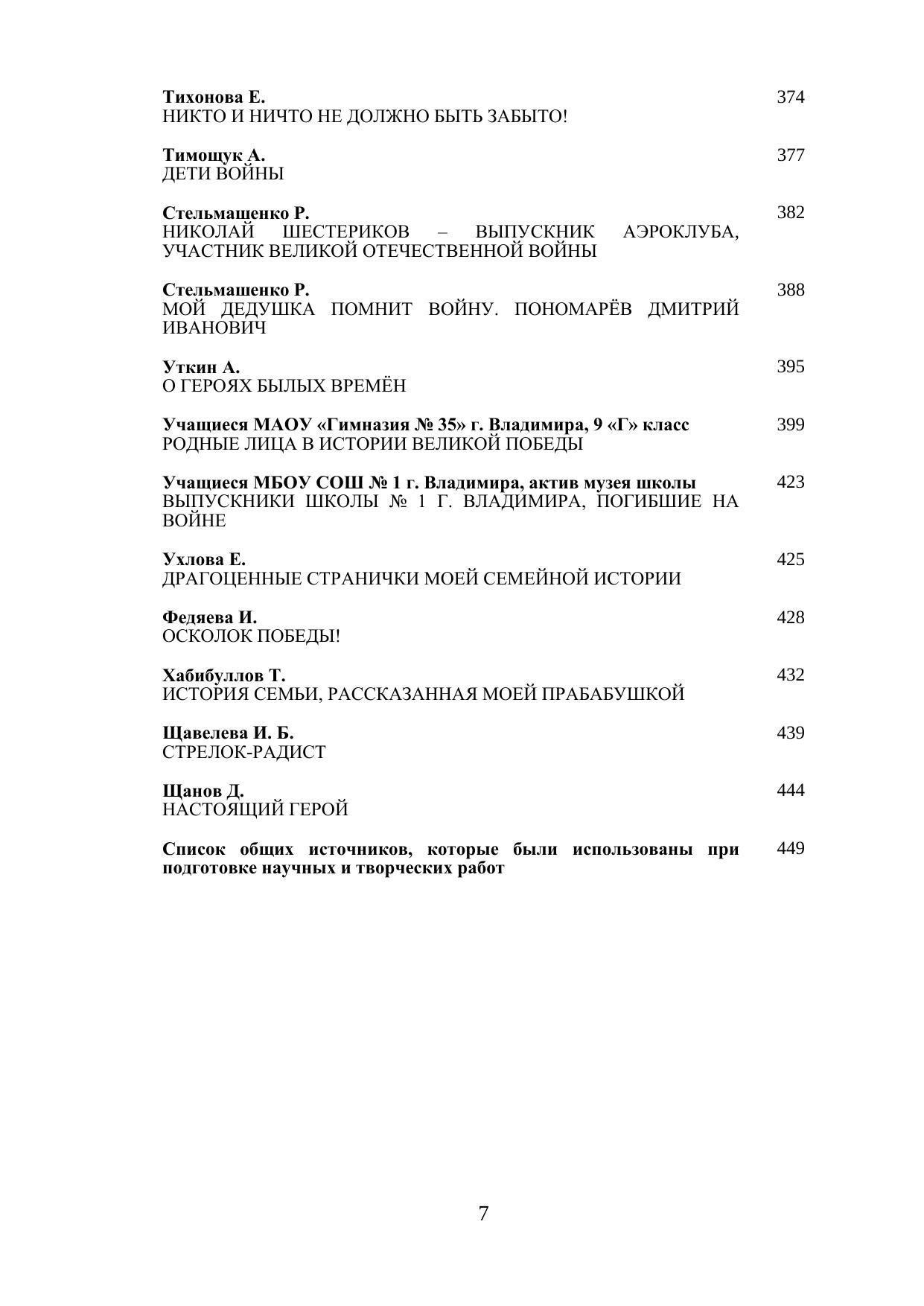 Материалы сборника подготовлены на основе научных исследований, сочинений, рефератов, эссе, творческих работ студентов и учащихся учебных заведений региона, участников областного конкурса, посвященного 75-летию Победы в Великой Отечественной войне. Областной конкурс проходит в рамках областного открытого образовательного проекта «Я – гражданин Российской Федерации! Я – житель Владимирской земли!», организованного ВРОО «Ассоциация выпускников Владимирского филиала Академии народного хозяйства и государственной службы», департаментом образования администрации Владимирской области, Владимирским филиалом РАНХиГС при поддержке Законодательного Собрания Владимирской области, Уполномоченного по правам человека во Владимирской области, Регионального отделения ОНФ, ВРОО «Ассоциация муниципальных образований Владимирской области». Печатается по решению ученого совета Владимирского филиала РАНХиГС.