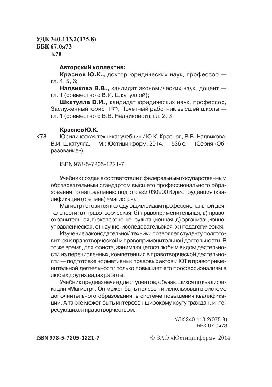 Учебник создан в соответствии с федеральным государственным образовательным стандартом высшего профессионального образования по направлению подготовки 030900 Юриспруденция (квалификация (степень) «магистр»). Магистр готовится к следующим видам профессиональной деятельности: а) правотворческая, б) правоприменительная, в) правоохранительная, г) экспертно-консультационная, д) организационно-управленческая, е) научно-исследовательская, ж) педагогическая. Изучение законодательной техники позволяет студенту подготовиться к правотворческой и правоприменительной деятельности. В то же время, для юриста, занимающегося любым видом деятельности из перечисленных, компетенция в правотворческой деятельности — подготовке нормативных правовых актов и Ют в правоприменительной деятельности только повышает его профессионализм в любых других видах работы. Учебник предназначен для студентов, обучающихся по квалификации «Магистр». он может быть полезен и использован в системе дополнительного образования, в системе повышения квалификации. А также может быть интересен широкому кругу граждан, интересующихся правотворчеством